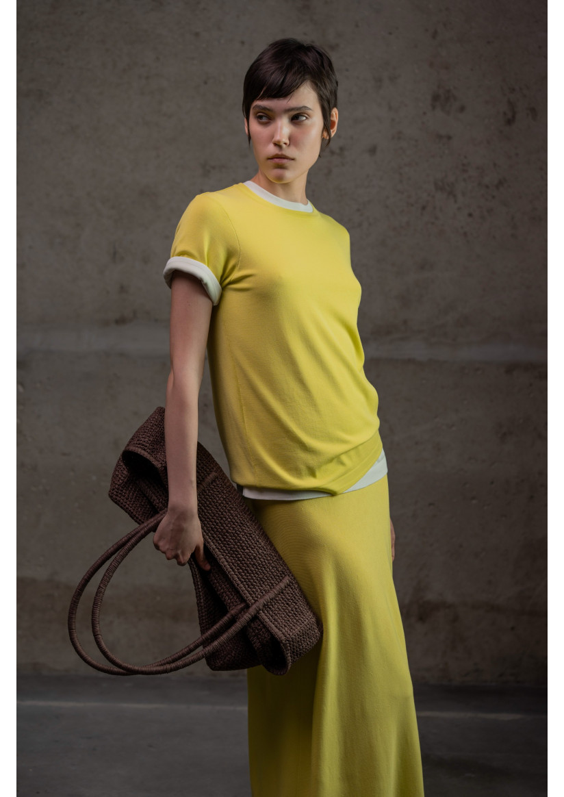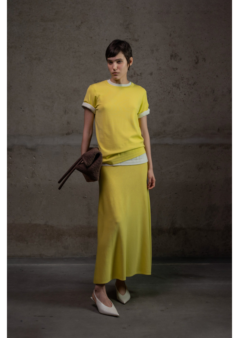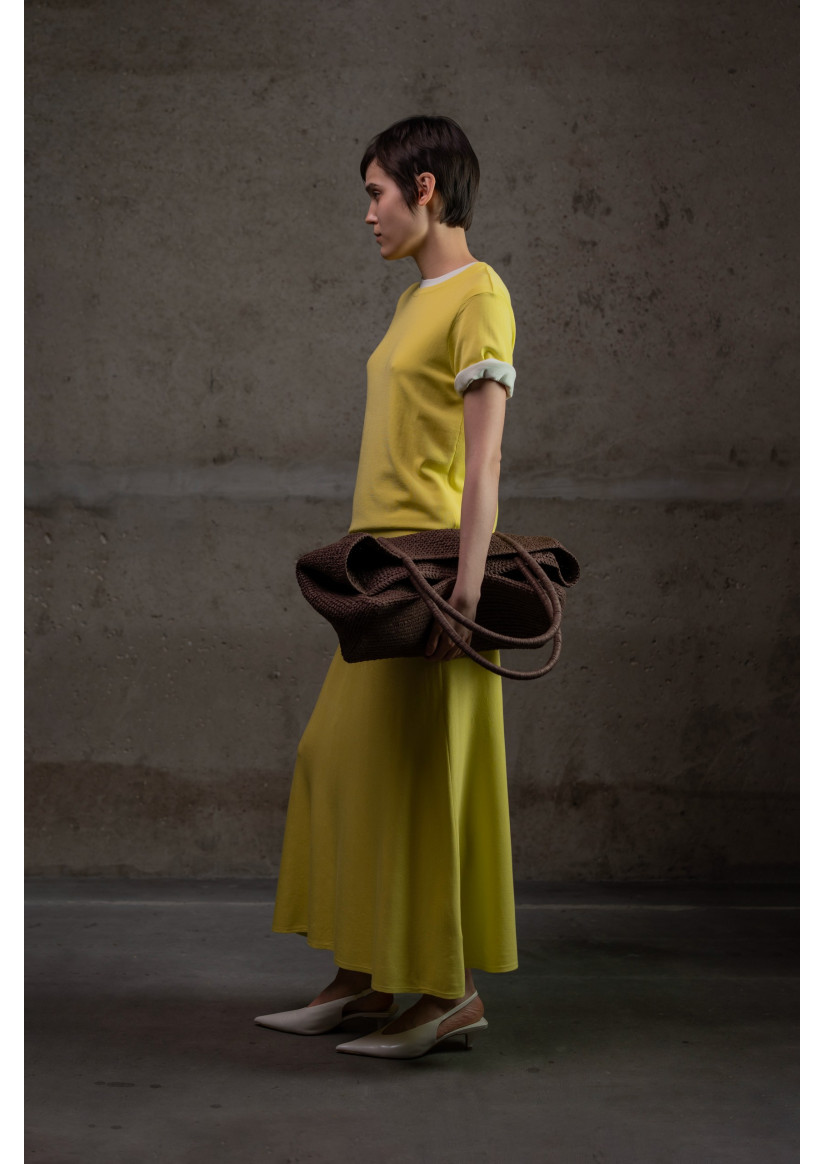 Максіспідниця А-силуету з віскозної пряжі. Модель має високий пояс із еластичним фіксатором без застібок та довжину максі, що створює витончений і жіночний силует. Виготовлена з віскозної пряжі у гладкому переплетенні, що забезпечує м’якість, легкість і природний драпірувальний ефект.