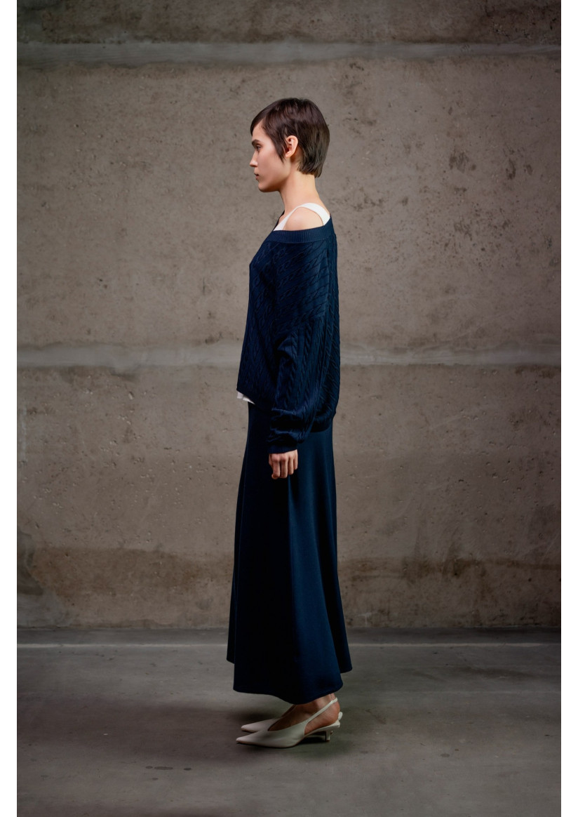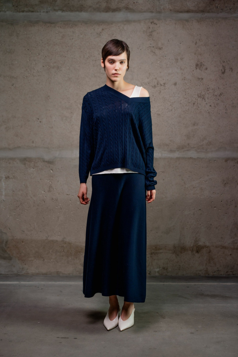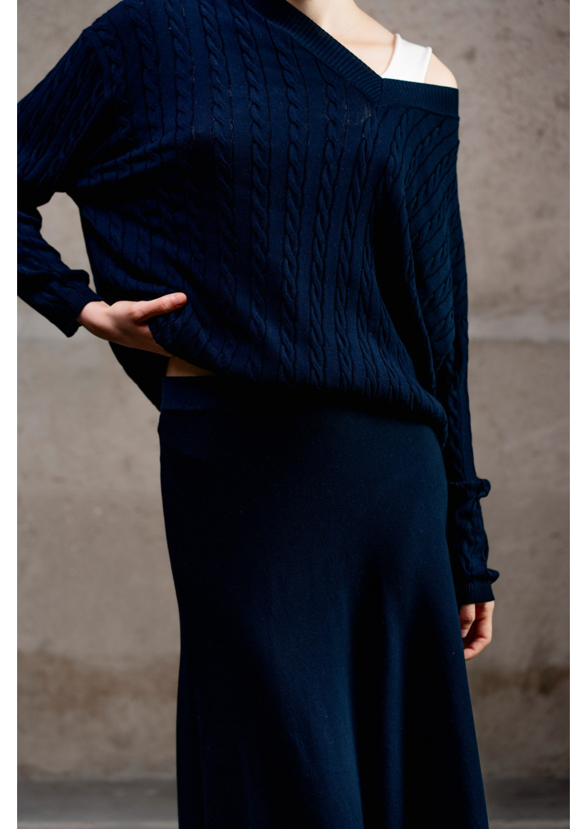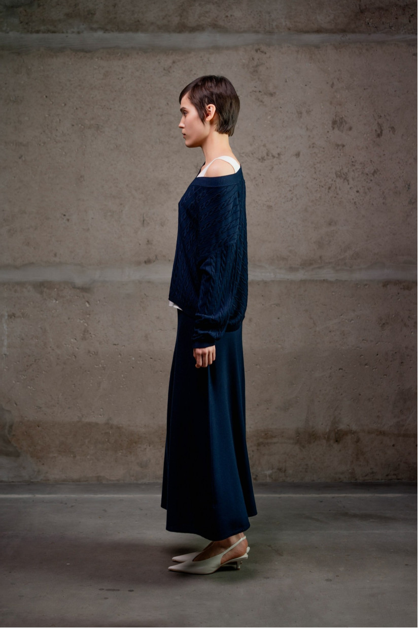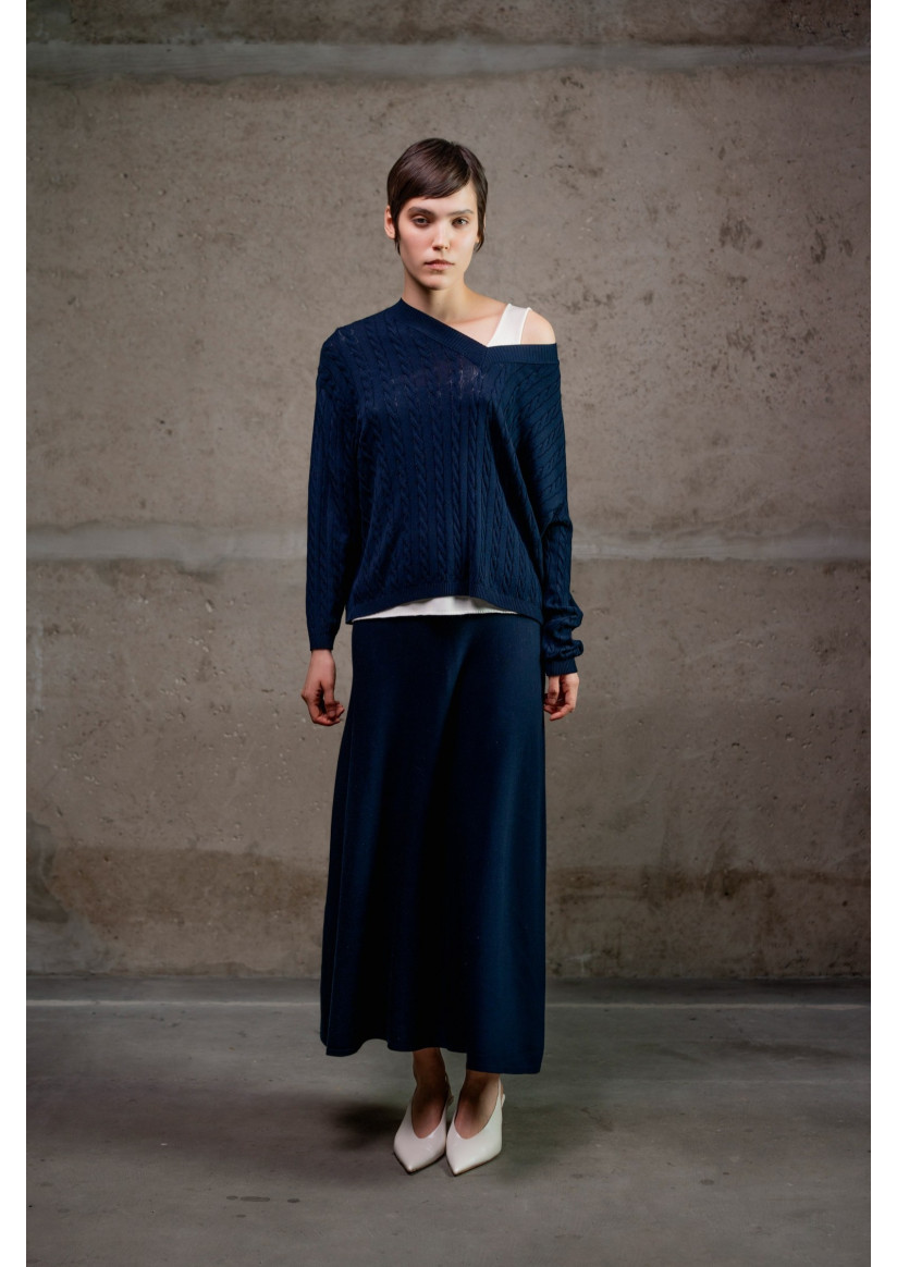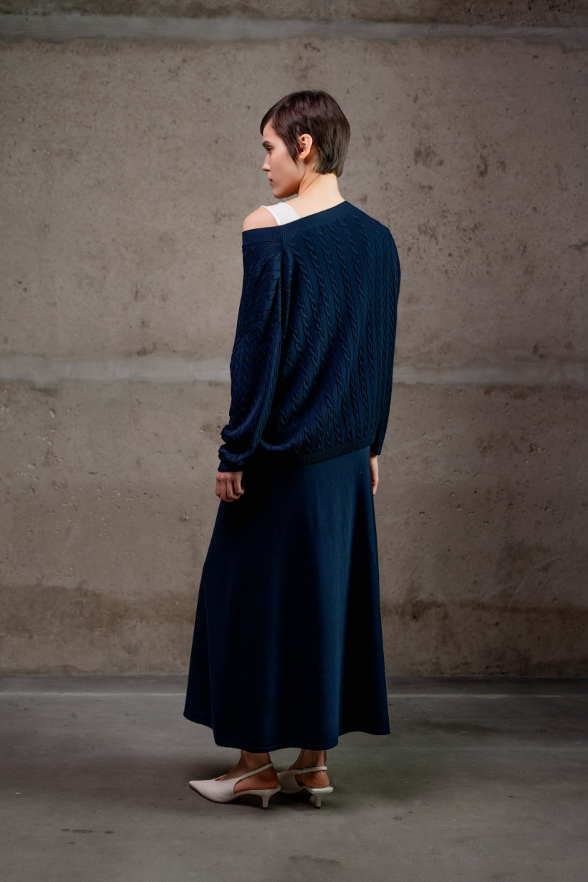 Максіспідниця А-силуету з віскозної пряжі. Модель має високий пояс із еластичним фіксатором без застібок та довжину максі, що створює витончений і жіночний силует. Виготовлена з віскозної пряжі у гладкому переплетенні, що забезпечує м’якість, легкість і природний драпірувальний ефект.