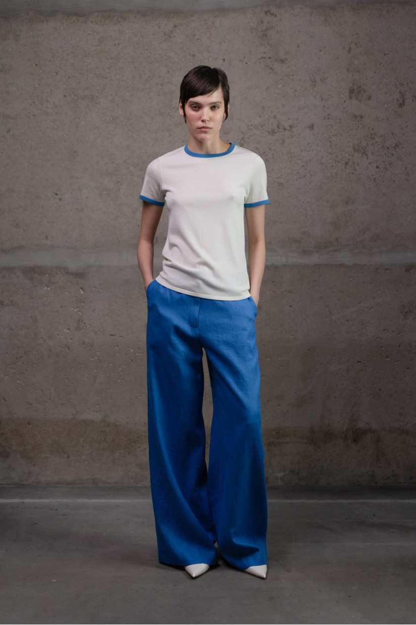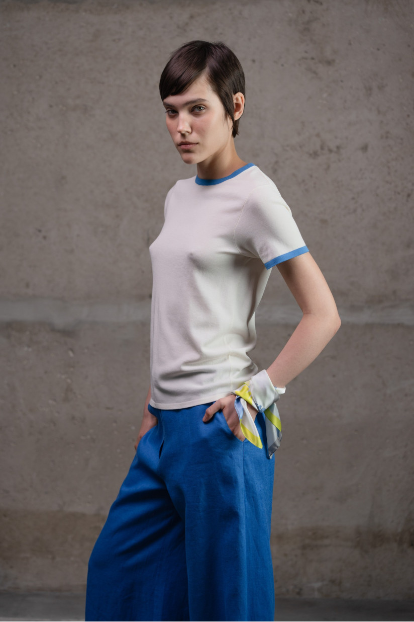 Класичний базовий джемпер з круглою горловиною та коротким рукавом у прямому, напівприлеглому (slim fit) силуеті — універсальний елемент гардеробу з сучасним акцентом. Модель із круглим вирізом горловини, оздобленим тонкою бейкою, коротким рукавом і довжиною до лінії стегон. Горловина, край рукава та низ виробу прикрашені контрастною облямівкою, що надає джемперу стильного графічного вигляду. Виконаний з віскозної пряжі гладкого переплетіння, що забезпечує м’якість та приємну текстуру.
