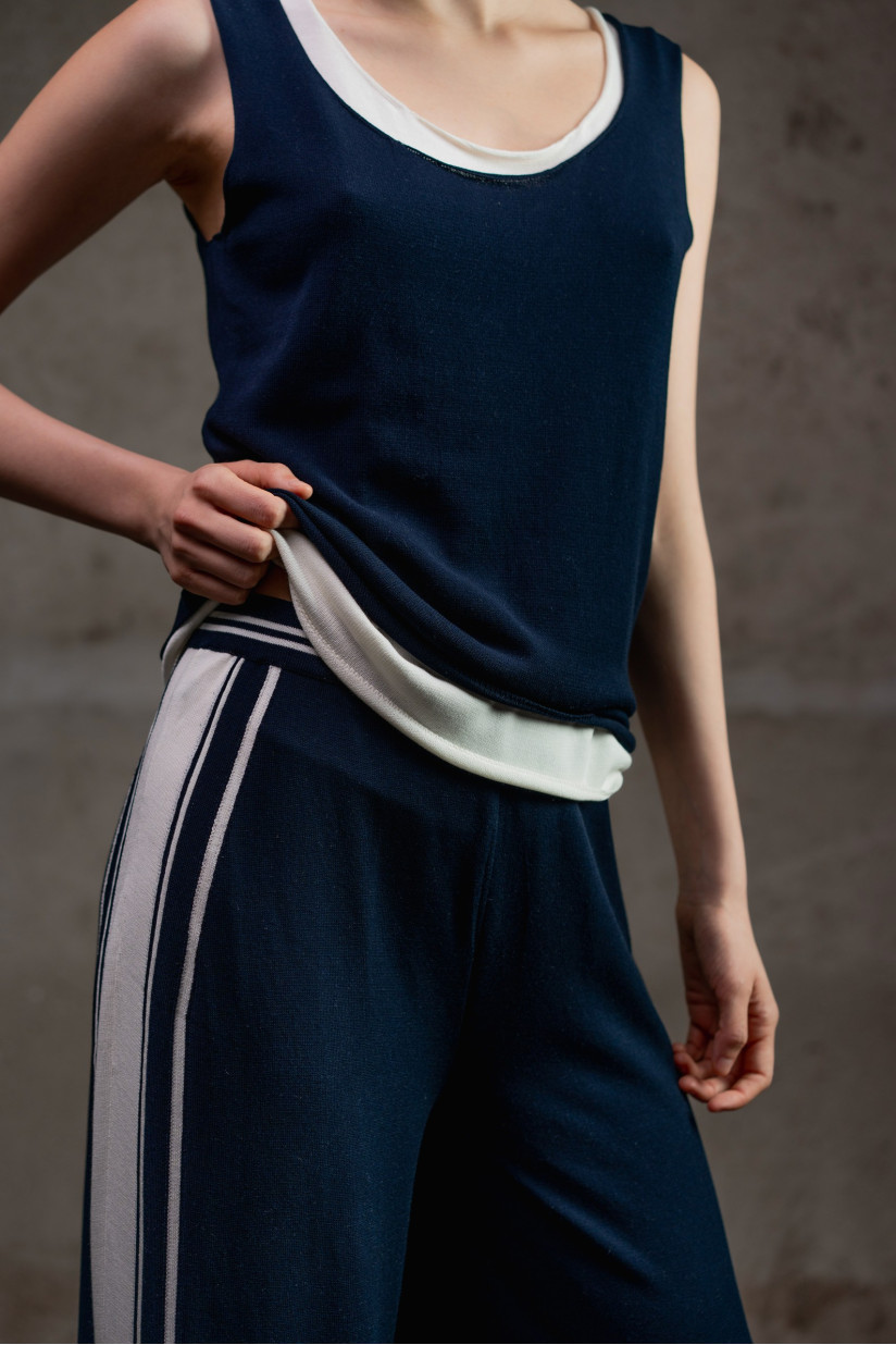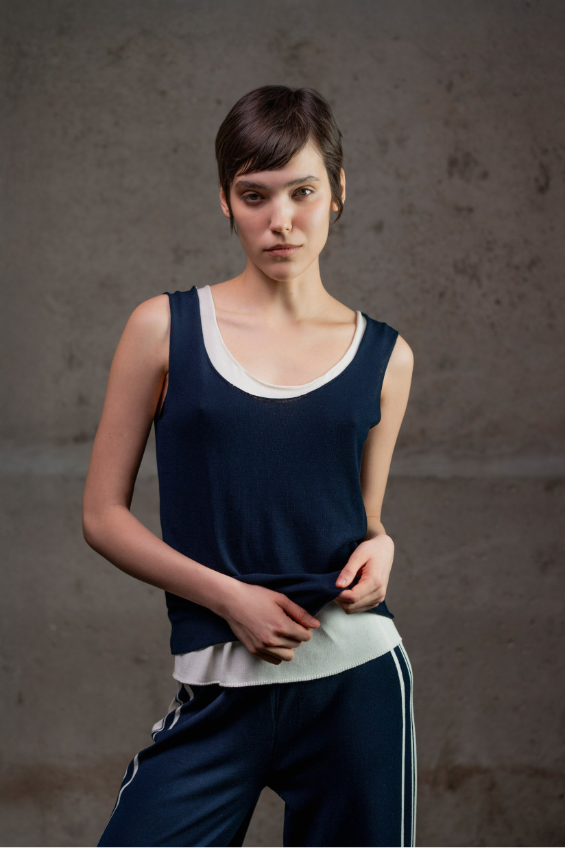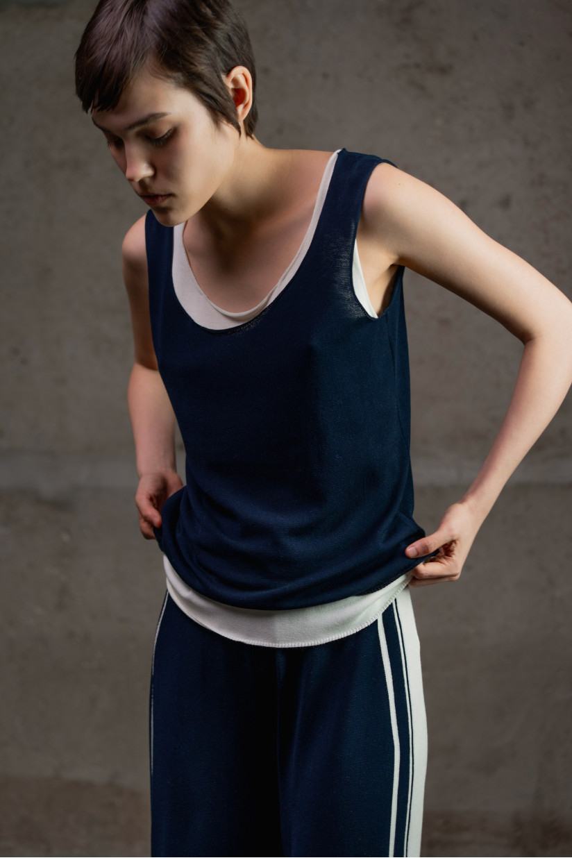Трикотажний базовий топ із віскозної пряжі гладкого переплетення з глибокою округлою горловиною. Прямий силует і довжина до лінії стегон формують лаконічний та універсальний образ. Бретелі середньої ширини забезпечують комфортну посадку. Необроблені краї додають моделі легкої недбалості та сучасного характеру. Модель легко інтегрується в гардероб: її можна носити як самостійний топ або використовувати у багатошарових поєднаннях.