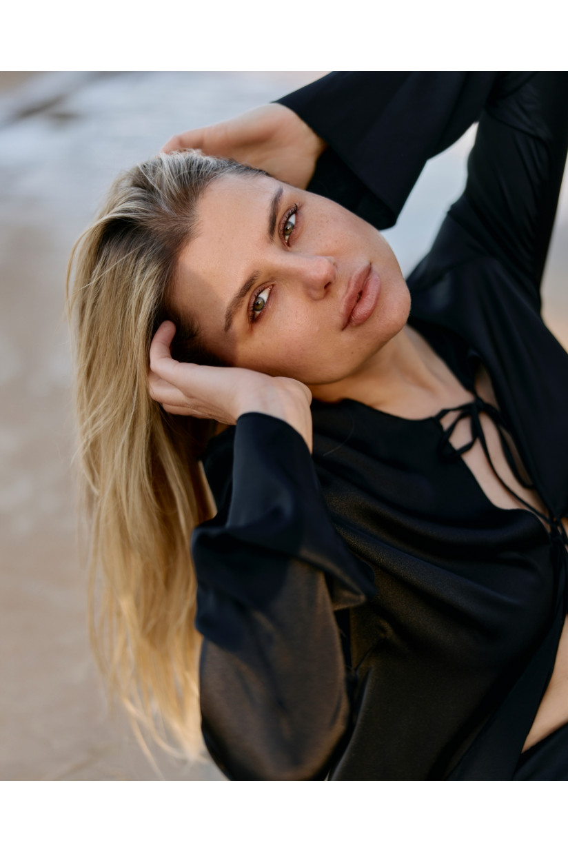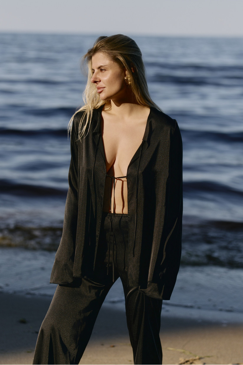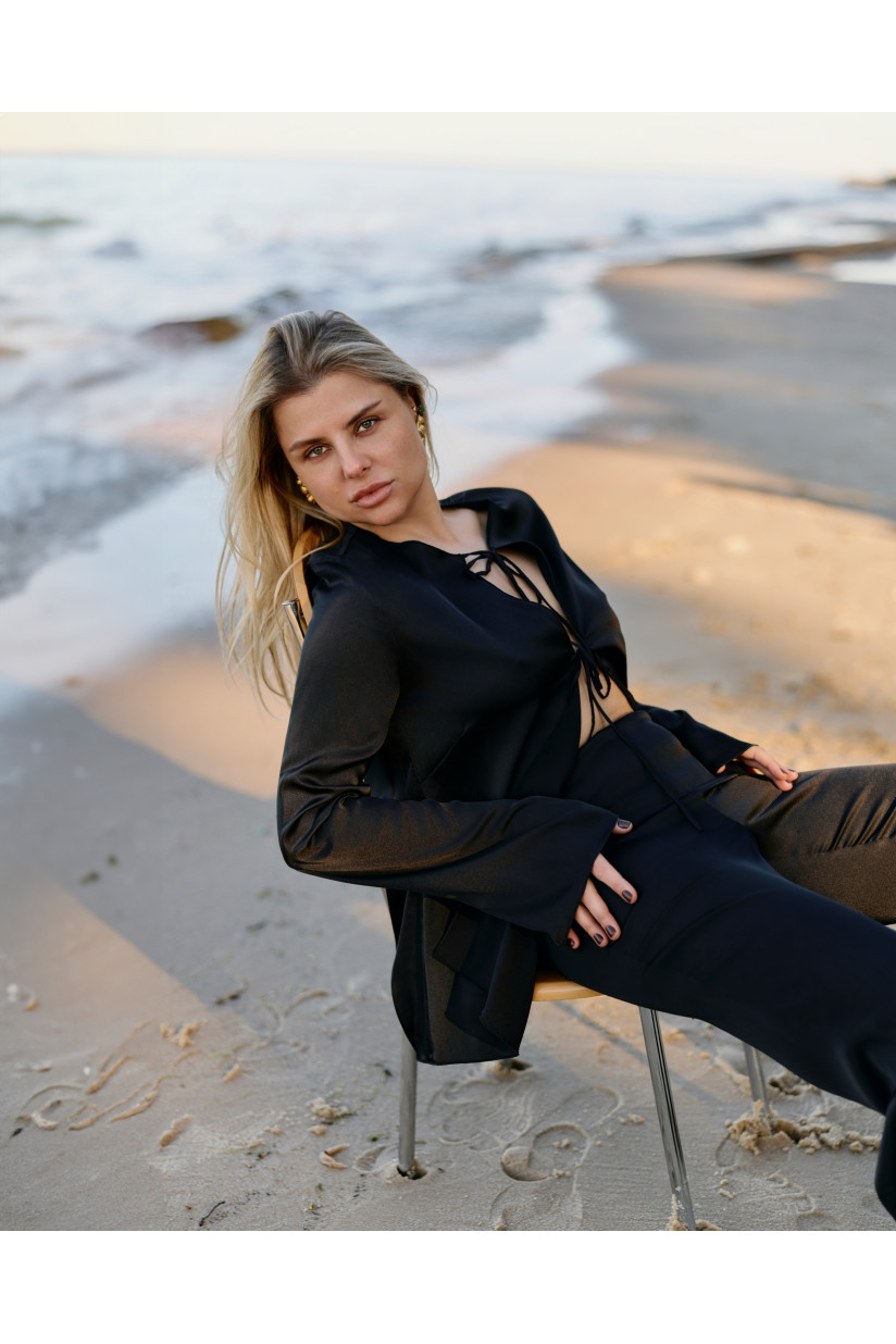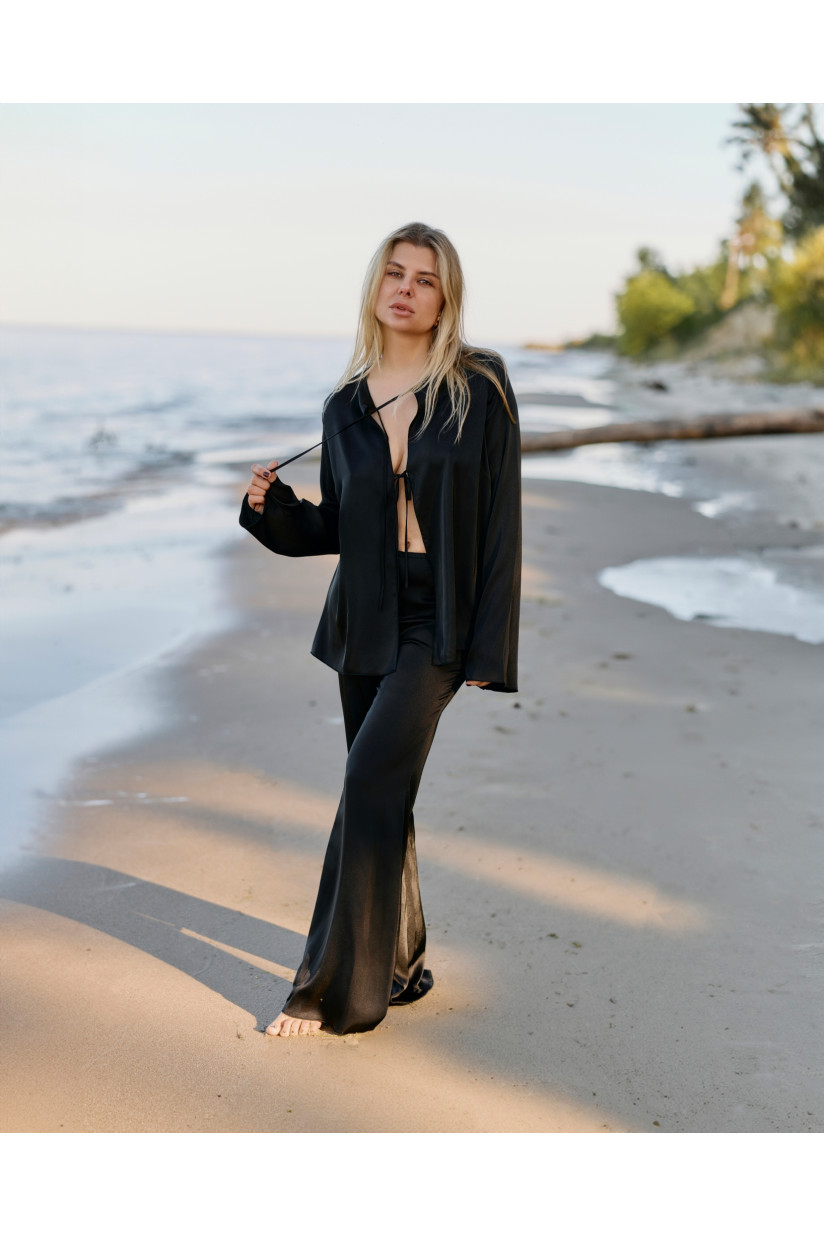 Блуза на догвгий рукав з шовковистої тканини на зав'язках. Поєднуйте її зі штанами з лінійки RITO x LINA з такої ж тканини.