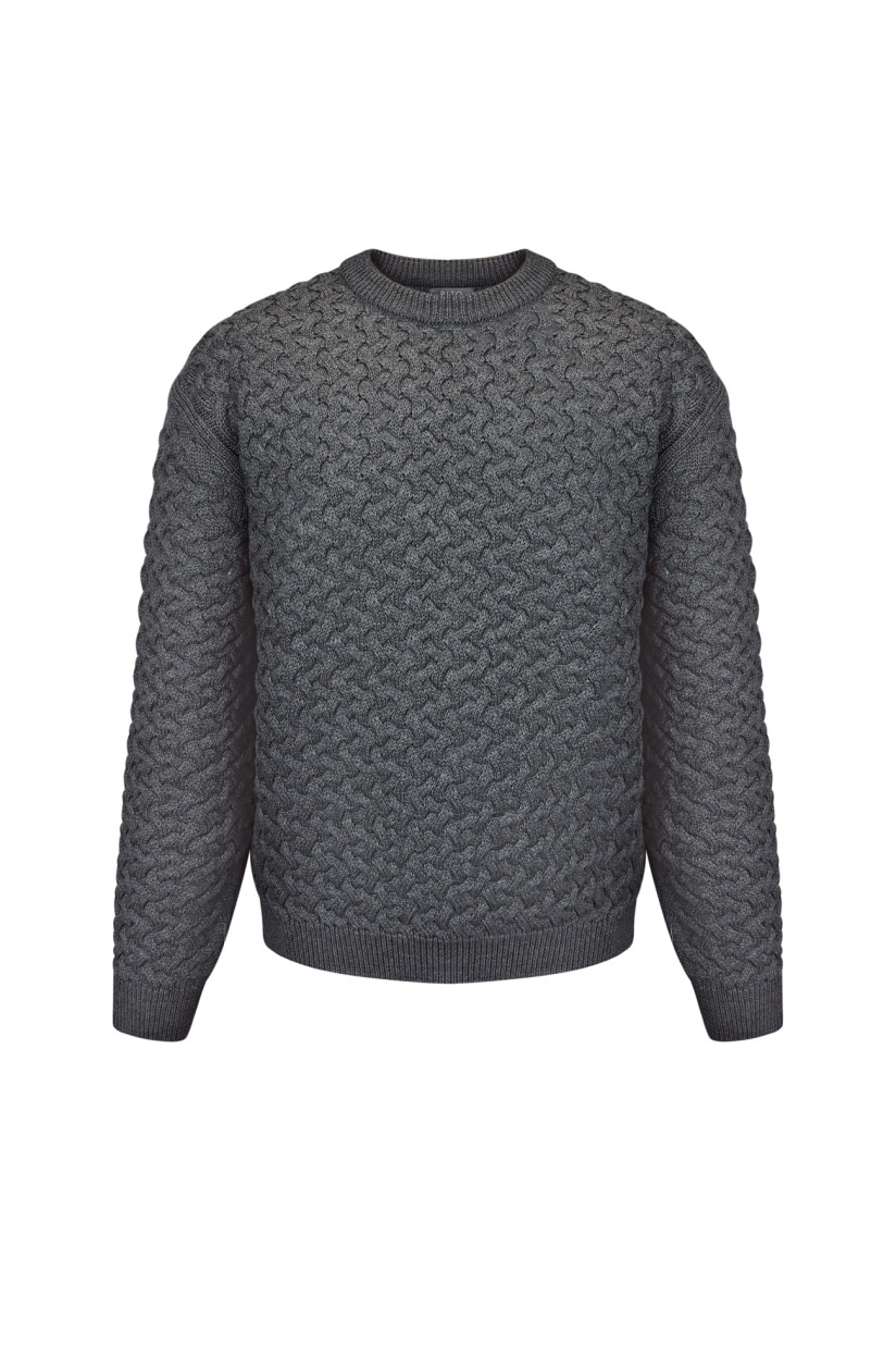 Чоловічий джемпер вільного силуету виготовлений із вовняної пряжі з об’ємним переплетінням «плетінка», натхненним виглядом середньовічних кольчуг. Модель має прямий, комфортний крій, довжину до середини стегна, довгі втачні рукава та класичну круглу горловину. Комір, манжети та низ виробу виконані в еластичному переплетінні «резинка», що забезпечує зручну посадку та збереження форми. Джемпер поєднує в собі виразну фактуру, тепло та сучасний стиль.