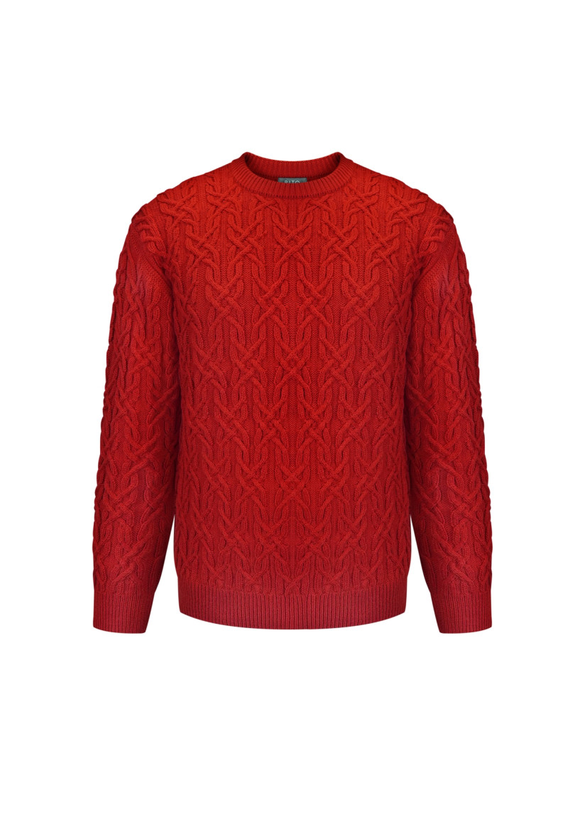Чоловічий светр вільного силуету виконаний із вовняної пряжі з об’ємним фактурним переплетінні у вигляді класичних аранів. Модель має прямий, комфортний крій, довжину до середини стегна, довгі втачні рукава та круглу горловину. Комір, манжети та низ виробу оформлені еластичним переплетінні «резинка», що забезпечує зручну посадку та збереження форми. Светр ідеально поєднує тепло, комфорт і виразний дизайн.