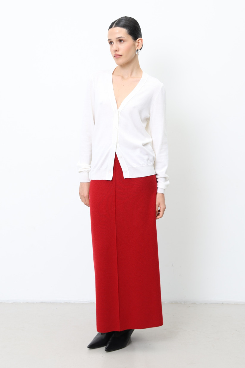Трикотажна максі-спідниця прямого крою з вовни ягнят гладкого щільного переплетіння. Модель оздоблена поясом на еластичній гумці та декоративними центральними швами спереду і ззаду, що завершується високим розрізом на спинці. Елегантний і сучасний силует робить спідницю універсальним вибором для стильних образів.