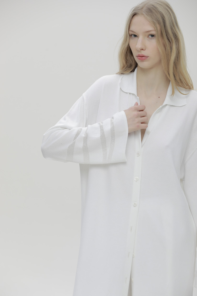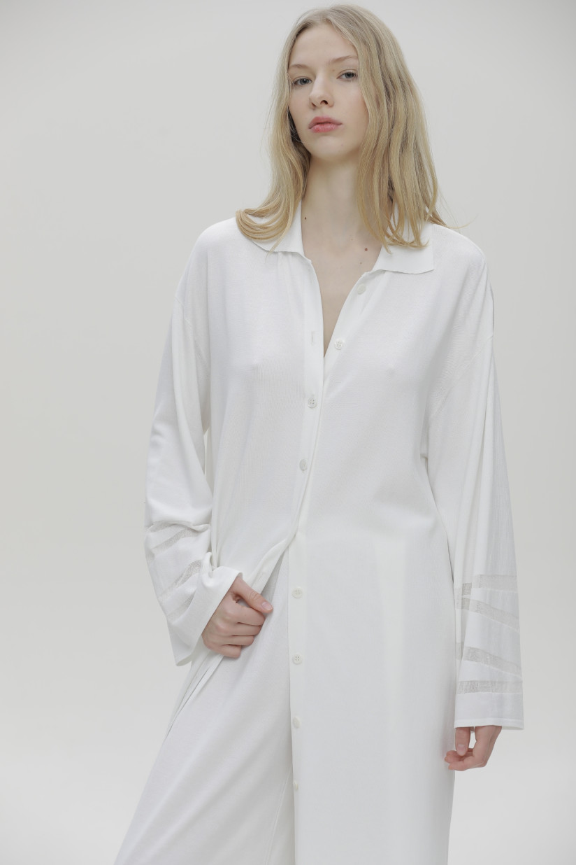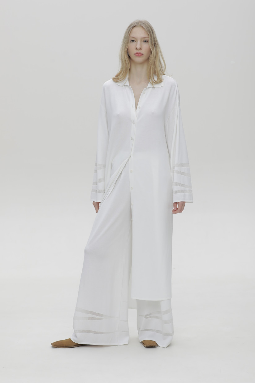 Окрасою довгого кардигану в піжамному стилі зі змішаної віскози стали рукави декоровані напівпрозорими смужками. Носіть як костюм із широкими брюками з цієї ж лінійки та сандалями на товстій підошві.