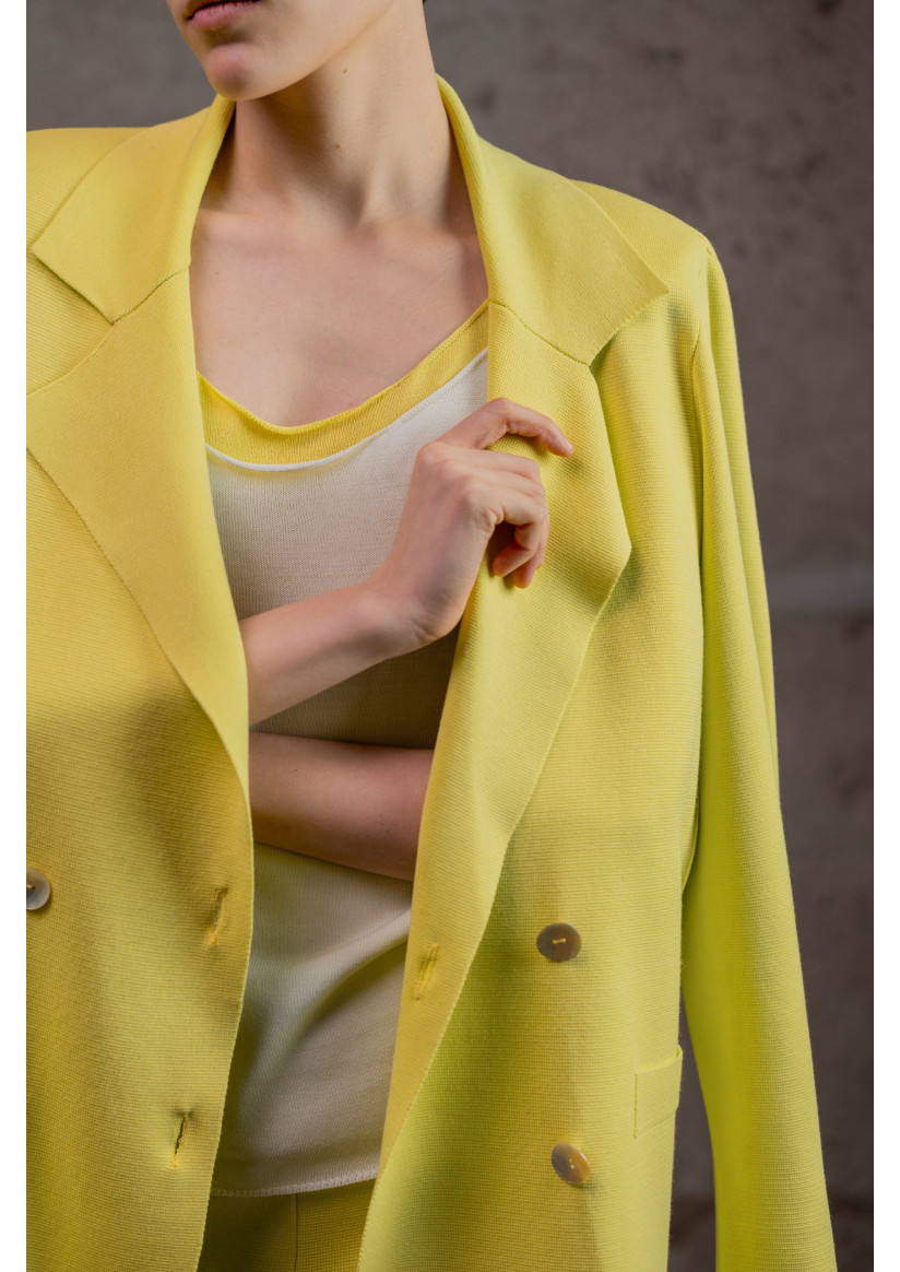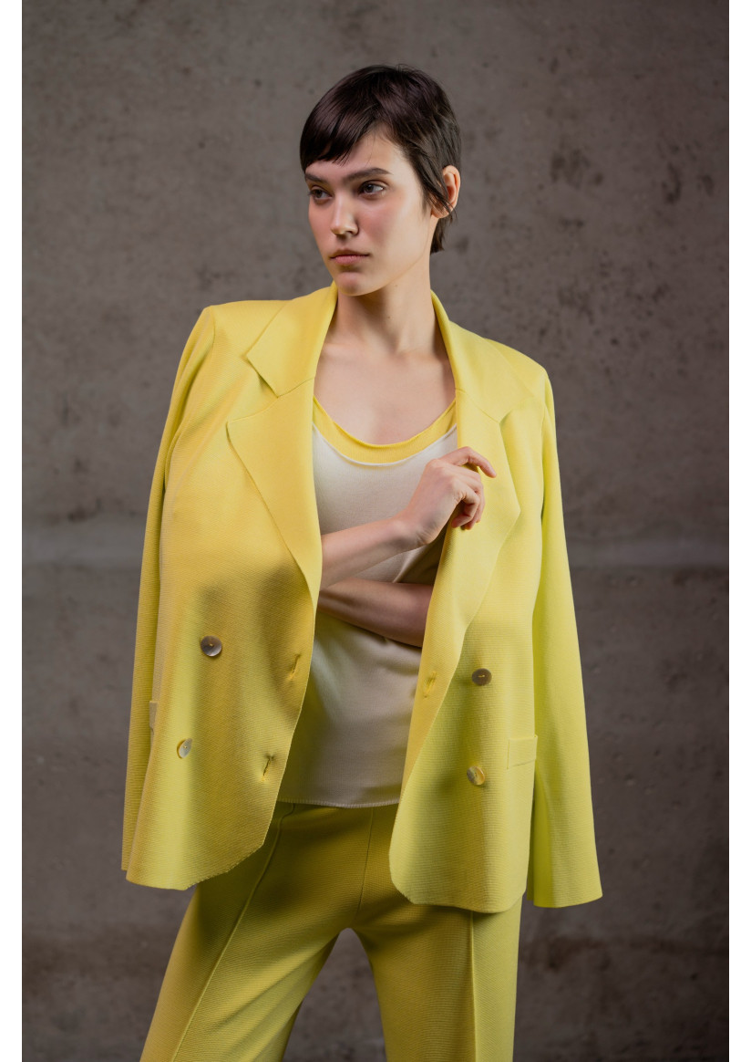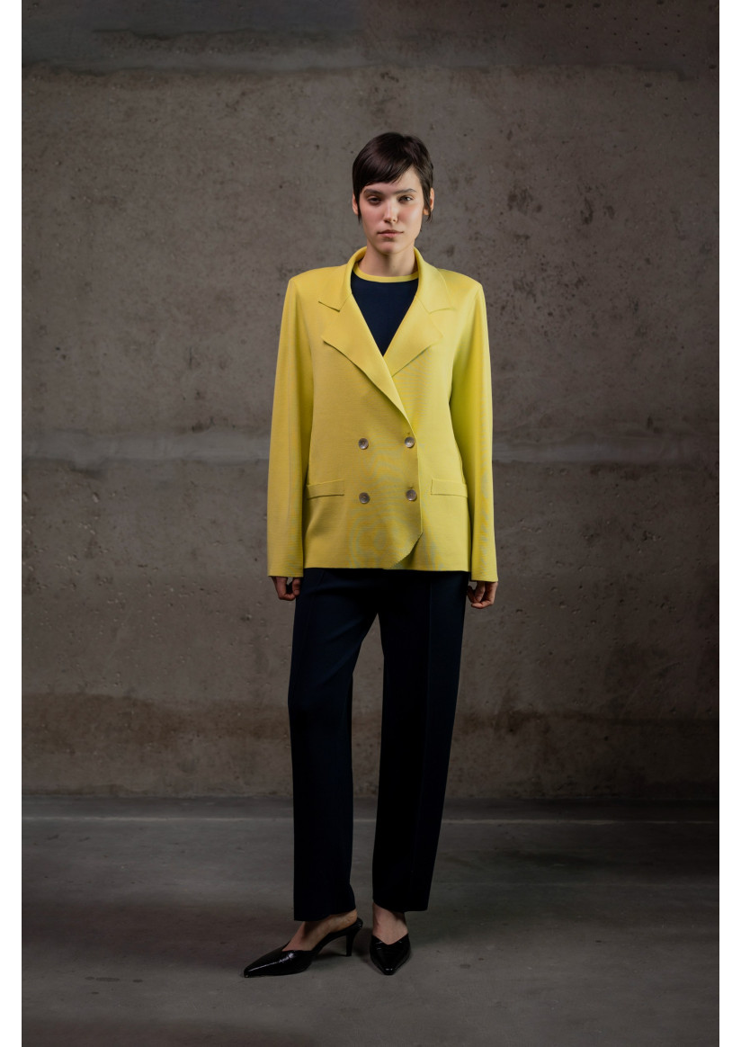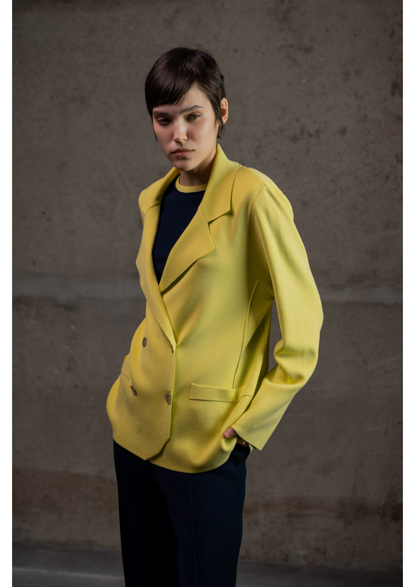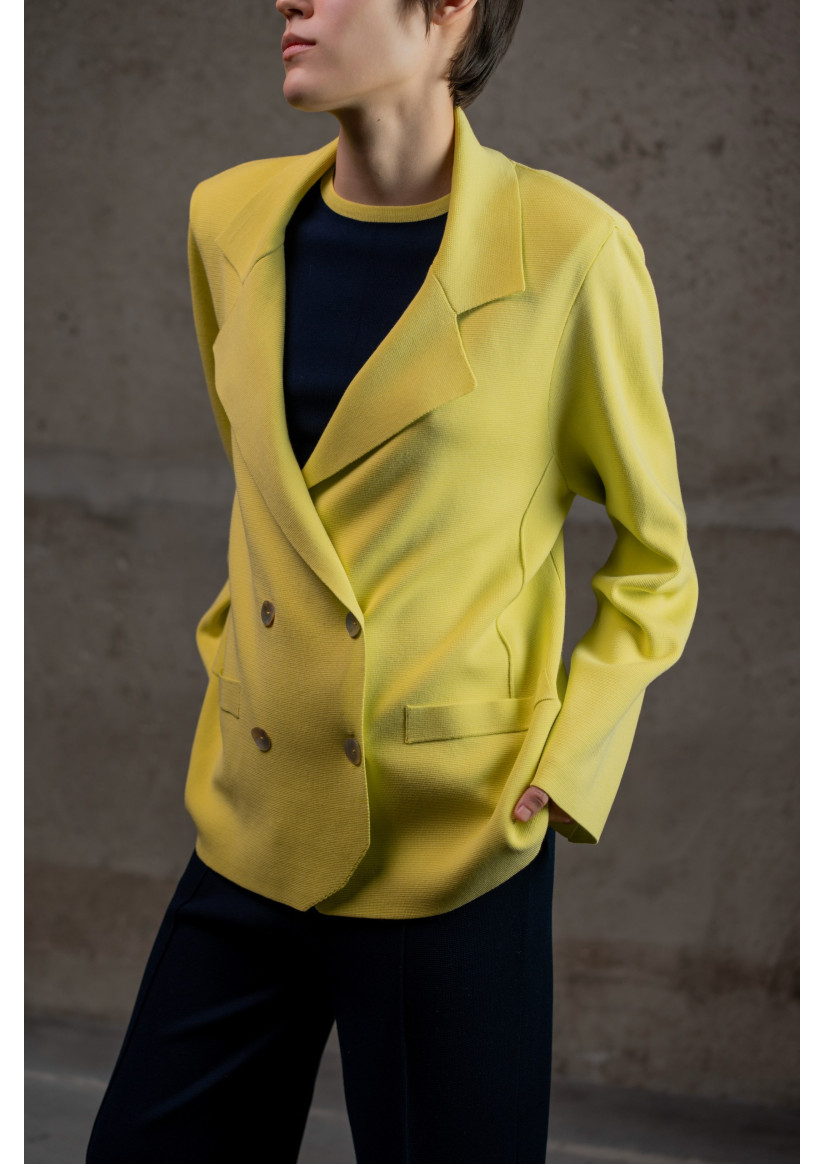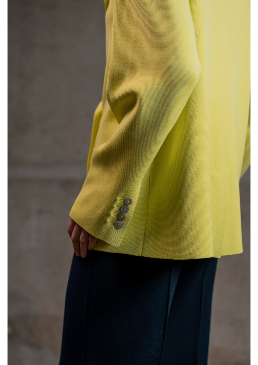Модель зі спущеною лінією плеча, довгим втачним рукавом та класичним англійським коміром із чіткими лацканами. Центральна двобортна застібка на ґудзики підкреслює структурованість, а декоративні фальш-клапани на рівні кишень додають графічної виразності. Піджак виконаний без підкладки, що забезпечує легкість та невимушеність посадки.