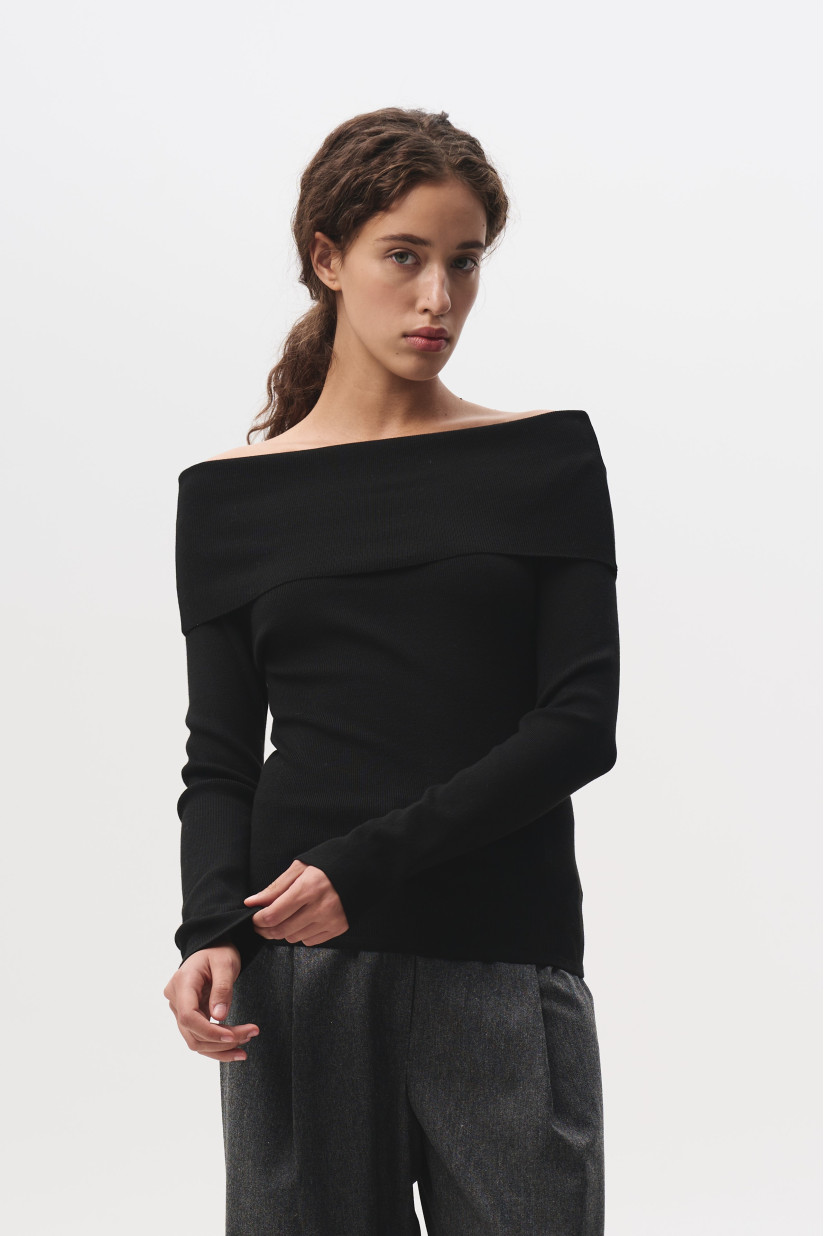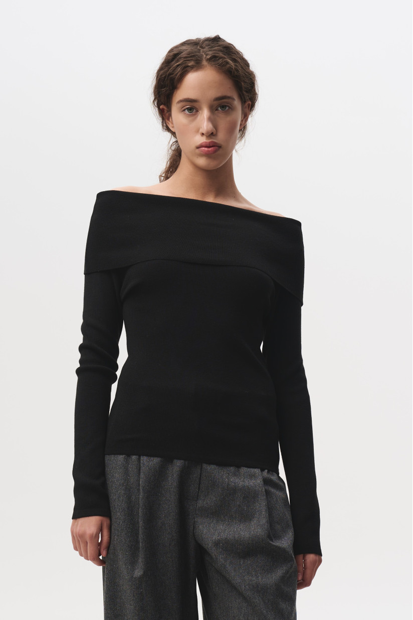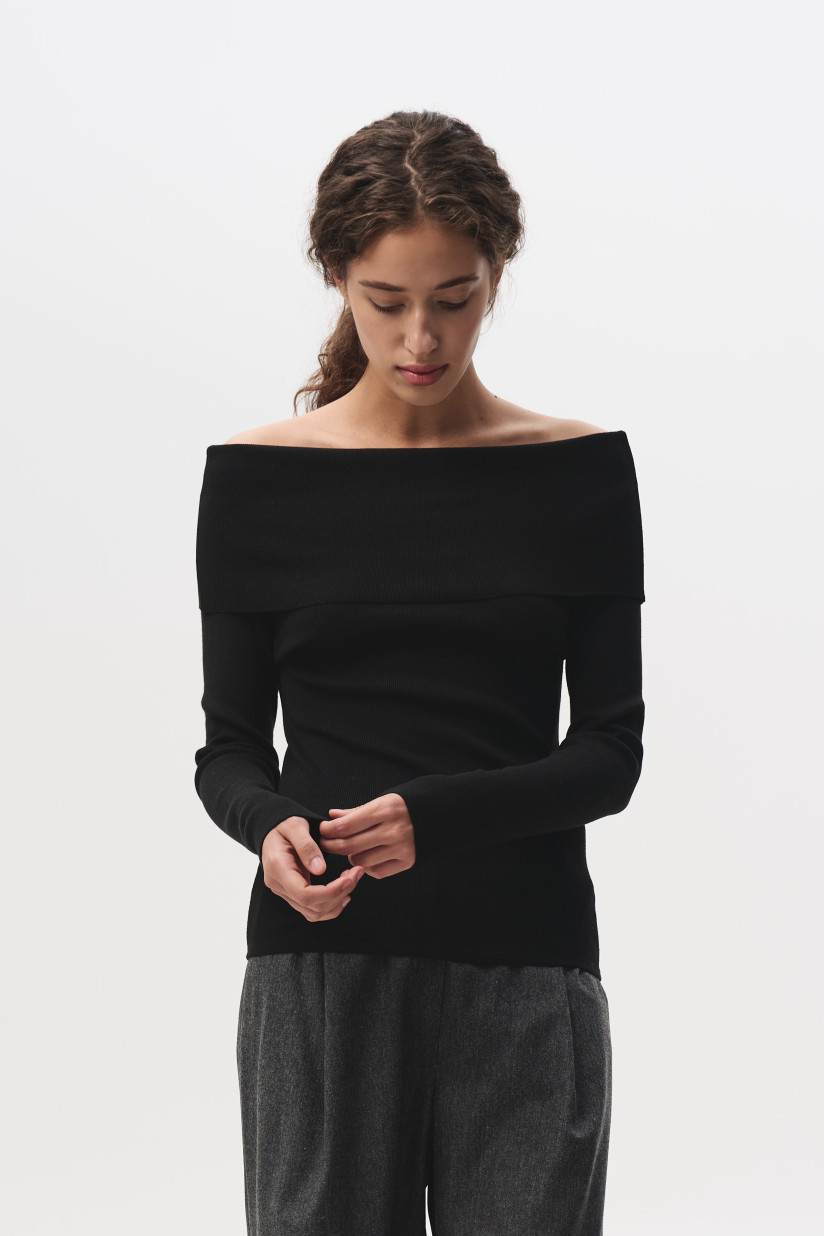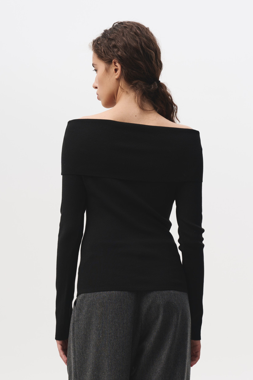 Вишуканий джемпер з відкритими плечима виготовлений з віскози. Широкий манжет на лінії грудей контрастує з облягаючим силуетом і довгими вузикими рукавами.