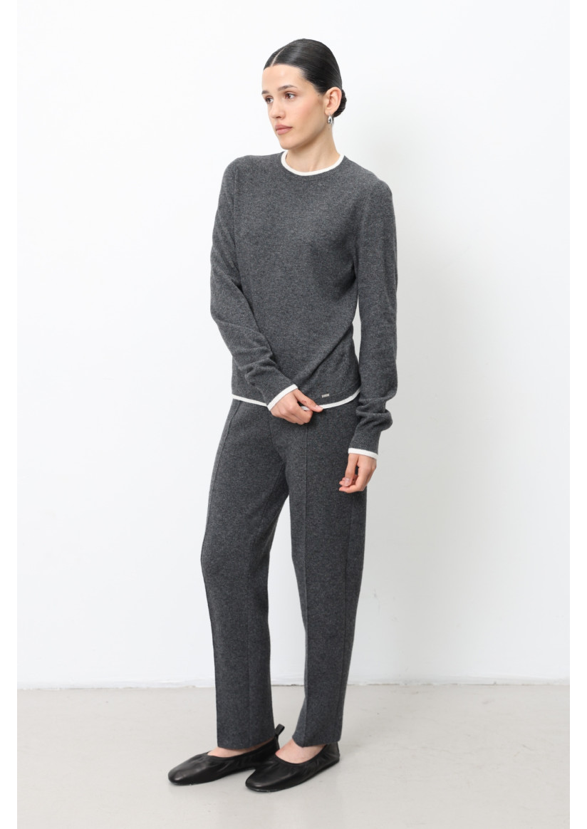 Джемпер із м’якої вовни ягнят у гладкому трикотажному переплетенні. Прямий силует та довжина до лінії стегон. Кругла горловина та довгі втачні рукави. Горловина, манжети й низ виробу оздоблені контрастною бейкою, що створює вишуканий акцент у мінімалістичному дизайні.