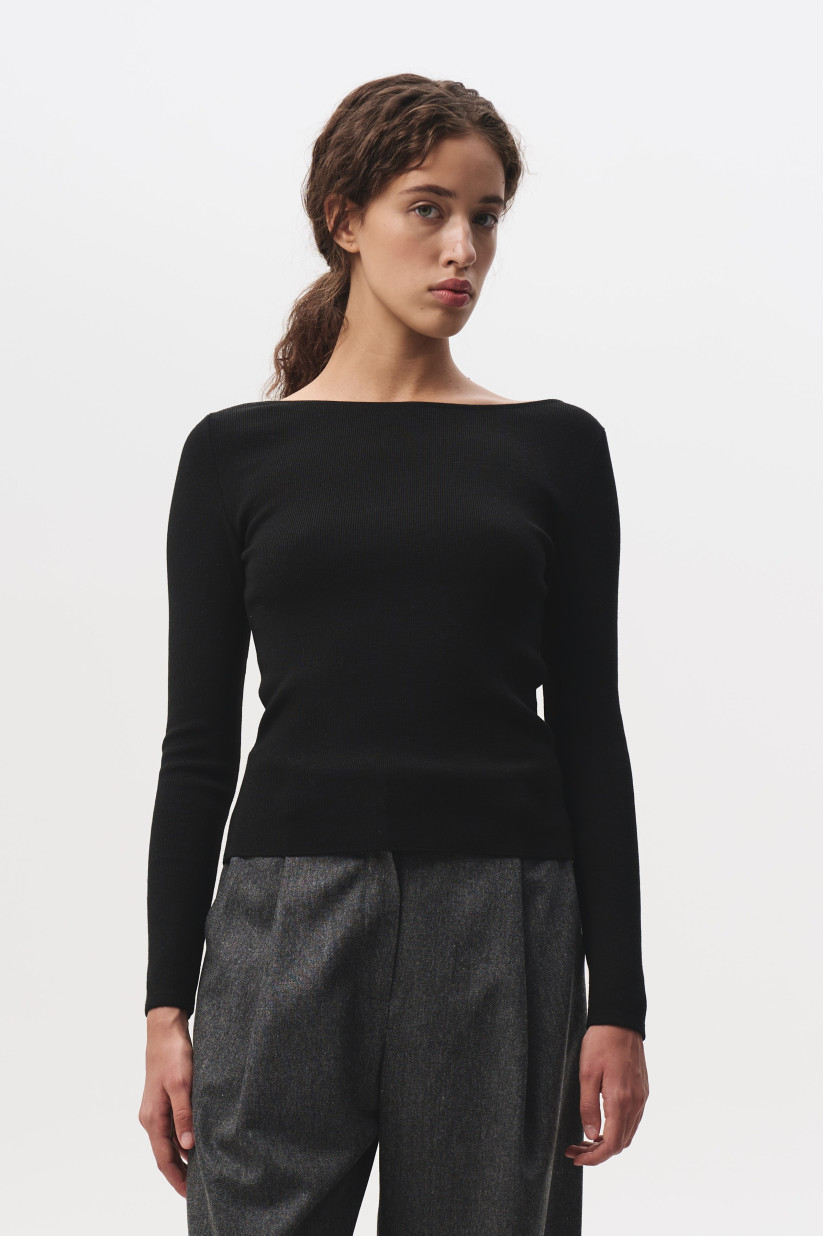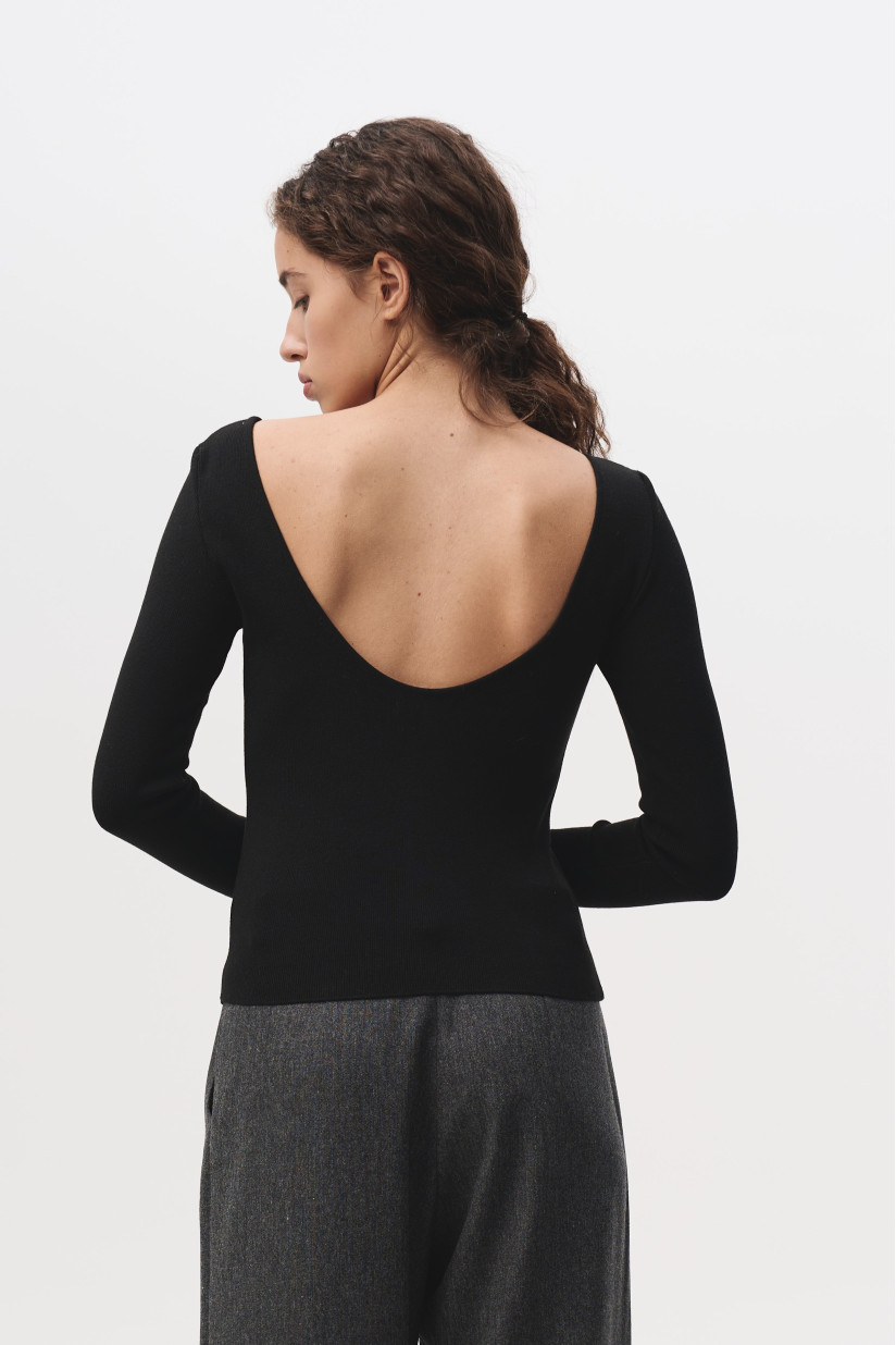 Вишуканий джемпер виготовлений з віскози. Глибокий виріз на спині, підкреслений облягаючим силуетом, контрастує зі стриманим вирізом спереду.
