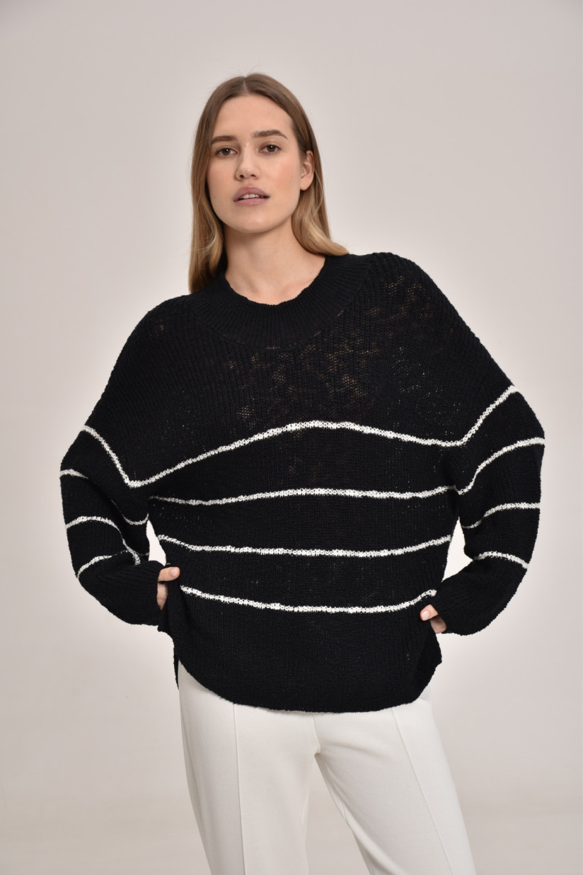 Oversized striped jumper in textured airy knit yarn with a straight silhouette. Decorated with a wide elastic band at the neck. Wear with trousers, a skirt and a cardigan from the same line, or combine with jeans.