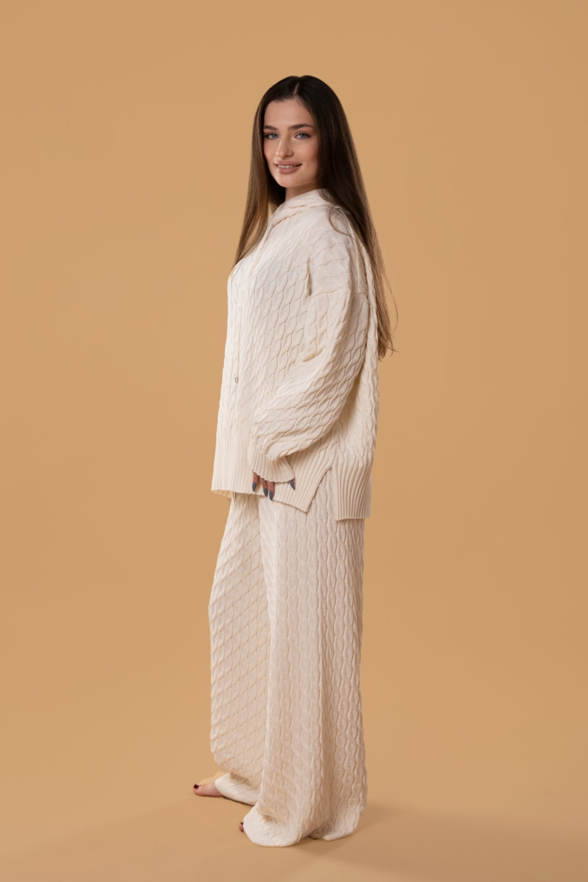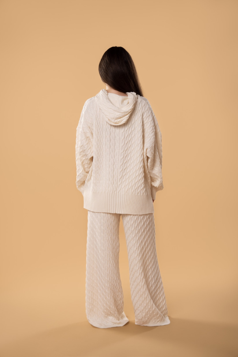 Relaxed-fit trousers developed in collaboration with brabrabra are crafted from a soft wool–acrylic blend, providing all-day comfort. Wool’s natural thermoregulating properties keep you warm in cooler weather and allow the skin to breathe when temperatures rise. The cable-knit pattern visually elongates the silhouette, adding an elegant touch. The design is finished with a wide elastic waistband with drawstrings and a rib-knit hem with a loose edge for unrestricted movement.