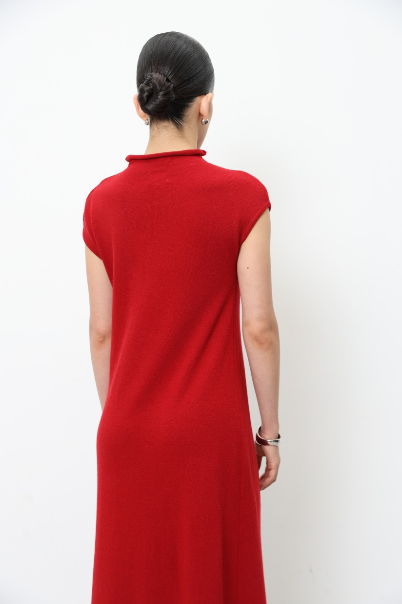 Lambswool maxi dress in smooth knit. Sleeveless design with dropped shoulders and a high stand-up collar. A semi-fitted silhouette flows into a subtle A-line shape, creating an elegant drape. Finished with refined rolled edges at the neckline, armholes, and hem.