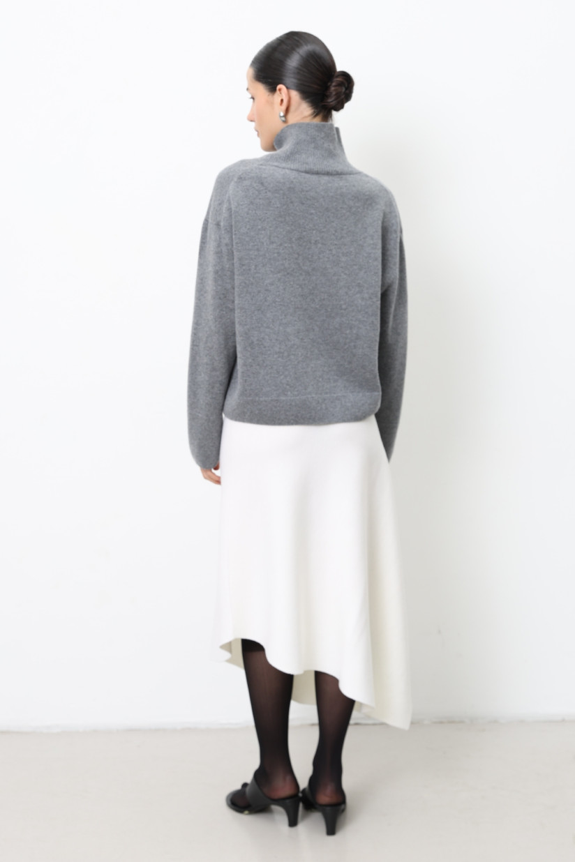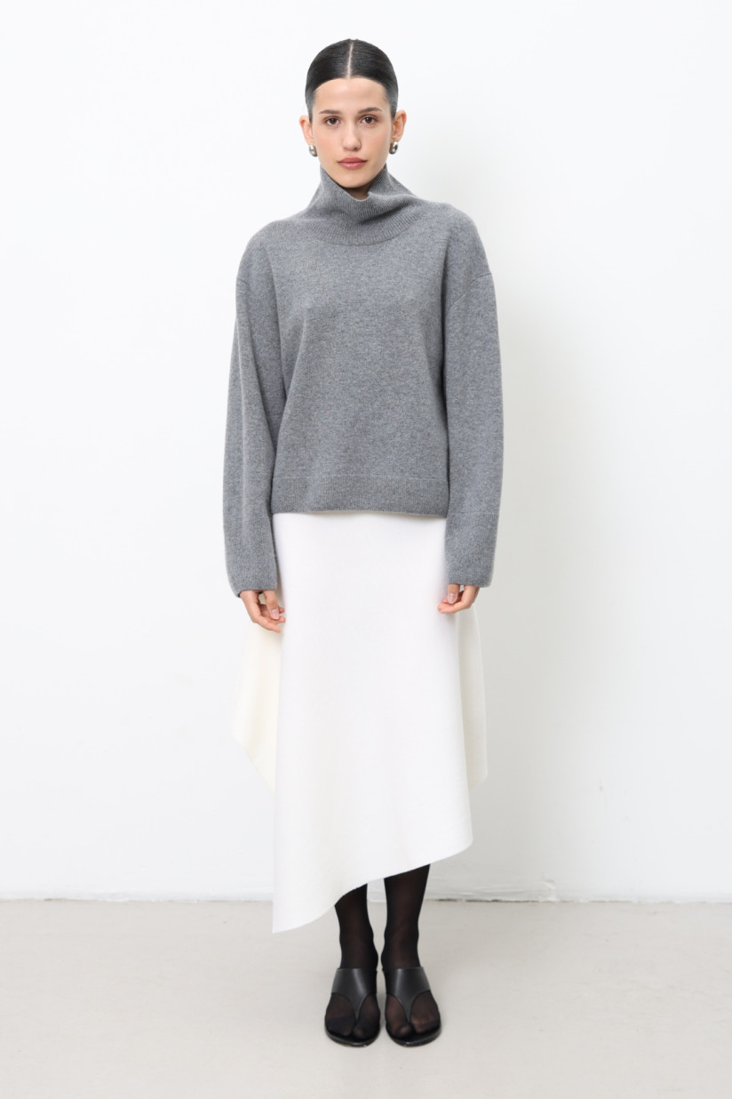 A minimalist, slightly cropped oversized jumper made from lamb’s wool in a soft smooth knit. Designed with a relaxed straight silhouette, stand-up collar, dropped shoulders, and long sleeves. Length to the hip. The collar, cuffs, and hem are finished in ribbed knit, adding refined texture and a polished touch.