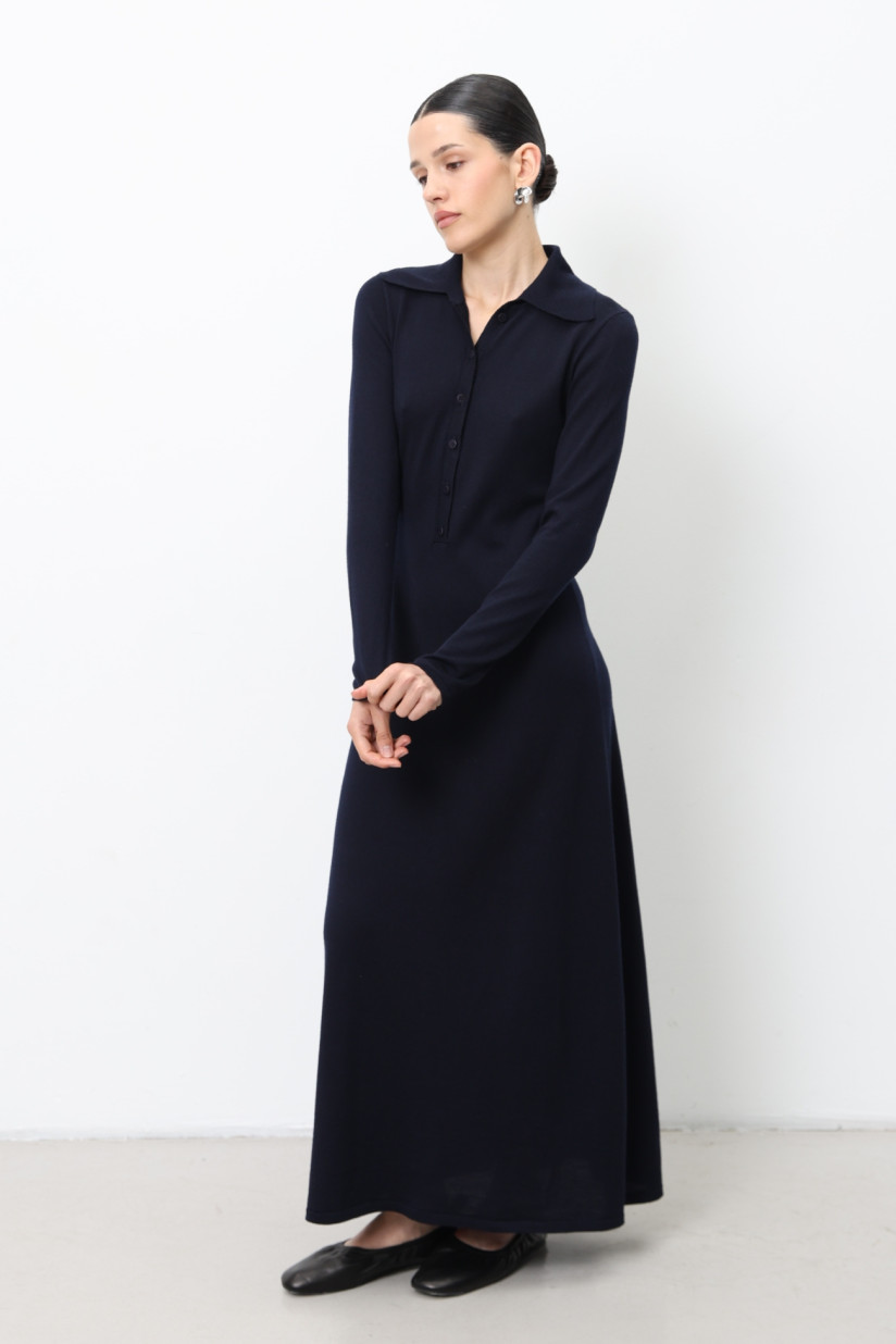 Long dress crafted from 100% merino wool with long set-in sleeves. The neckline features a refined collar with elegant button detailing, adding a sophisticated touch. Semi-fitted at the top, flowing into an A-line silhouette for a graceful and feminine shape.