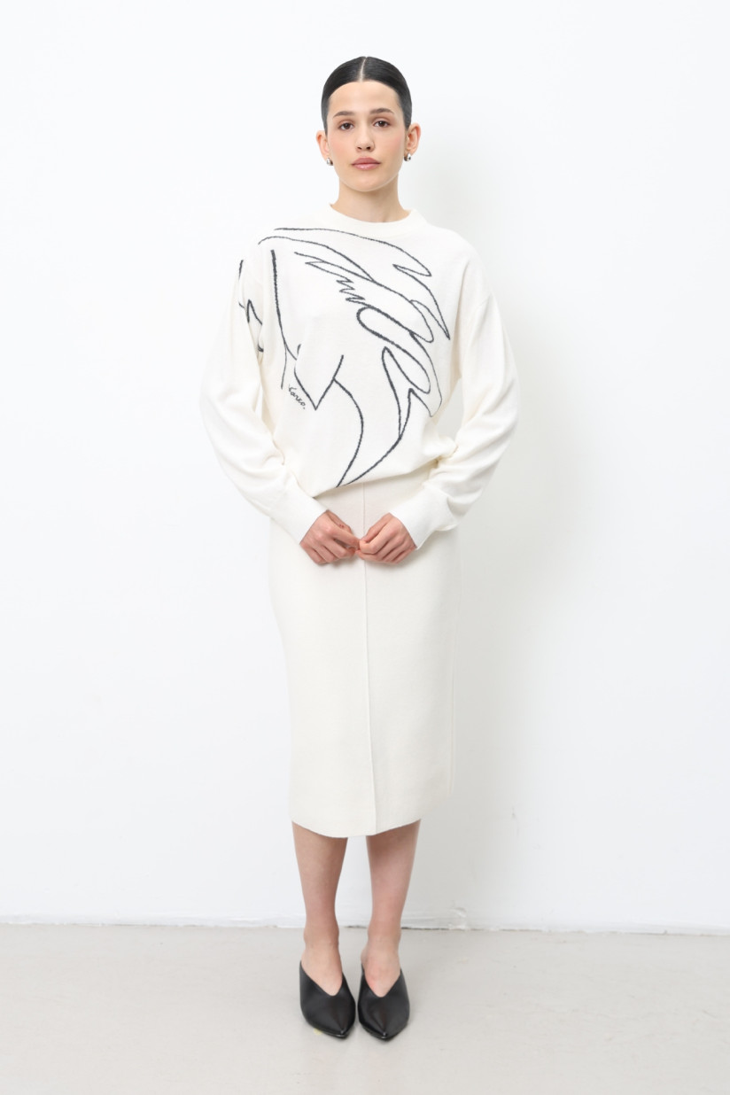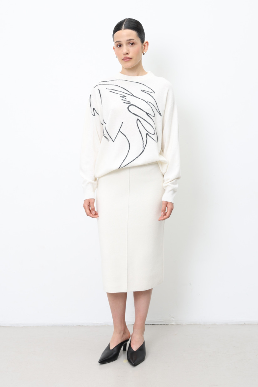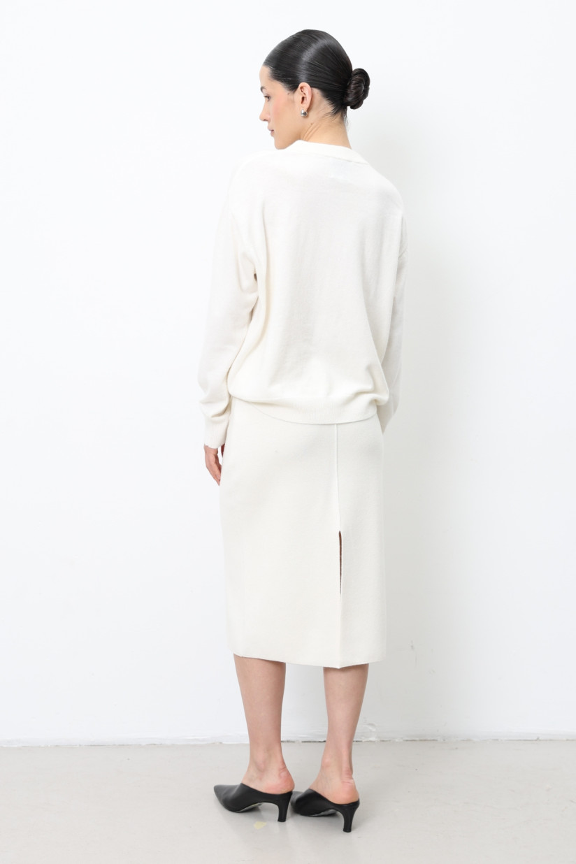 A straight-cut knitted midi skirt made from lamb’s wool yarn in a dense smooth knit. The skirt features an elastic waistband and decorative central seams on the front and back, finishing with a high back slit. Its modern and elegant silhouette makes it a versatile piece for chic, contemporary outfits.