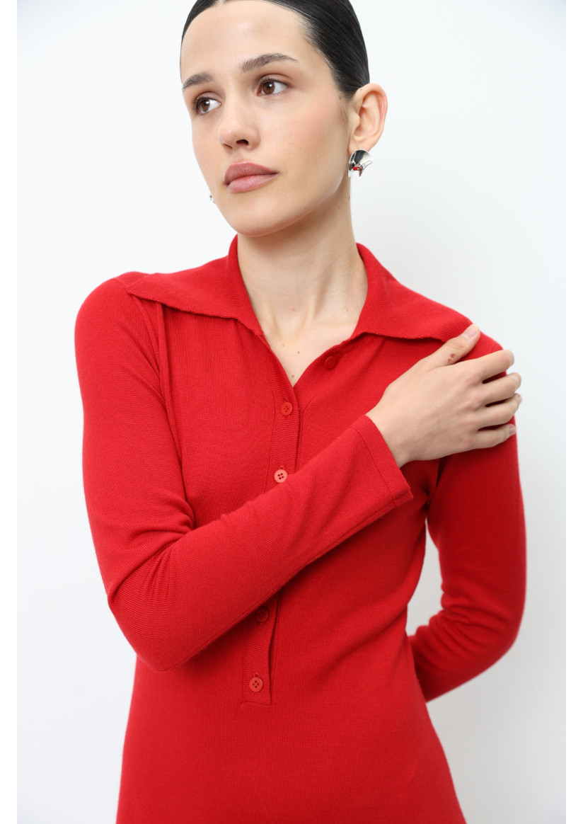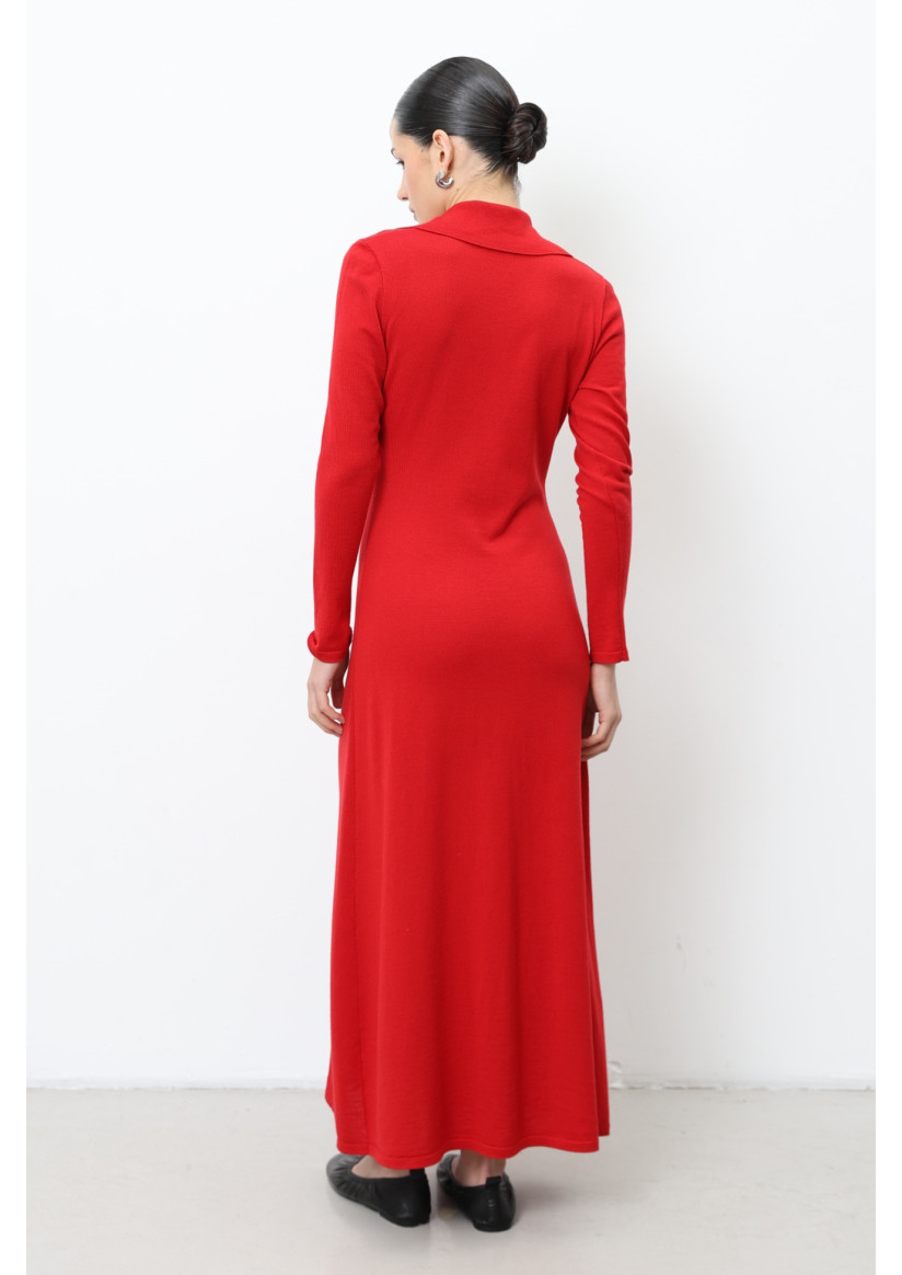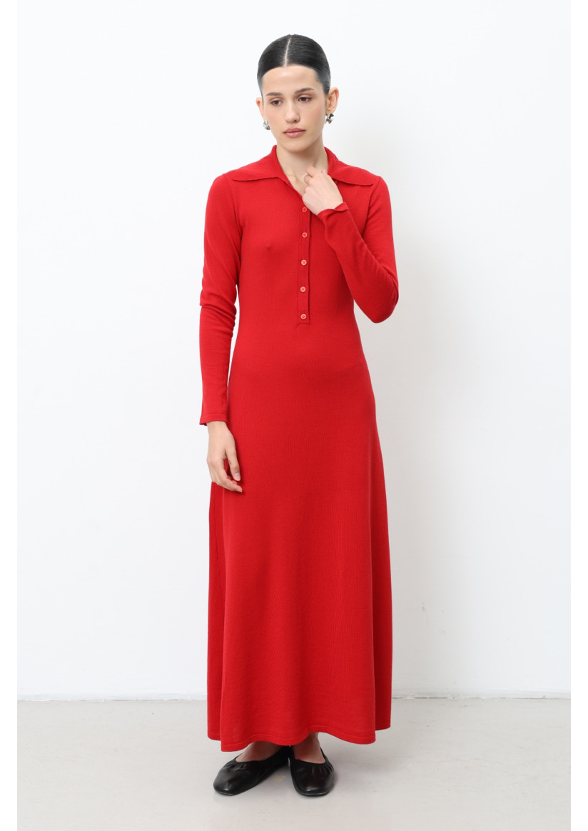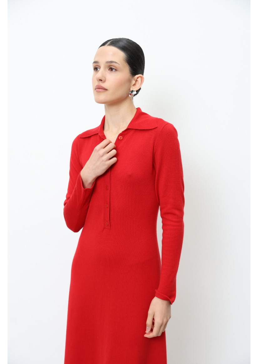 Long dress crafted from 100% merino wool with long set-in sleeves. The neckline features a refined collar with elegant button detailing, adding a sophisticated touch. Semi-fitted at the top, flowing into an A-line silhouette for a graceful and feminine shape.
