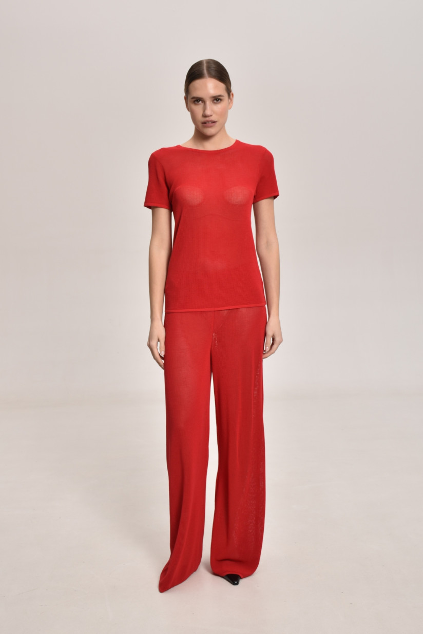 Straight silhouette jumper made of knitted lace mesh made of viscose yarn. Round neckline, short sleeves. Complement it with trousers and a blouse from the same line.