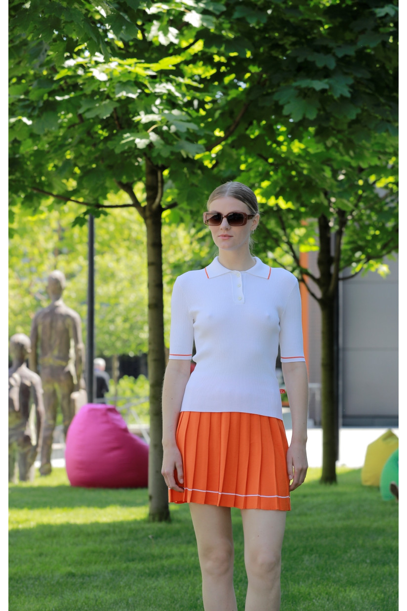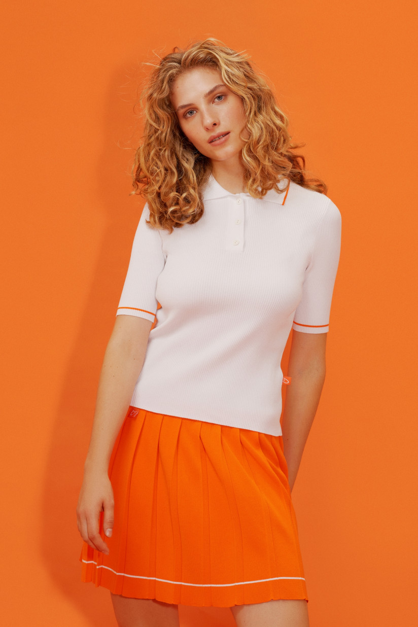 The collection includes 8 items of clothing: knitted women's and unisex polos, as well as pleated skirts. The bright orange, white, and navy sets are a nod to travel and leisure and are classic wardrobe staples that are timeless and seasonless.