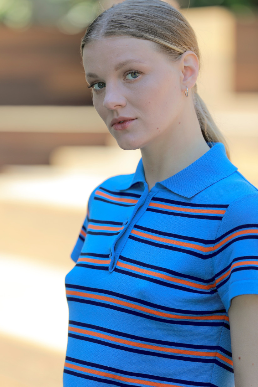 The collection includes 8 items of clothing: knitted women's and unisex polos, as well as pleated skirts. The bright orange, white, and navy sets are a nod to travel and leisure and are classic wardrobe staples that are timeless and seasonless.