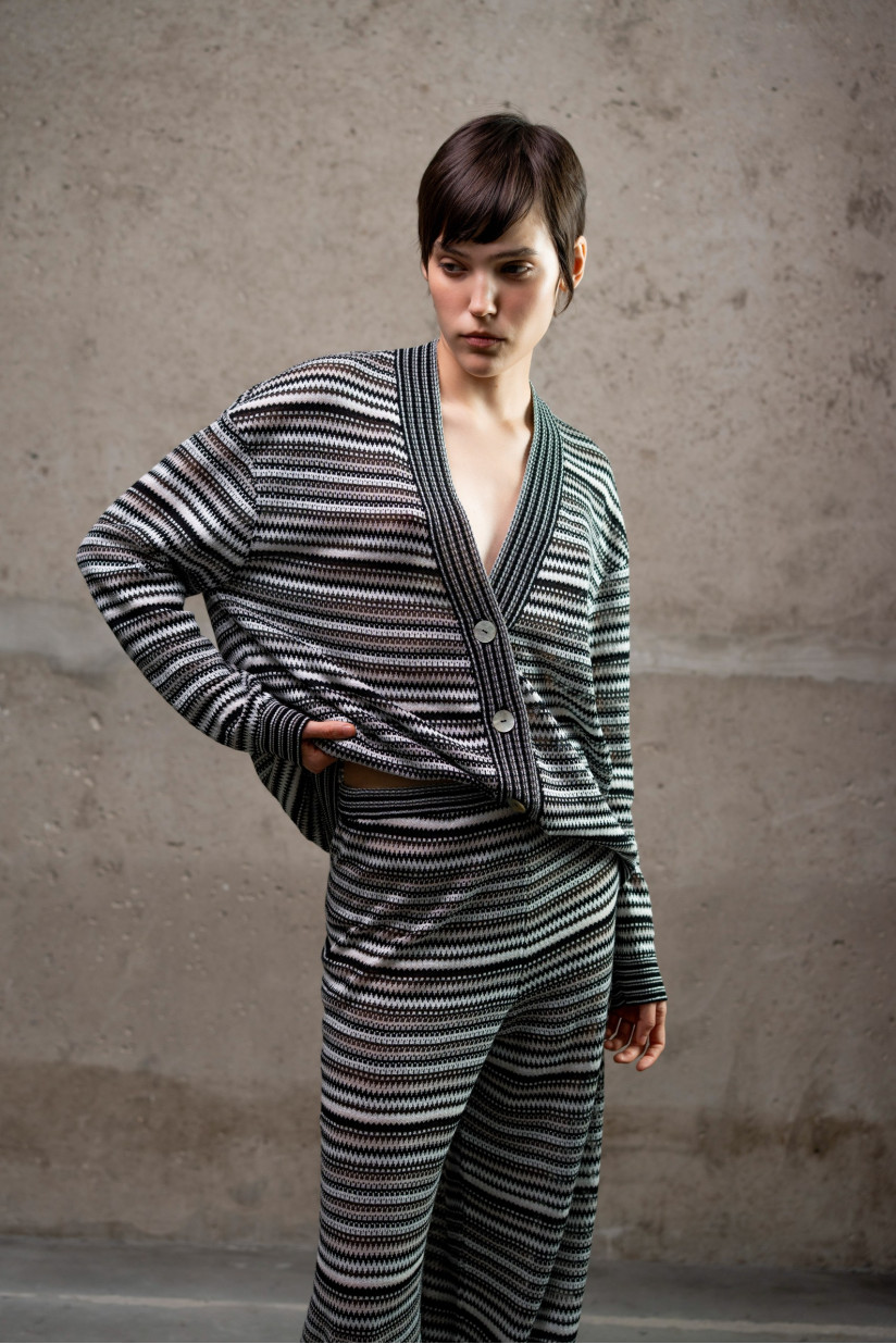Трикотажний кардиган із графічним візерунком, натхненним ескізами Соні Делоне. Прямий вільний силует, довжина до лінії стегон створюють розслаблений і водночас виразний образ. Модель доповнена глибоким V-подібним вирізом, застібкою на ґудзики, спущеною лінією плеча та подовженими рукавами. Контрастне оформлення планки та манжетів підкреслює графічність виробу, а м’яка обробка країв без зайвого об’єму забезпечує комфорт у носінні. Виконаний з еластичного трикотажного полотна з віскозної пряжі з додаванням металізованої нитки у щільному переплетенні, що додає делікатного блиску та глибини фактурі.