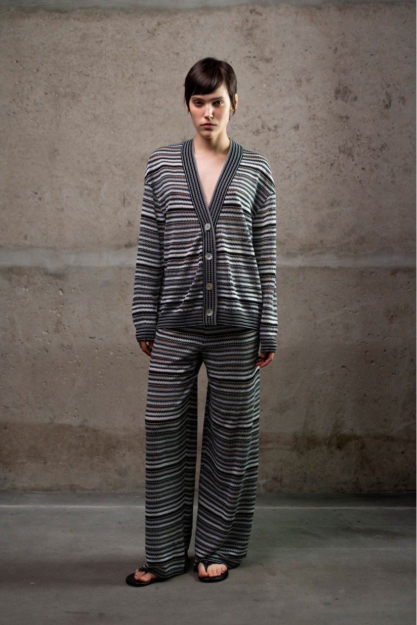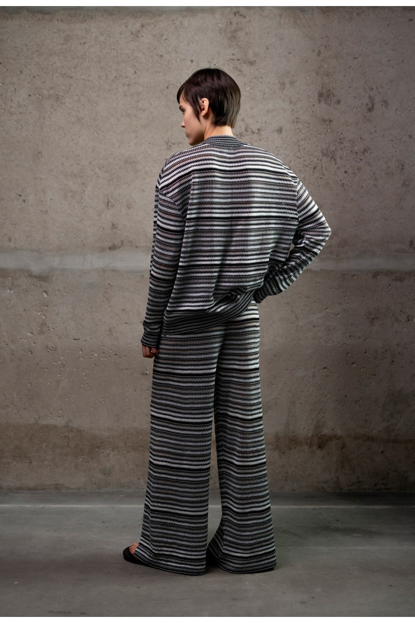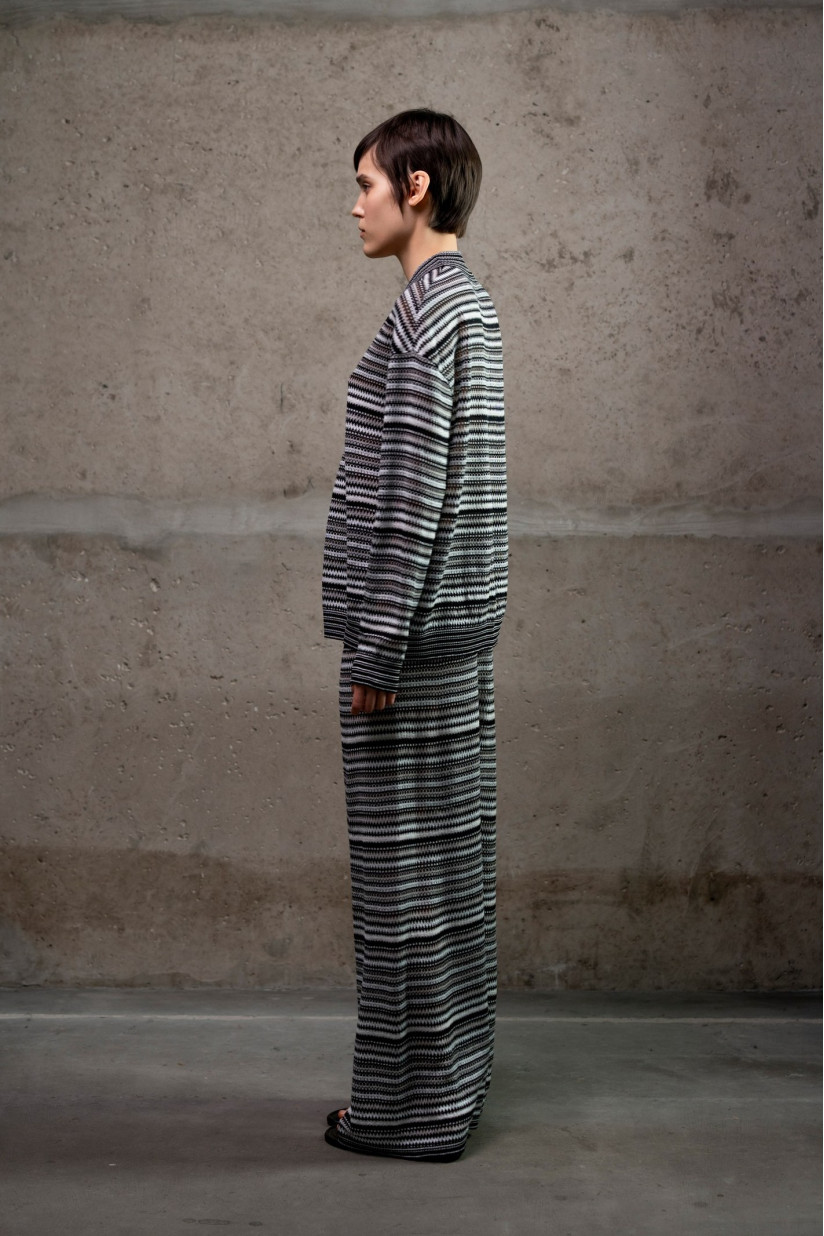 Трикотажні брюки з геометричним візерунком, натхненним ескізами Соні Делоне. Вільний прямий силует із легким розширенням донизу, висока посадка та повна довжина формують витягнутий і збалансований силует. Еластичний пояс без застібок забезпечує комфорт і зручність у носінні. Виконані з еластичного трикотажного полотна з віскозної пряжі з додаванням металізованої нитки у щільному переплетенні, що додає делікатного блиску та глибини фактурі.