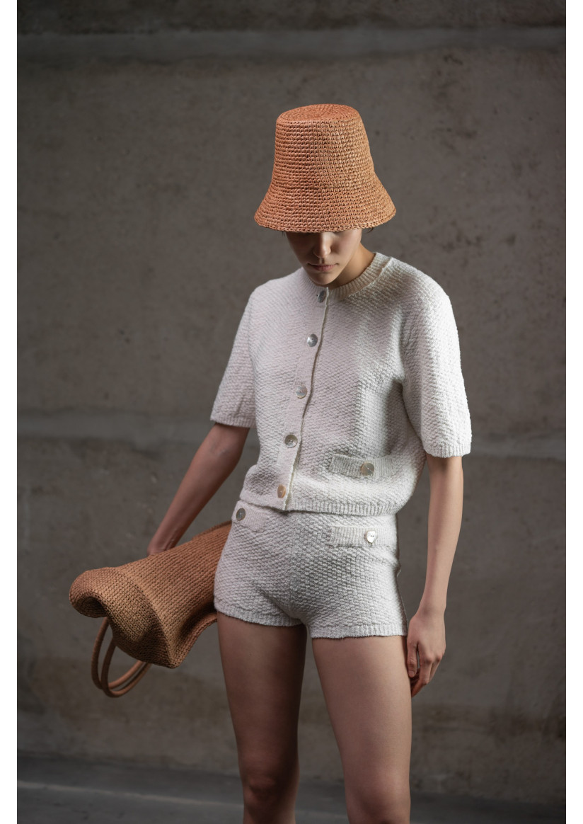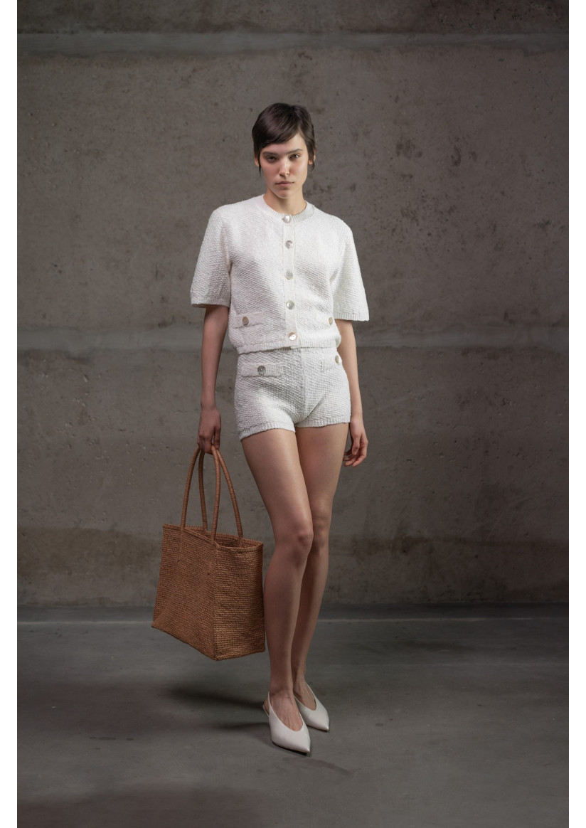 Трикотажні мінішорти з фактурної бавовняної пряжі. Модель облягаючого крою з високою посадкою на широкому еластичному поясі підкреслює силует і забезпечує комфортну посадку. Імітація прорізних кишень у вигляді клапанів оздоблена декоративними ґудзиками. Пояс і краї шортів виконані еластичним переплетенням у рубчик. Виріб зв’язаний із фактурної бавовняної пряжі в переплетенні з ефектом «букле» або дрібного зерна, що надає поверхні виразної текстури.