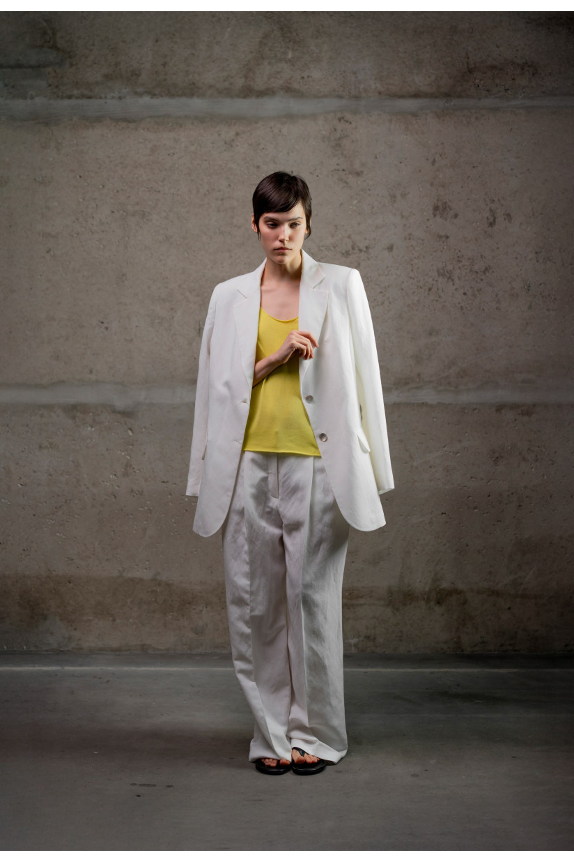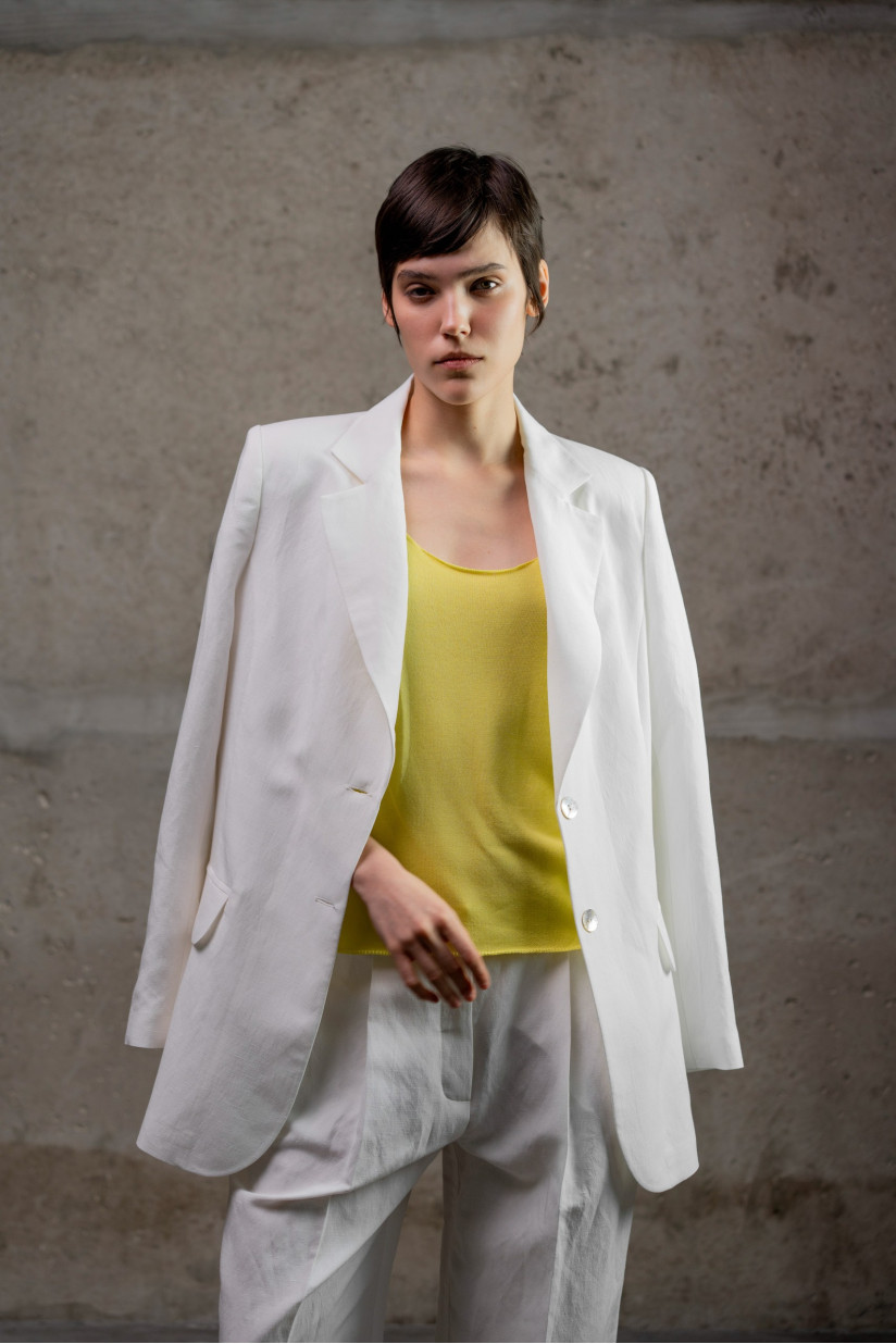Напівприталений силует із м’яко окресленою лінією талії. Класичний крій із відкладним коміром і лацканами, застібка на ґудзики, імітація прорізних кишень із клапанами, втачний рукав. Довжина — до лінії стегон. Виконаний з органічного льону з характерною легкою фактурністю та матовою поверхнею; підкладка — гладка віскоза.