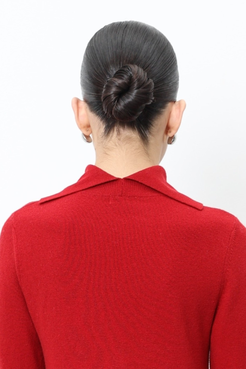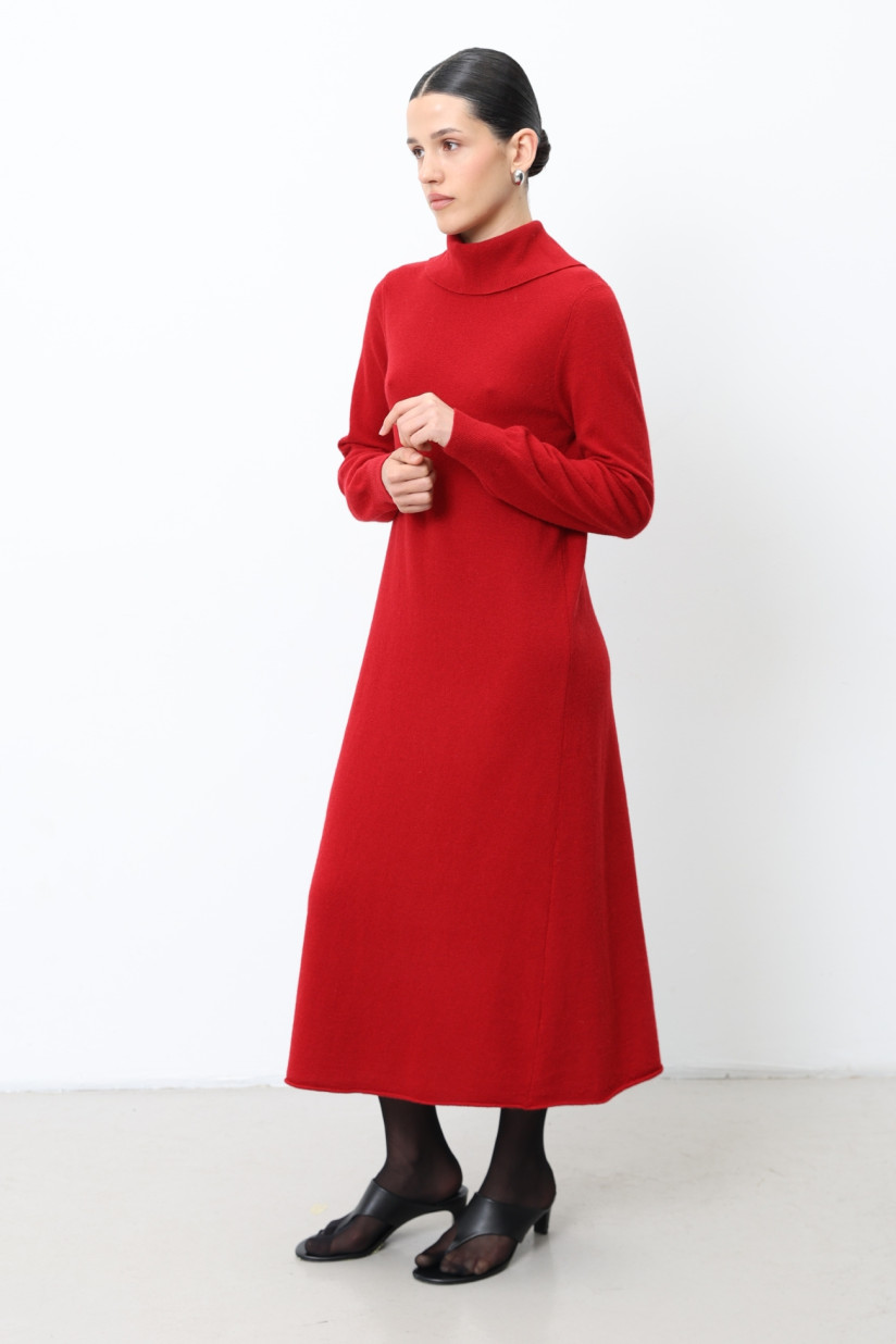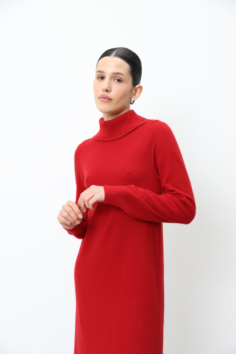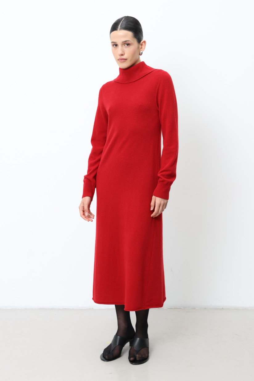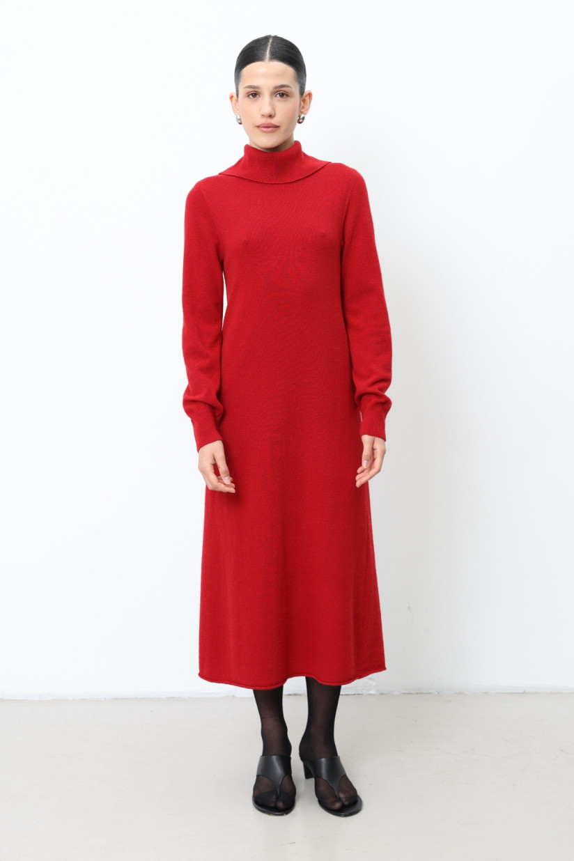 Напівприталена трикотажна сукня з пряжі вовни ягнят гладкого переплетіння. М’який А-подібний силует, довгий втачний рукав і відкладний комір із розрізом на спинці створюють елегантний і сучасний образ. Комір, манжети та низ оформлені в класичному переплетінні «резинка», підкреслюючи текстуру та структуру виробу.