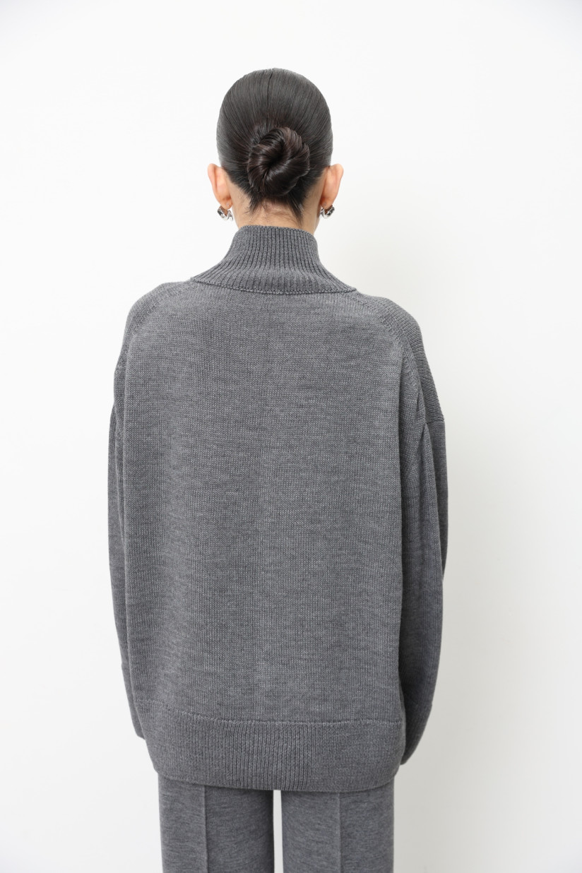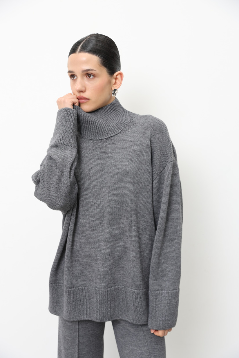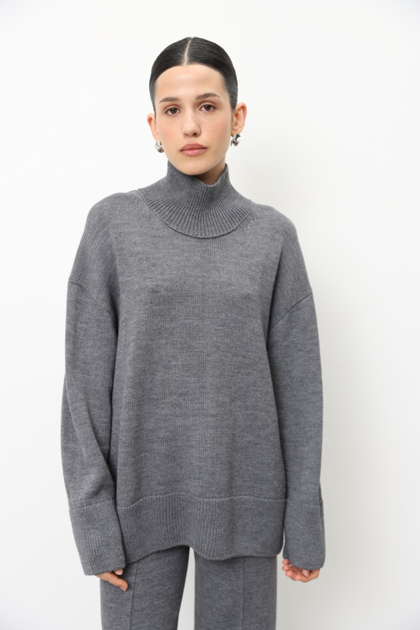 Об’ємний джемпер з напіввовняної пряжі у гладкому об’ємному переплетінні. Вільний прямий силует із коміром-стійкою, спущеною лінією плеча та довгими рукавами. Довжина — нижче середини стегна. Комір, манжети та низ виконані у переплетінні «резинка» однакової висоти, при цьому резинка по низу розслаблена, що забезпечує вільне та комфортне прилягання.