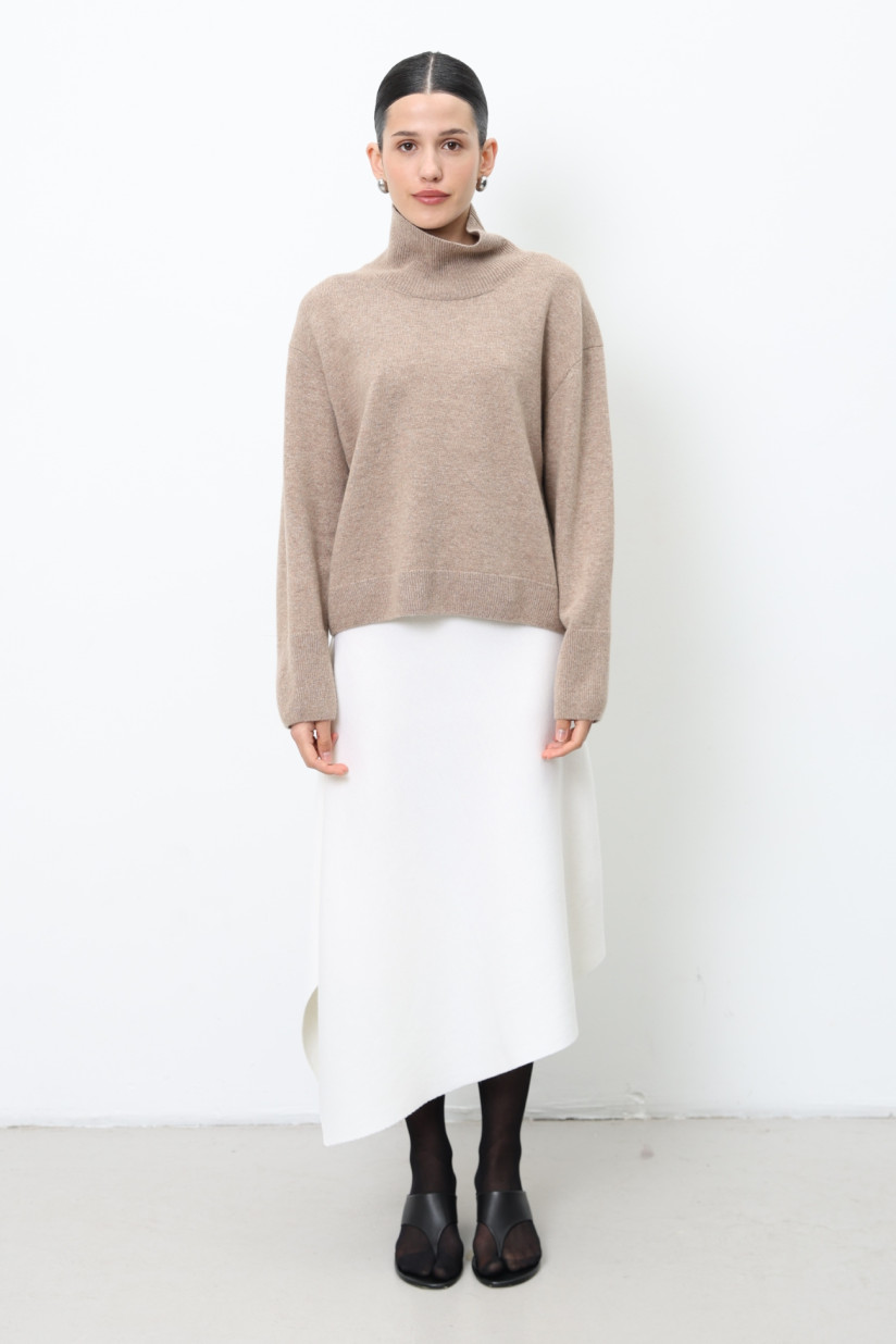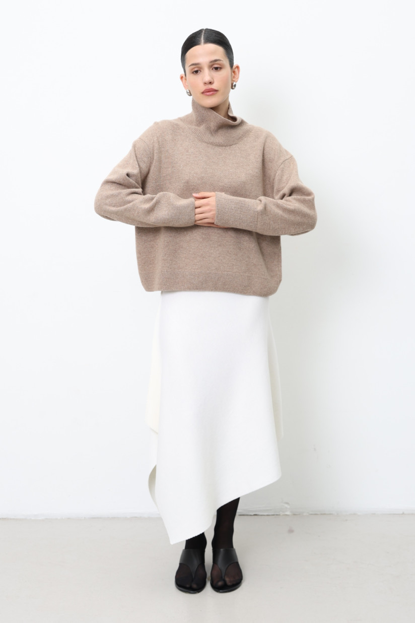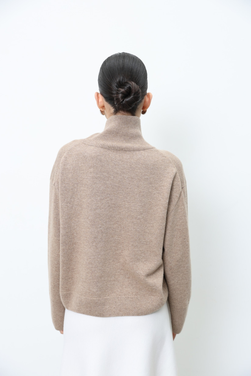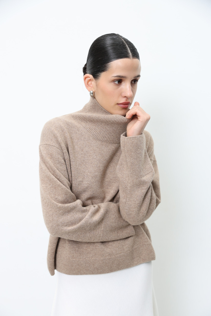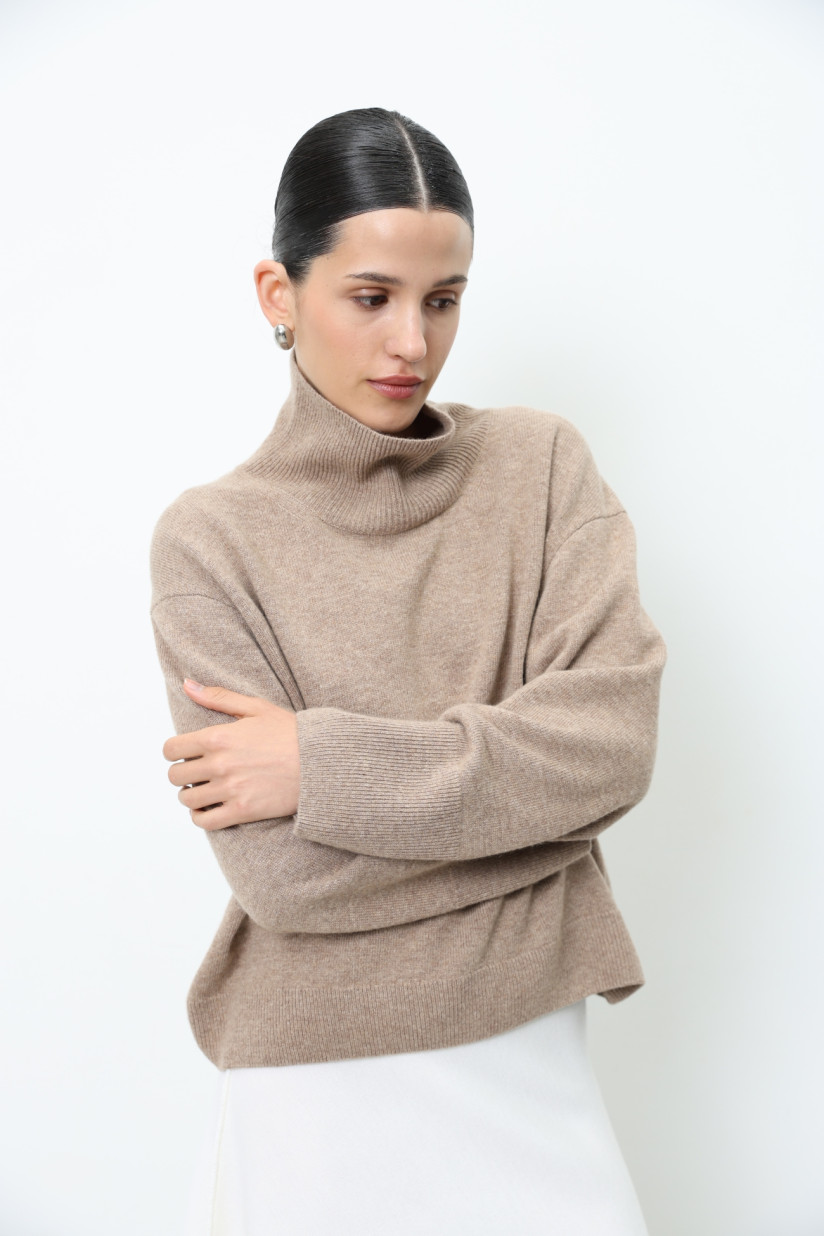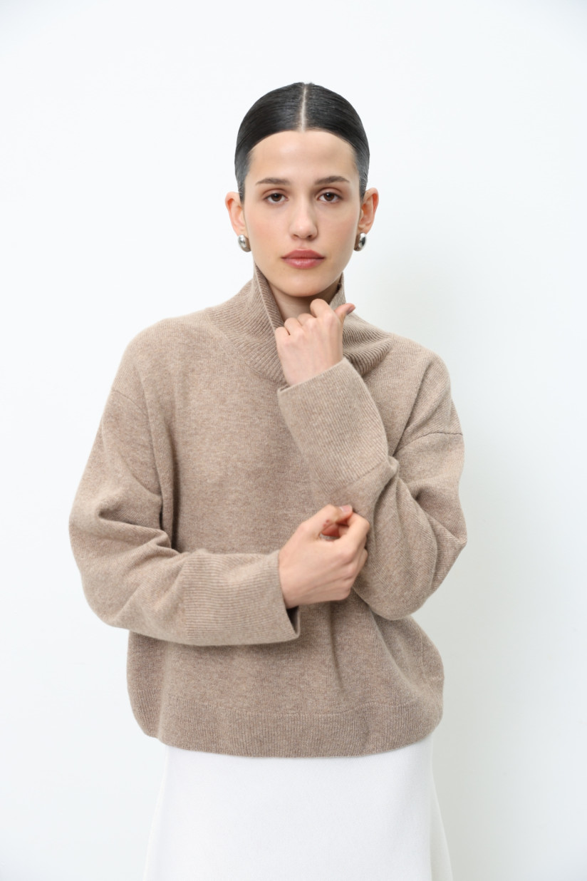 Лаконічний, злегка укорочений об’ємний джемпер з вовни ягнят у гладкому м’якому переплетінні. Вільний прямий силует із коміром-стійкою, спущеною лінією плеча та довгими рукавами. Довжина до стегна. Комір, манжети та низ оформлені у переплетінні «резинка», що додає виробу виразної текстури та завершеності.