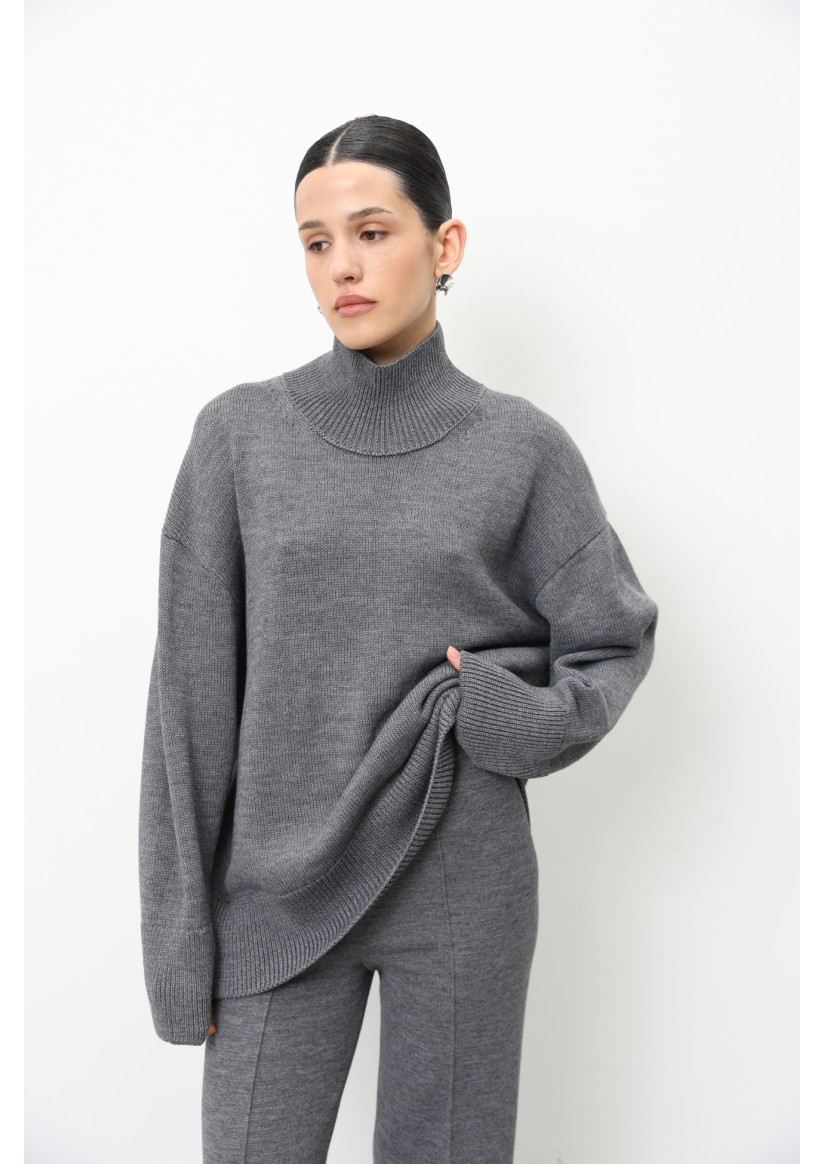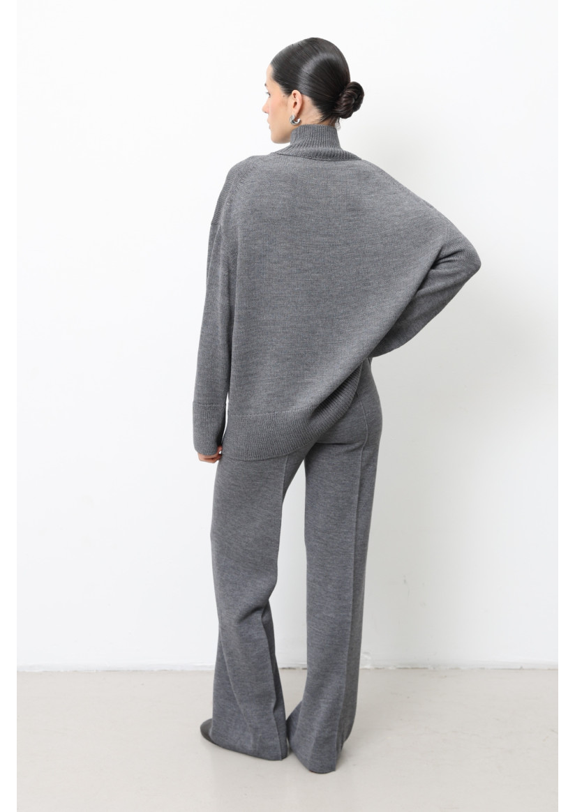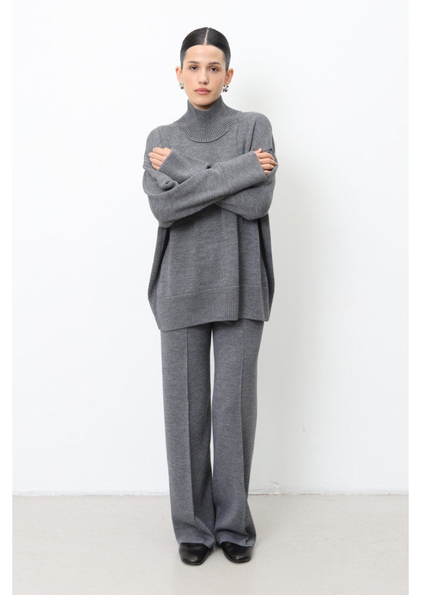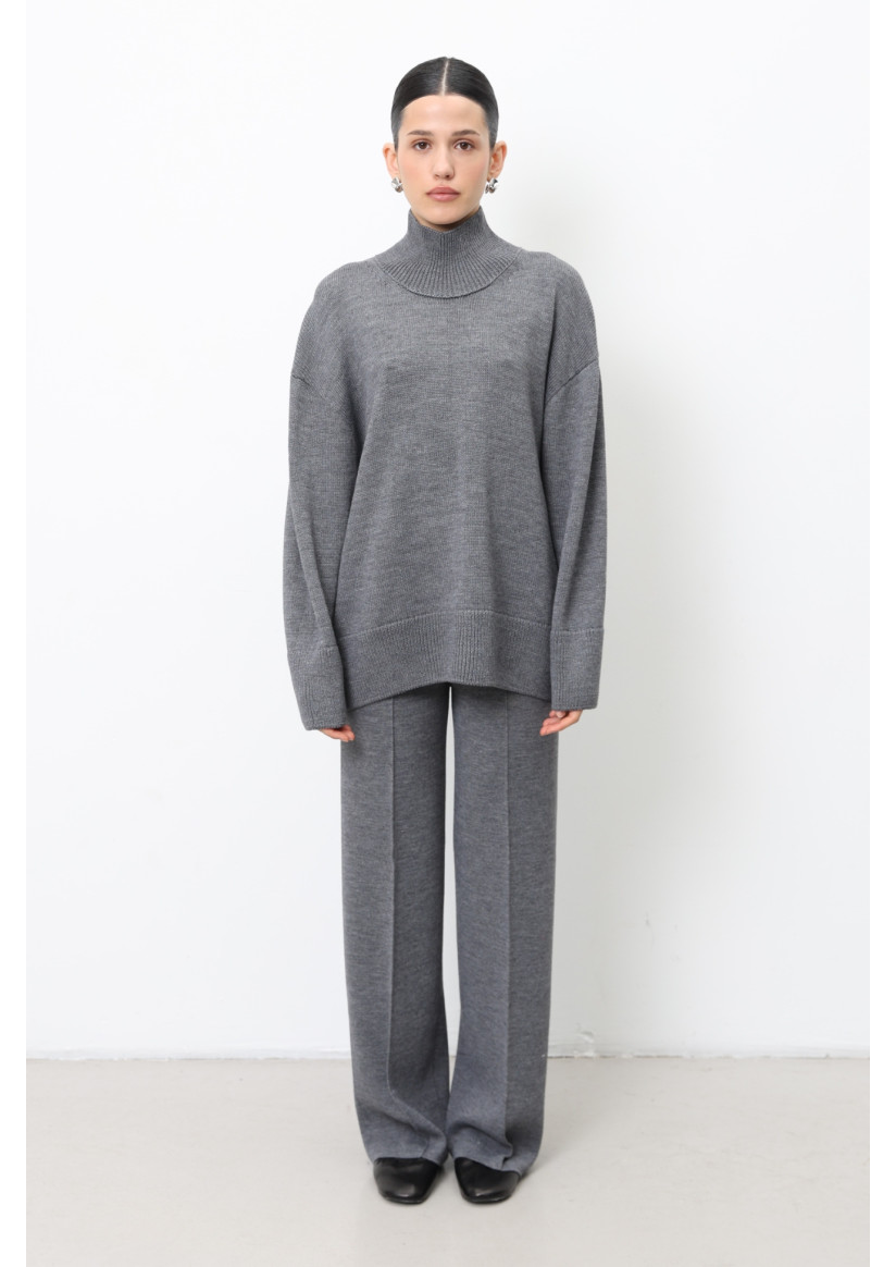 Трикотажні штани з напіввовни щільної в’язки. Висока посадка на еластичному поясі забезпечує комфорт і підтримку. Штанини прикрашені елегантними стрілками швом спереду та ззаду. Вільний прямий силует від стегон створює сучасний, легкий образ. Штани без кишень, лаконічний дизайн підкреслює чистоту силуету та універсальність у гардеробі.