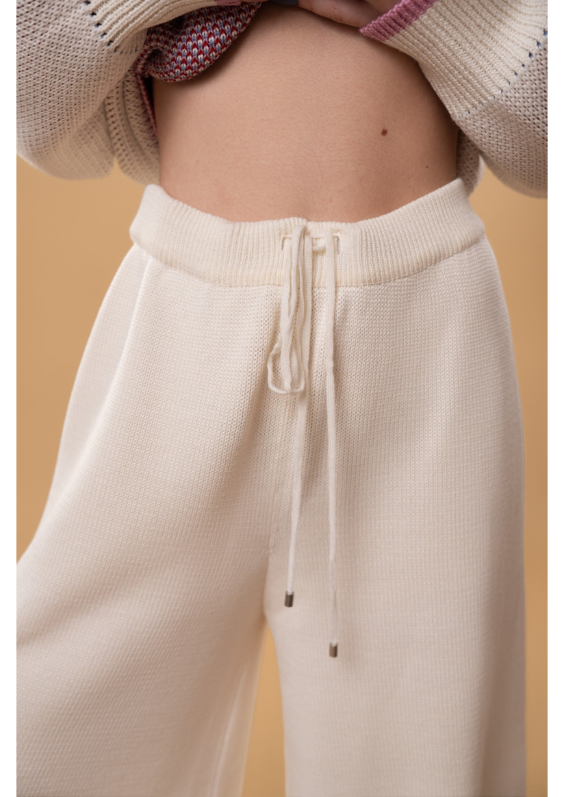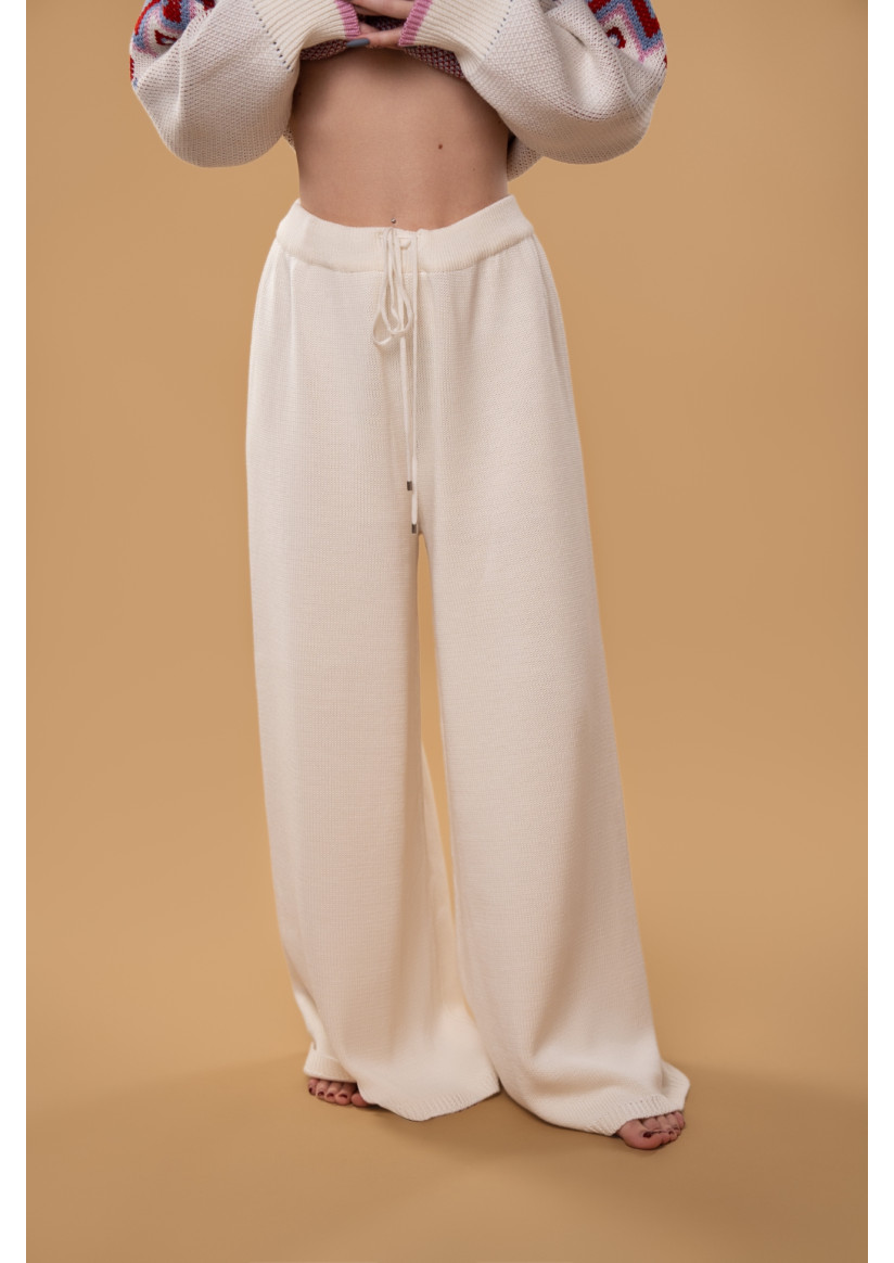 Штани вільного крою, розроблені у партнерстві з brabrabra, виконані з м’якої пряжі з суміші вовни та акрилу й забезпечують комфорт упродовж дня. Натуральні властивості вовни підтримують оптимальну терморегуляцію: зігрівають у прохолоду та дозволяють шкірі «дихати» за підвищеної температури. Модель доповнена широкою еластичною резинкою зі шнурівкою та нижнім манжетом в рубчик із вільним краєм.