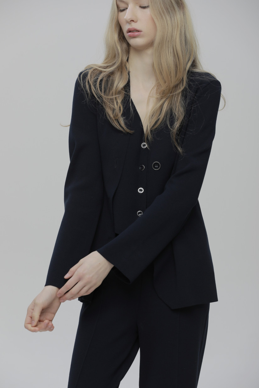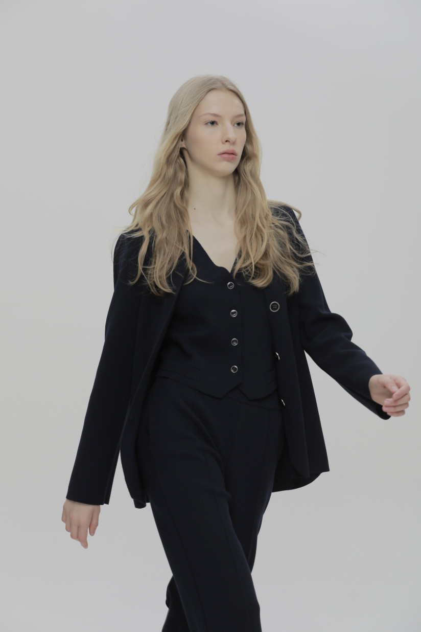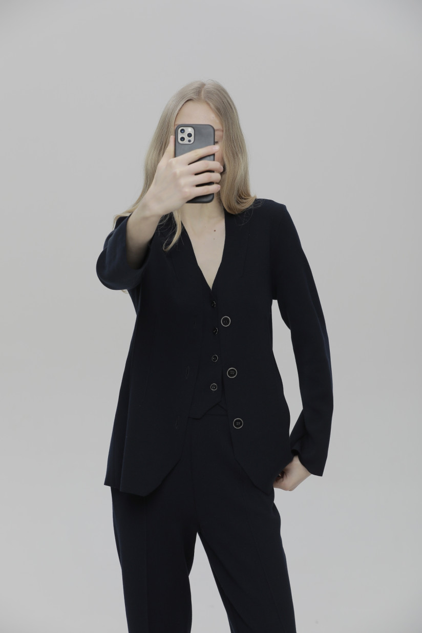 Трикотажний приталений піджак з віскози. Застібка на ґудзиках. В новому сезоні оновлений силует класичного піджака представлений в кольорах колекції. Особливістю цієї моделі є відсутність лацканів. Поєднуйте його зі штанами або спідницями з тієї ж капсули. Прекрасний варіант для прохолодних вечорів.