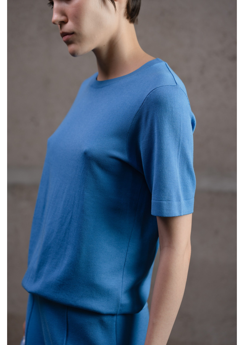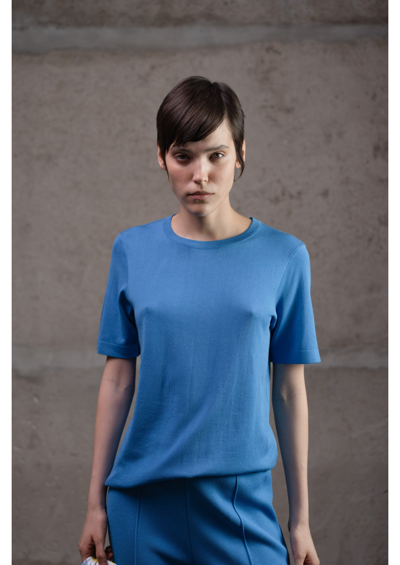 Прямой джемпер умеренно свободного кроя — универсальный базовый элемент гардероба. Модель с круглым вырезом горловины, отделанным тонкой бейкой, и удлинёнными короткими рукавами. Длина изделия до линии бёдер обеспечивает комфорт и стильную посадку. Выполнен из вискозной пряжи гладкого переплетения для мягкости и приятной текстуры.
