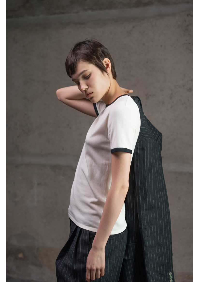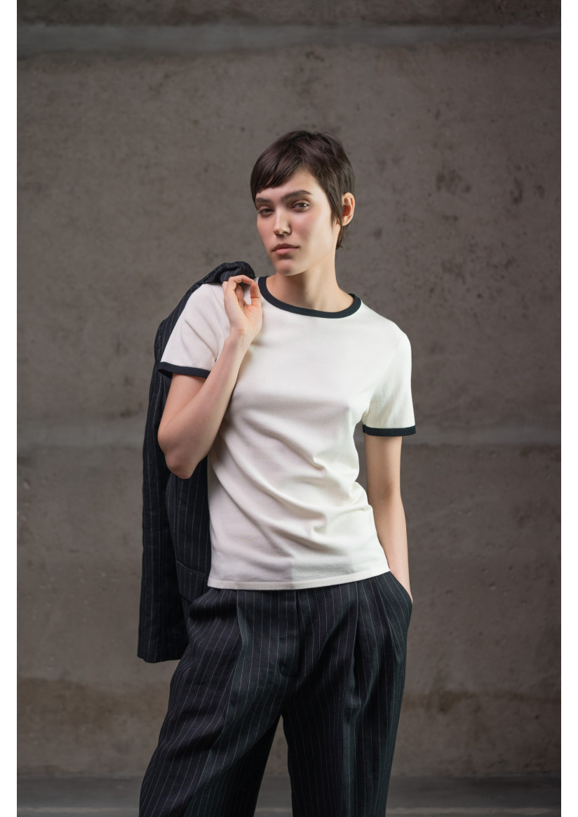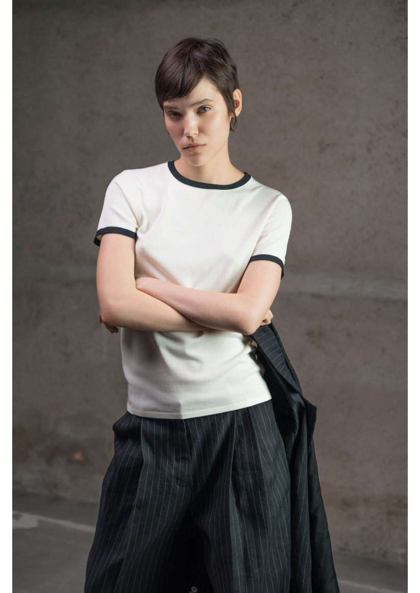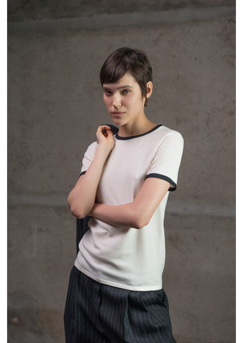 Классический базовый джемпер с круглым вырезом и короткими рукавами в прямом, полуприлегающем (slim fit) силуэте — универсальный элемент гардероба с современным акцентом. Модель с круглым вырезом горловины, отделанным тонкой бейкой, короткими рукавами и длиной до линии бёдер. Горловина, края рукавов и низ изделия украшены контрастным кантом, придающим джемперу стильный графический вид. Выполнен из вискозной пряжи гладкого переплетения, обеспечивающей мягкость и приятную текстуру.