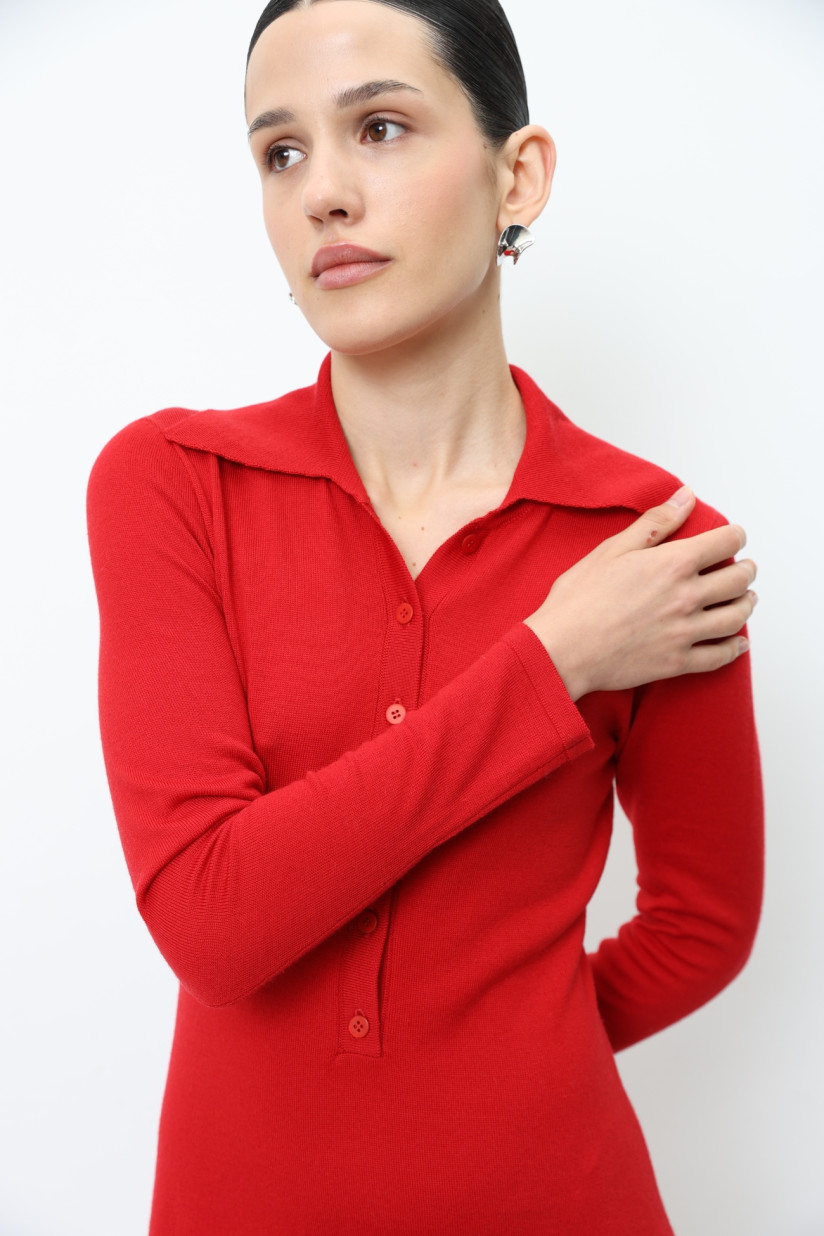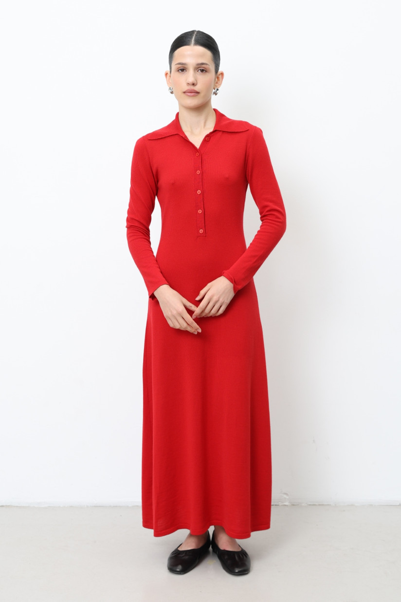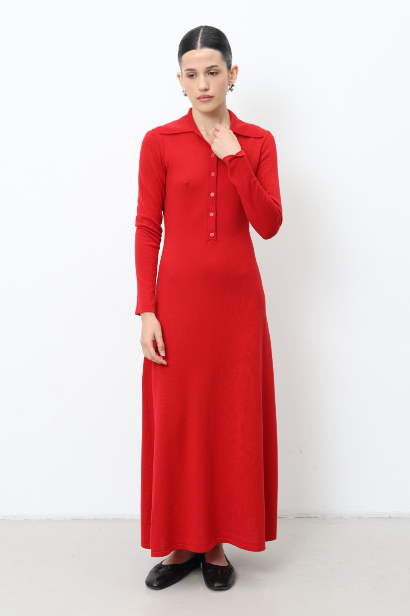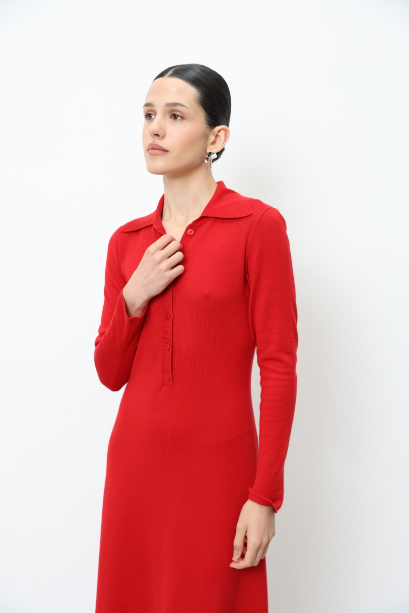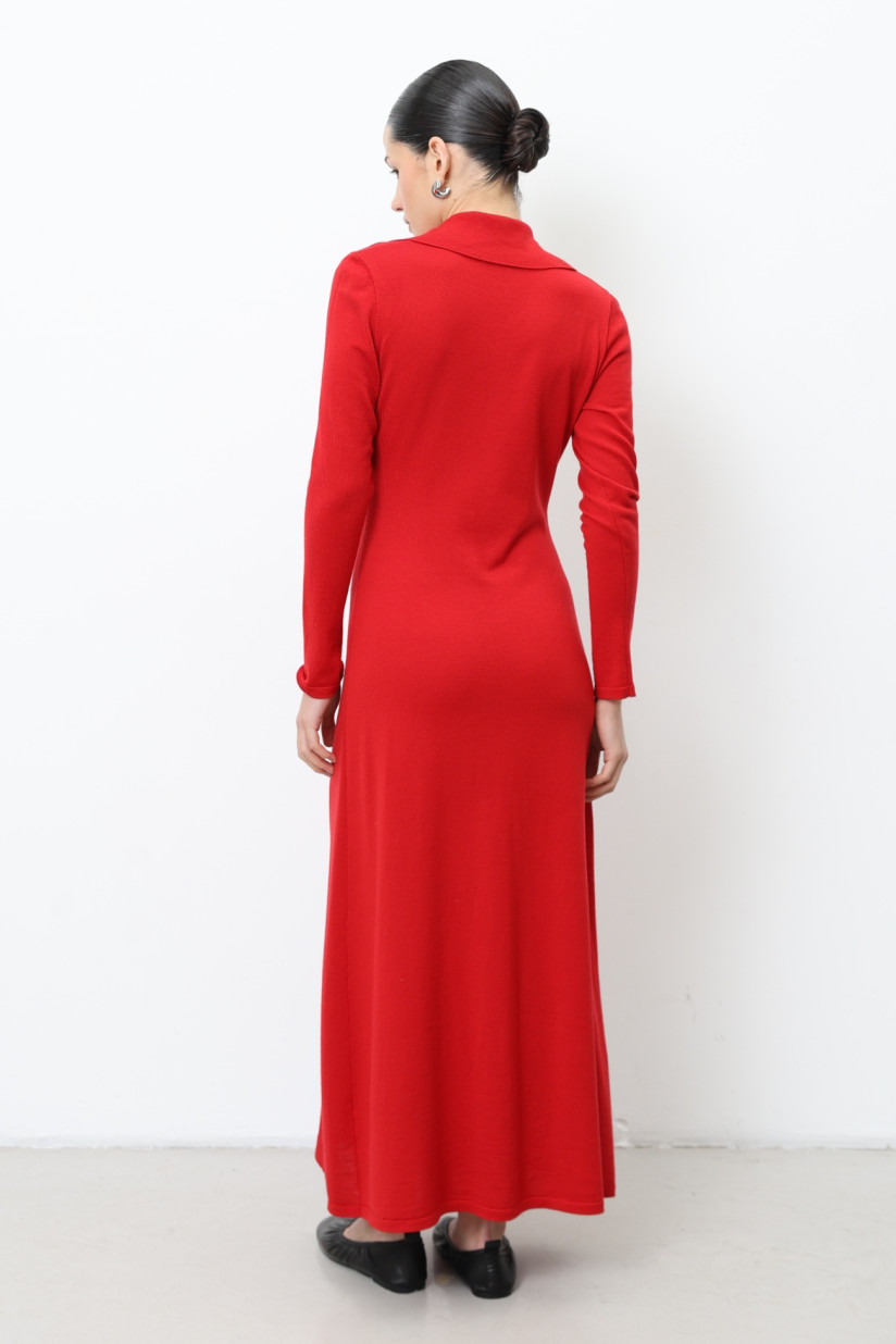 Длинное платье из 100% шерсти мериноса с воротником красное