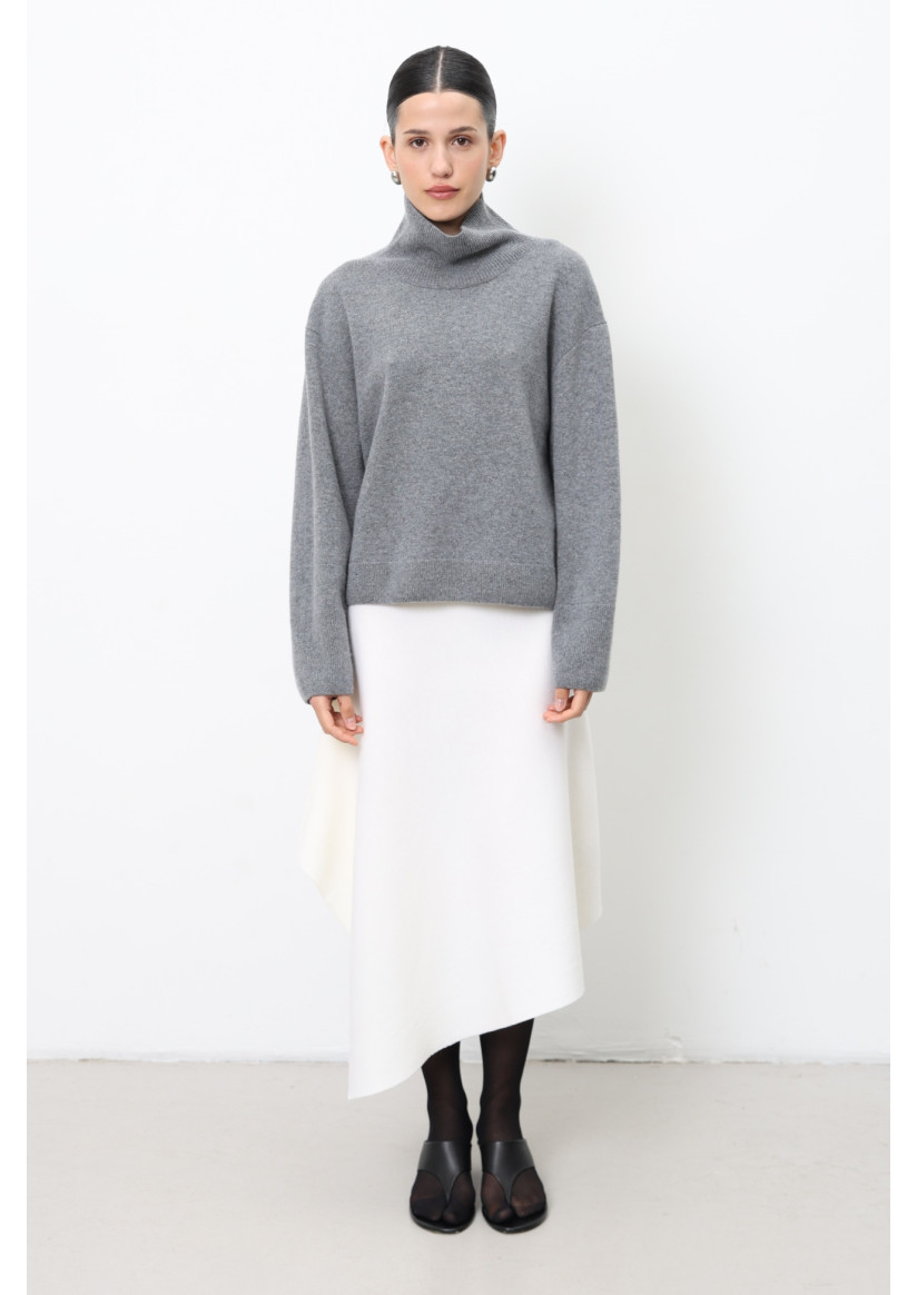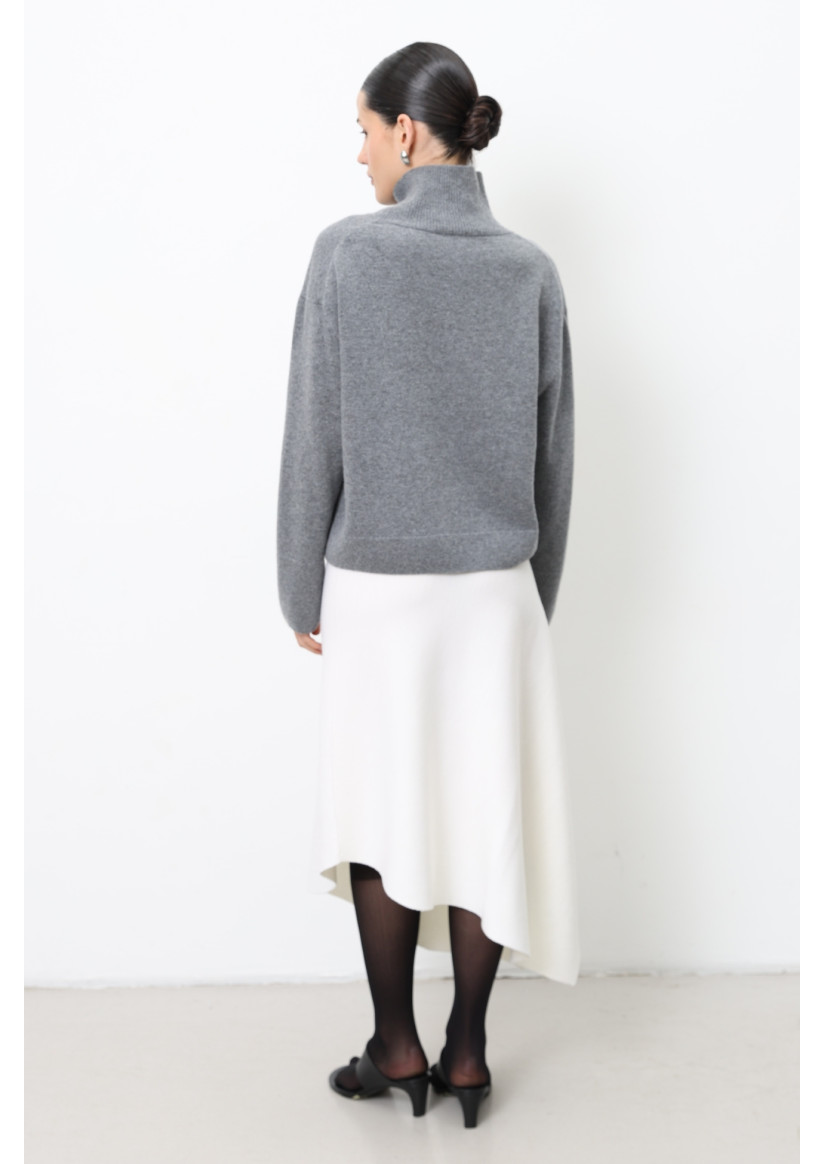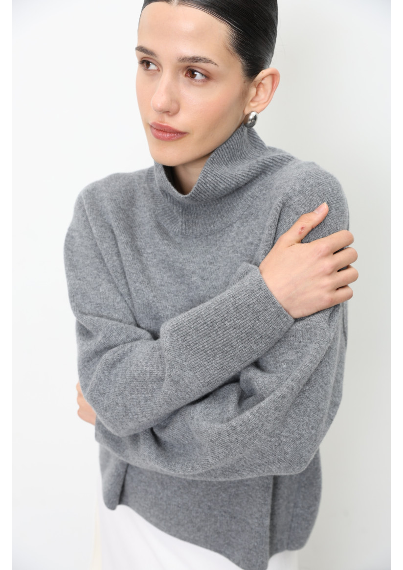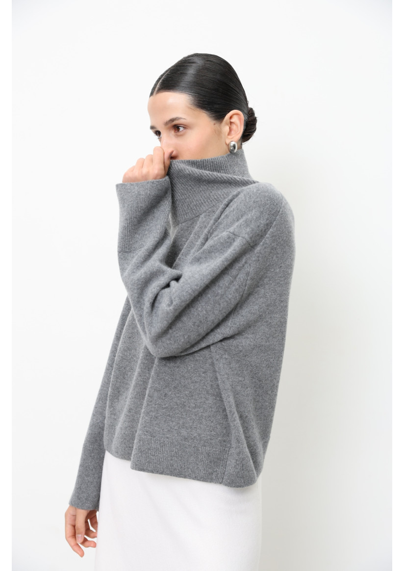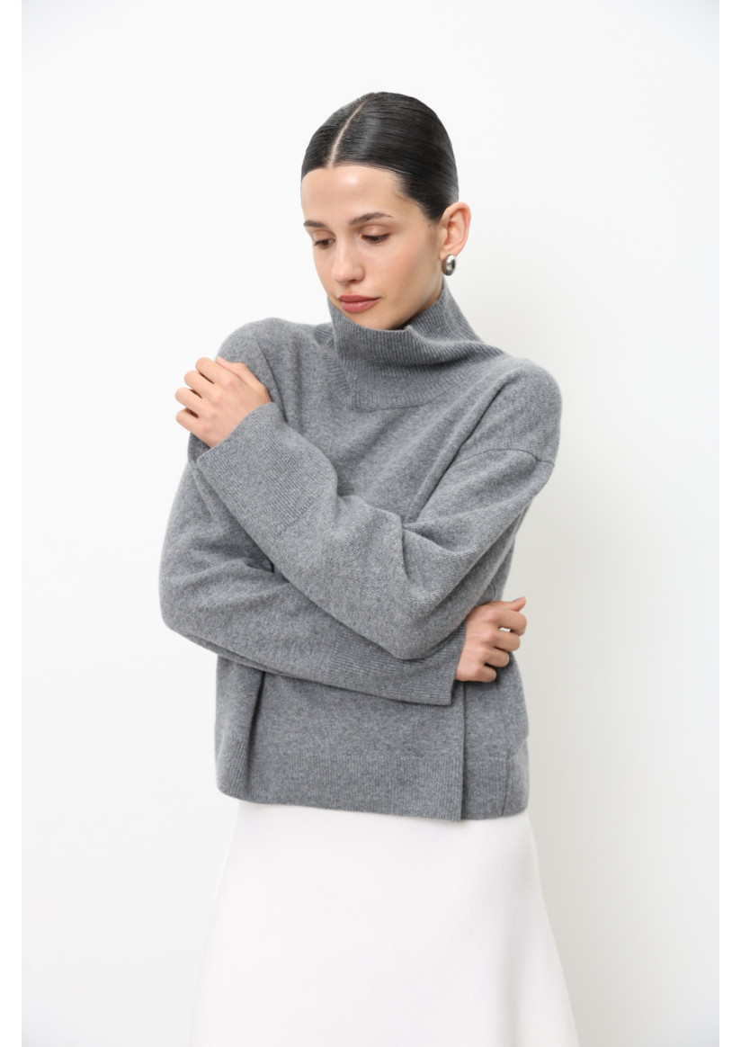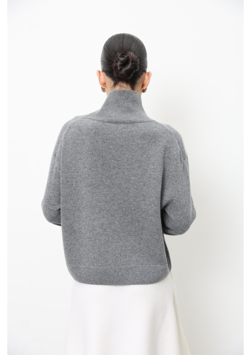 Лаконичный слегка укороченный объёмный джемпер из шерсти ягнёнка в мягком гладком переплетении. Свободный прямой силуэт с воротником-стойкой, заниженной линией плеча и длинными рукавами. Длина до бёдер. Воротник, манжеты и низ выполнены в переплетении «резинка», что придаёт изделию выразительную фактуру и завершённость.