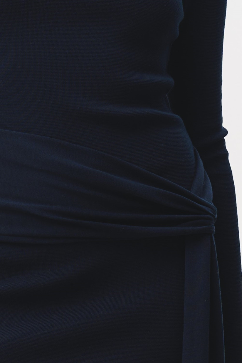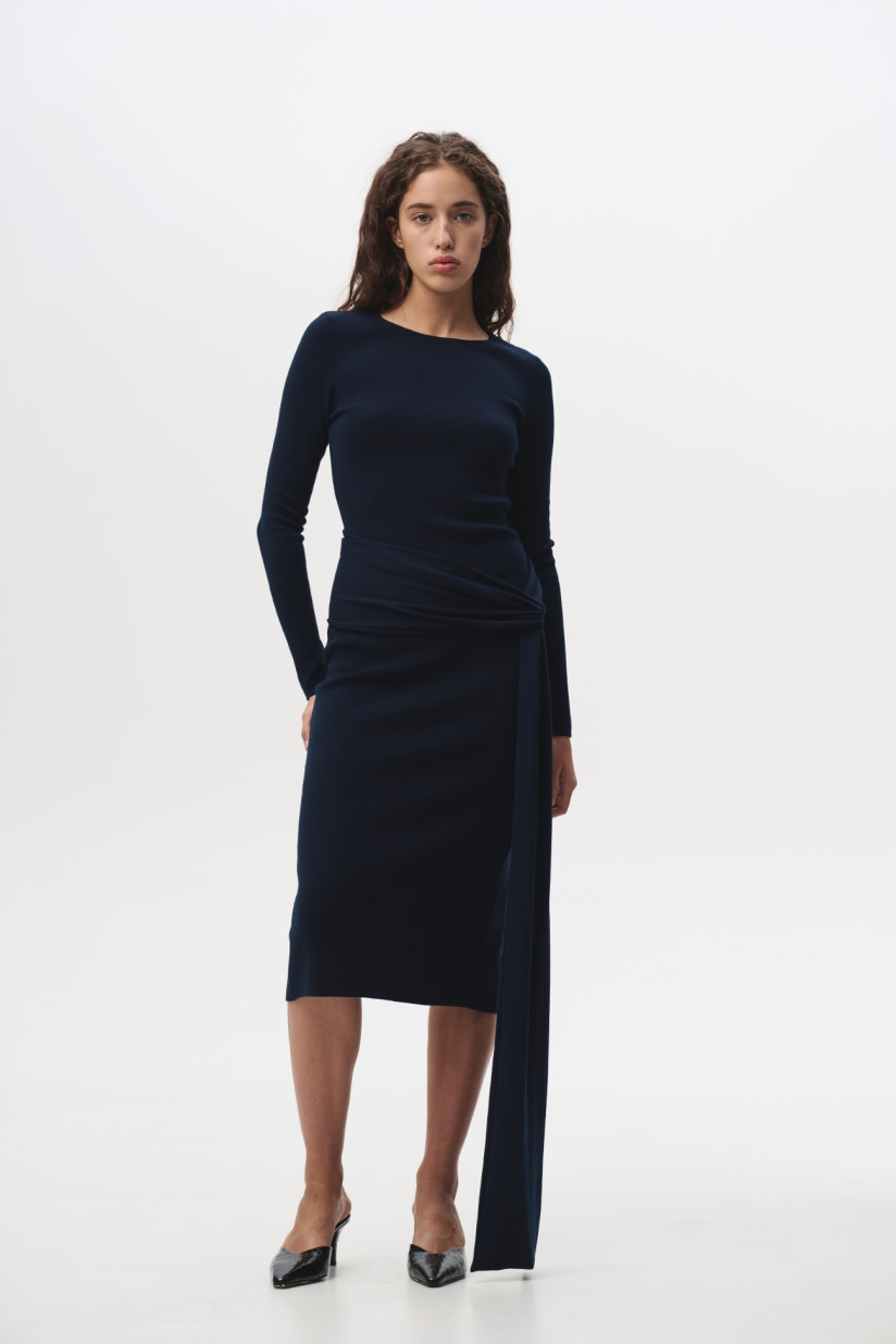 Женское платье-миди с длинным рукавом из тонкой вискозы декорировано поясом на завязке из того же материала.