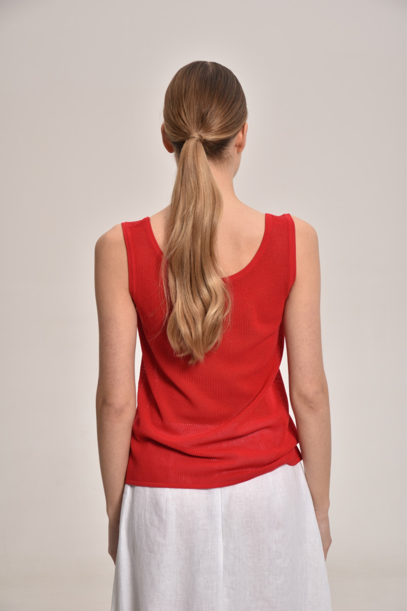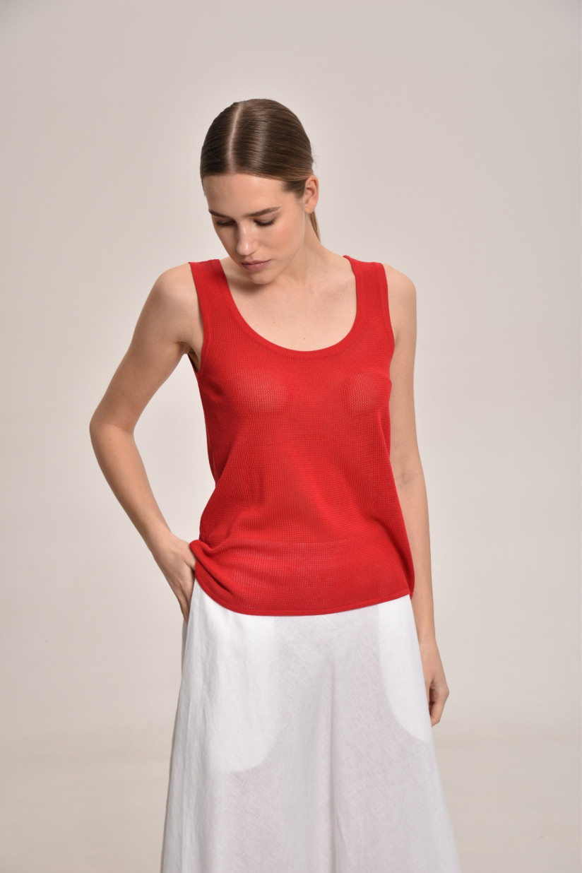 Майка прямого силуэта из трикотажного кружева в виде сетки из вискозной пряжи. Глубокий круглый вырез, широкие бретели. Дополняйте ее брюками и блузами из этой же линейки.