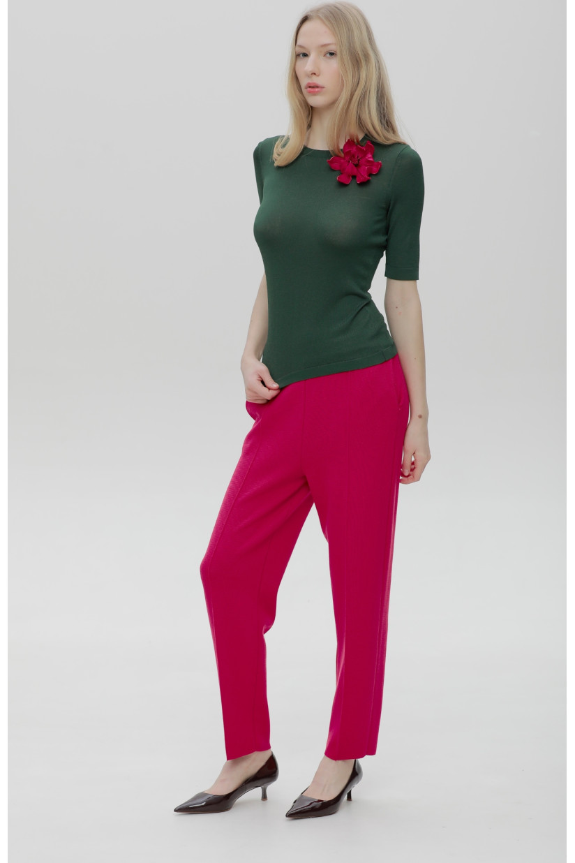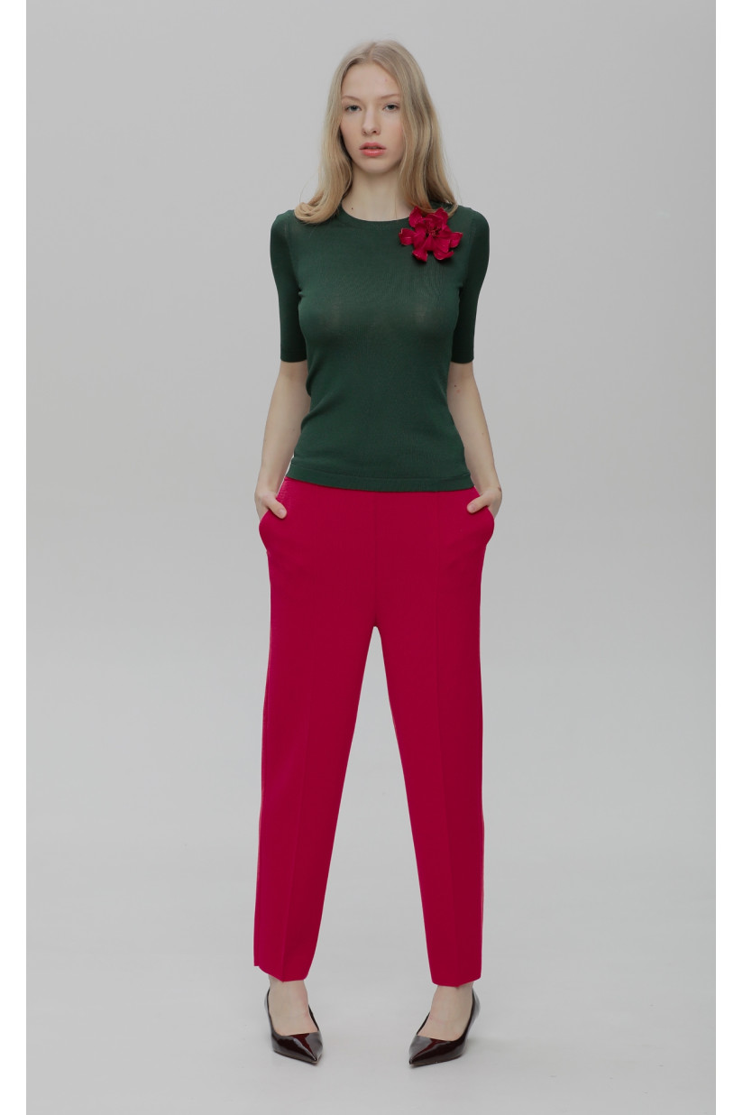 Трикотажные брюки с вискозой, пояс на резинке, стрелка швом спереди и сзади модели. Легкие, слегка зауживающиеся книзу шелковистые брюки - основа в весеннем гардеробе. В этом сезоне любимый силуэт обновили – теперь брюки с удобными карманами. Независимо от того, что вы наденете – объемную мужскую рубашку и челноки, или пиджак и ботильоны, или футболку, трикотажный кардиган и массивные кроссовки – образ однозначно будет элегантным.