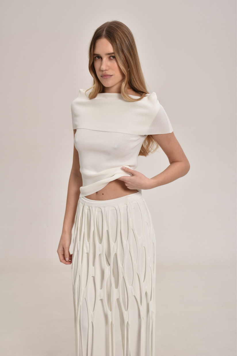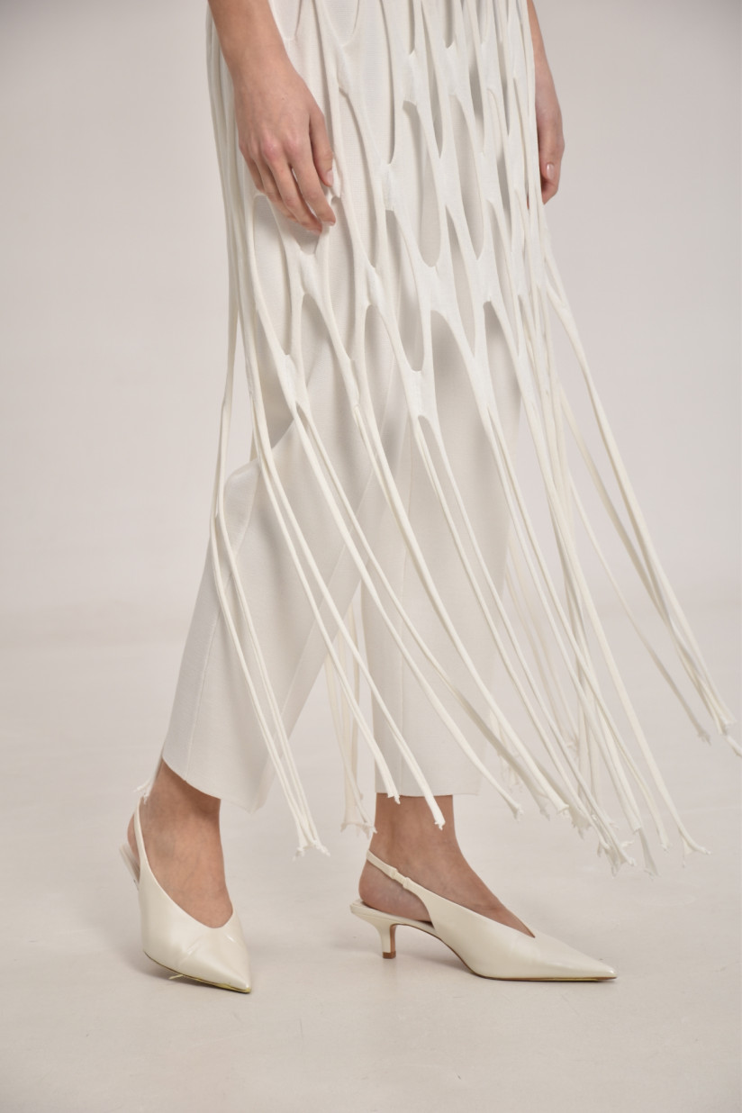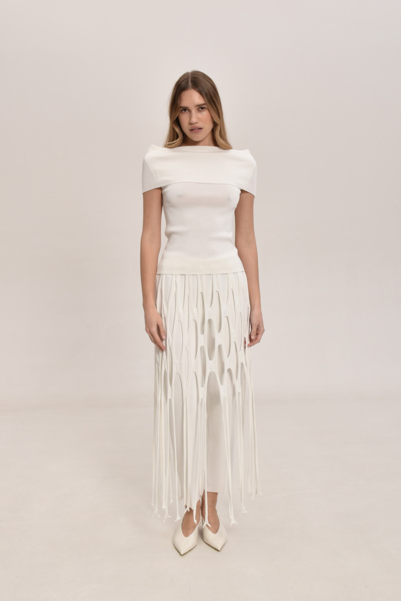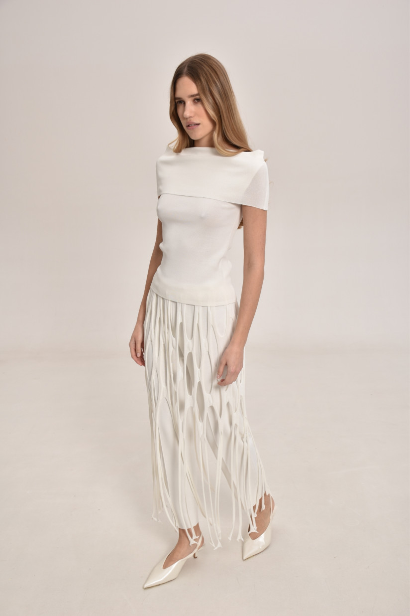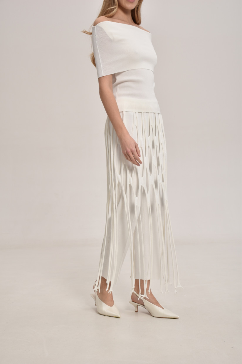 Юбка-накидка из вискозы на эластичном поясе с оригинальной, крупной сетчатой текстурой и изящными кистями, ниспадающими от середины бедра до середины голени, создавая грациозное движение в такт каждому шагу, придавая силуэту динамики.