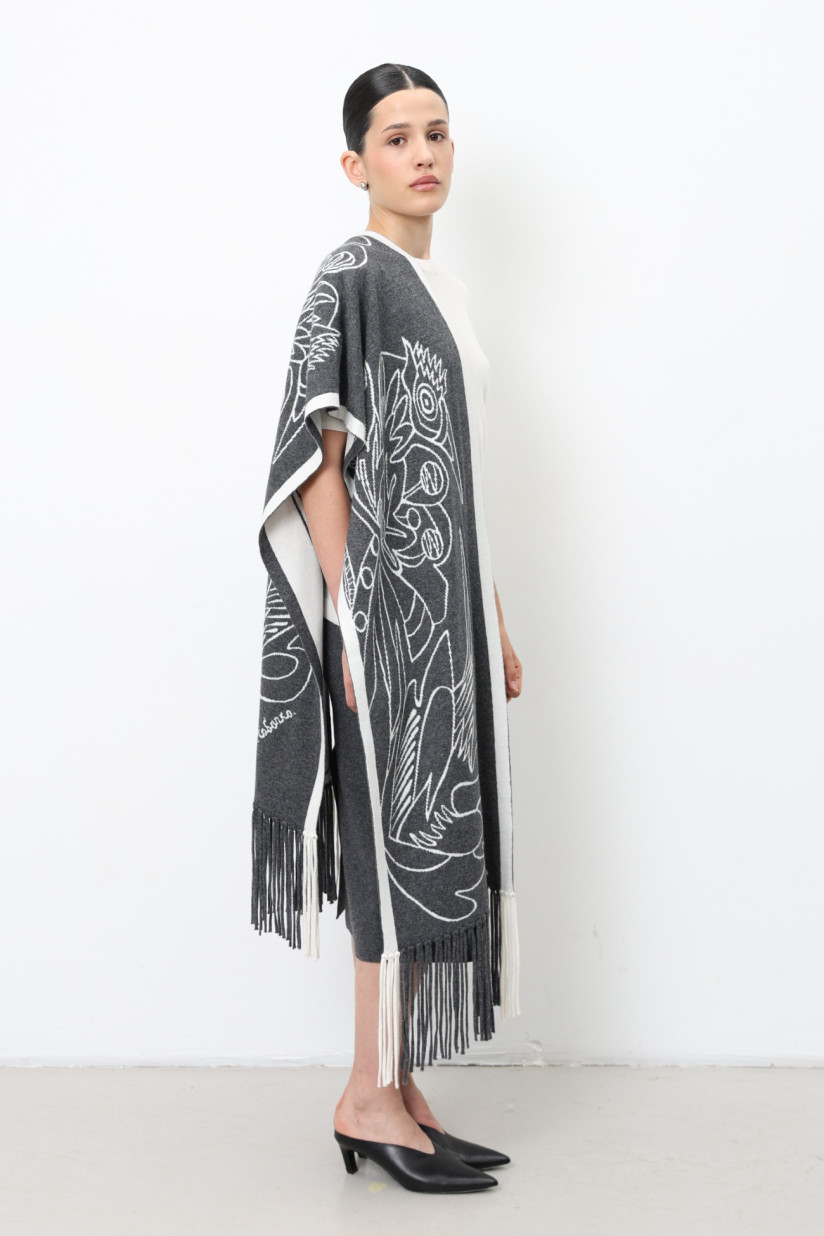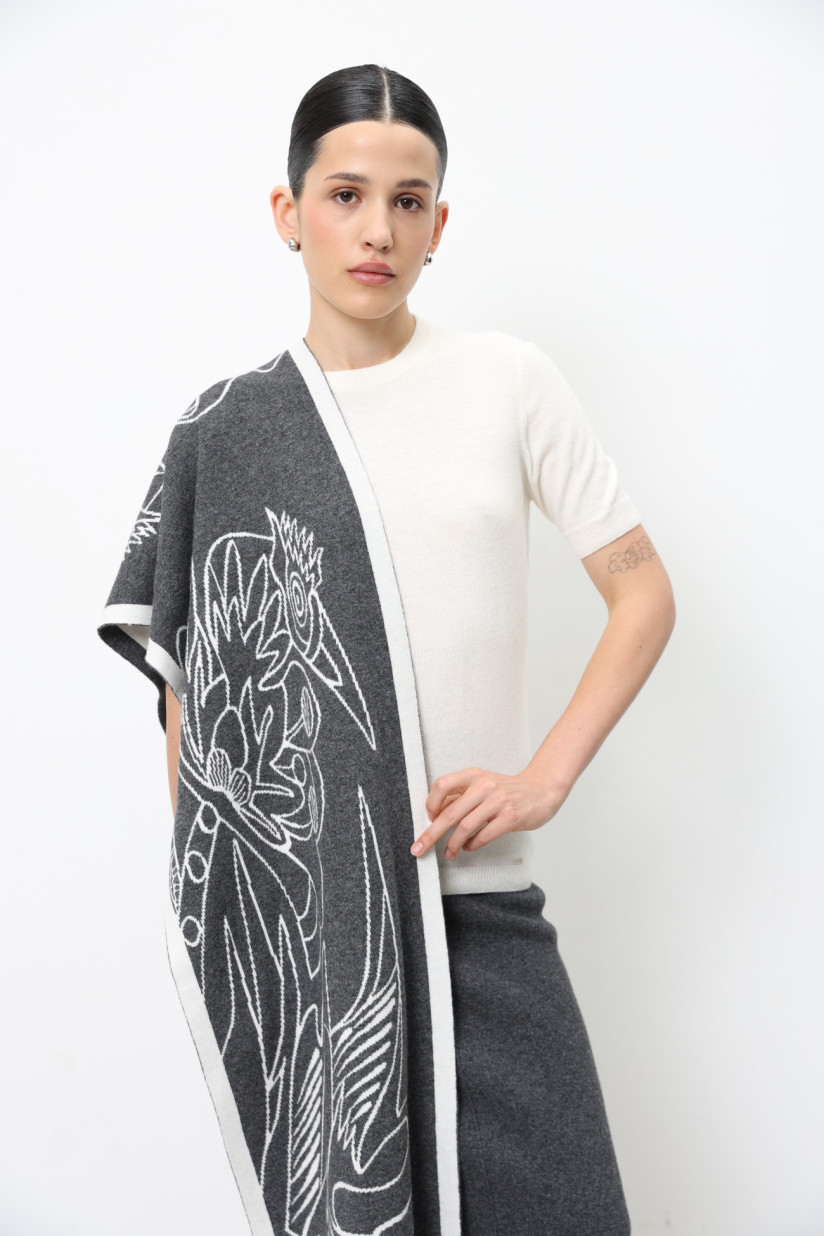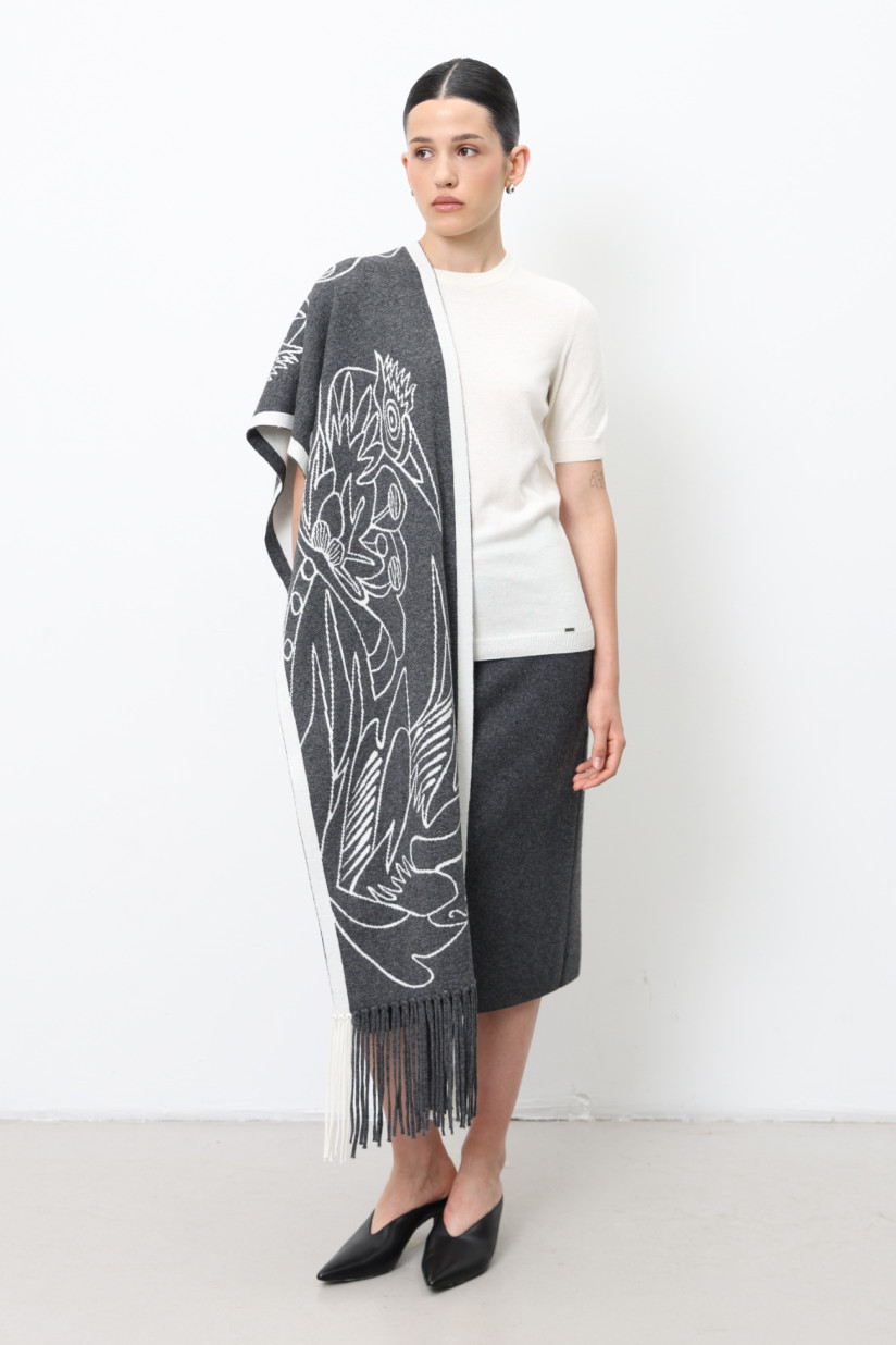 Палантин с мотивом «цветка с птичьим взглядом» — фрагмента работы Анны Собачко-Шостак «Осенние цветы». Рисунок перенесён на трикотаж в технике двустороннего жаккарда, благодаря чему изделие одинаково эффектно выглядит с обеих сторон. Кисти по низу продолжают цветовую гамму в виде бахромы, создавая динамику и декоративность. Выполнен из мягкой шерсти ягнят.