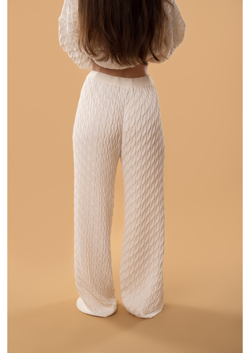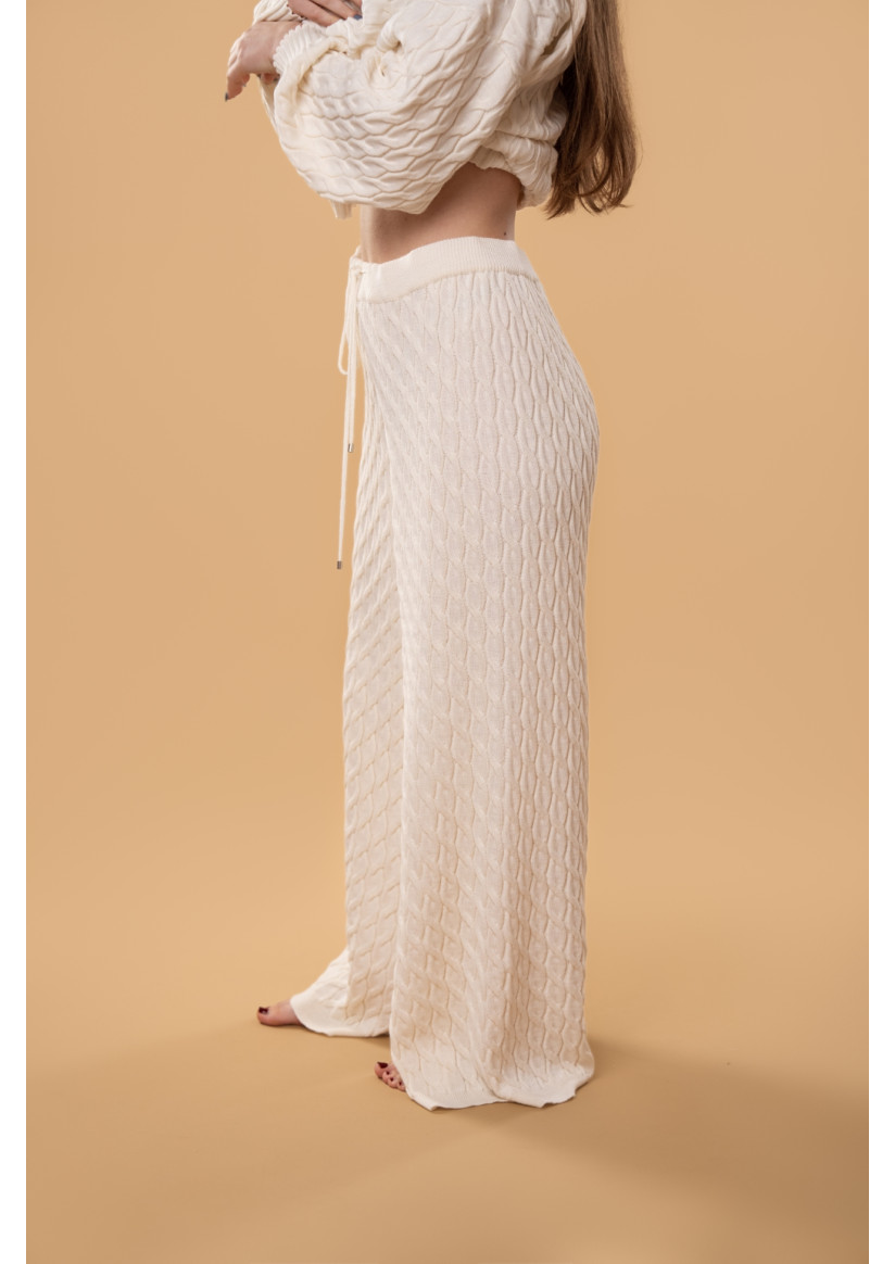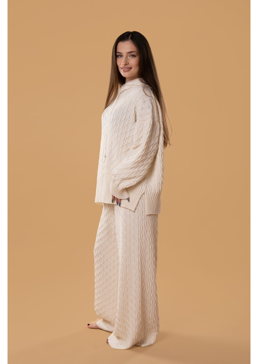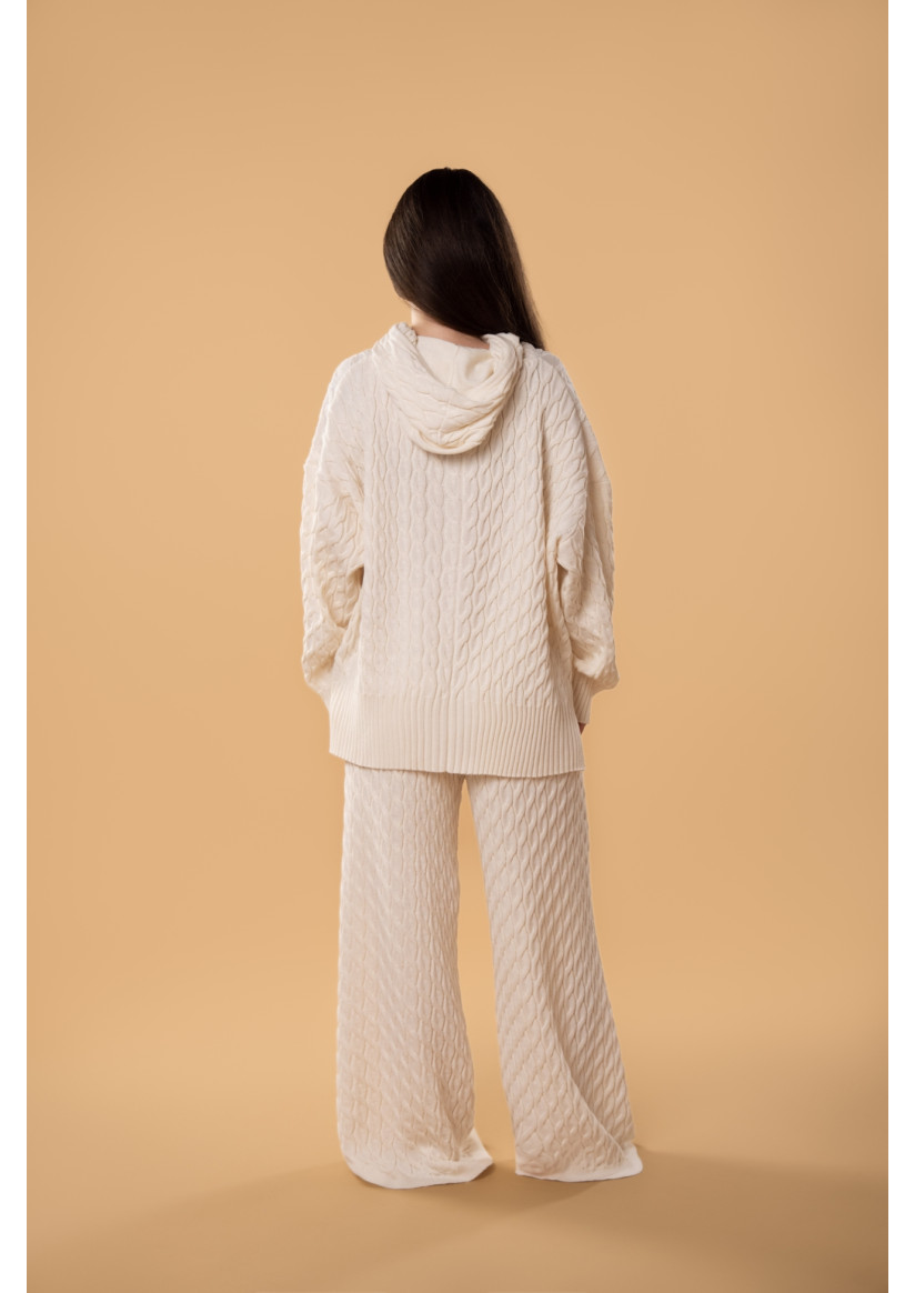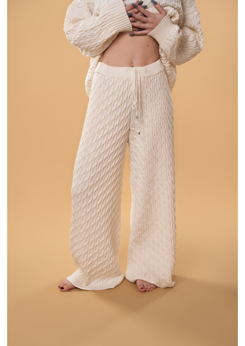 Штани вільного крою, розроблені у партнерстві з brabrabra, виконані з м’якої суміші з пряжі вовни та акрилу й забезпечують комфорт упродовж дня. Натуральні властивості вовни підтримують оптимальну терморегуляцію: зігрівають у прохолоду та дозволяють шкірі «дихати» за підвищеної температури. Плетіння «косами» візуально подовжує силует, надаючи моделі елегантного акценту. Широка еластична резинка зі шнурівкою та нижній манжет в рубчик із вільним краєм забезпечують свободу рухів.