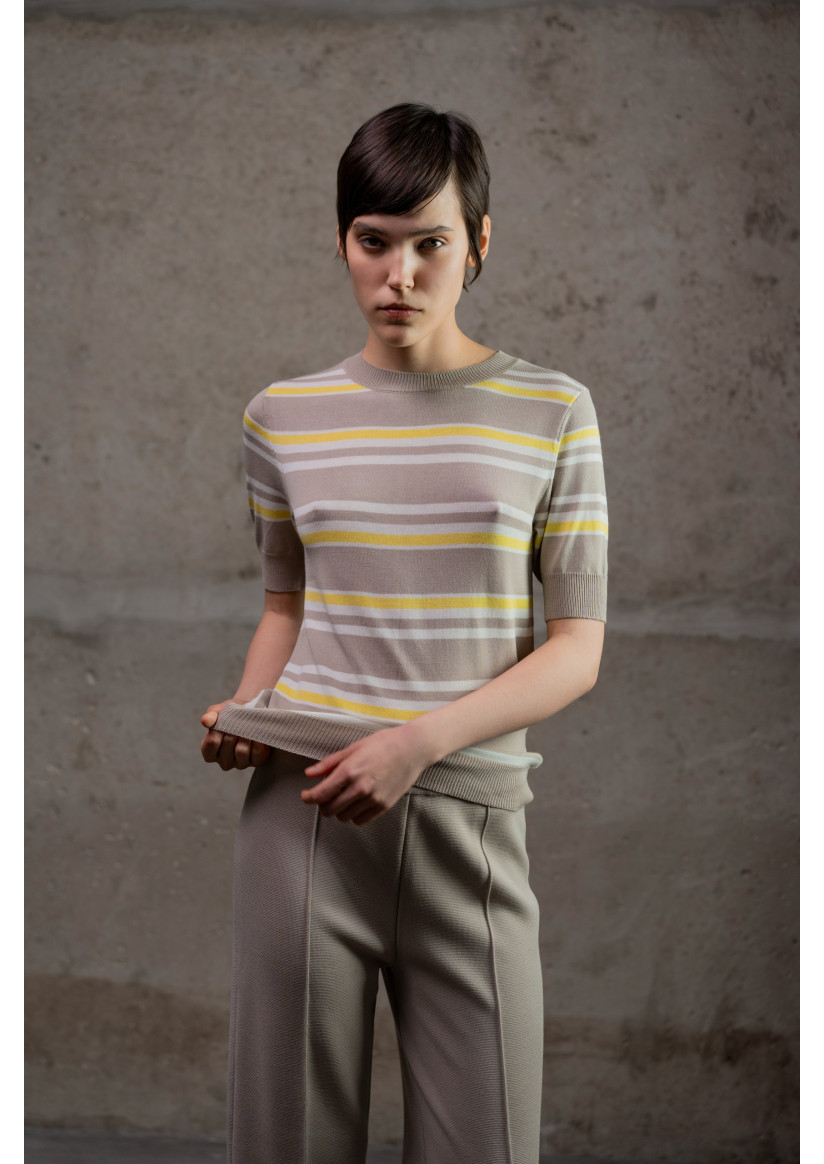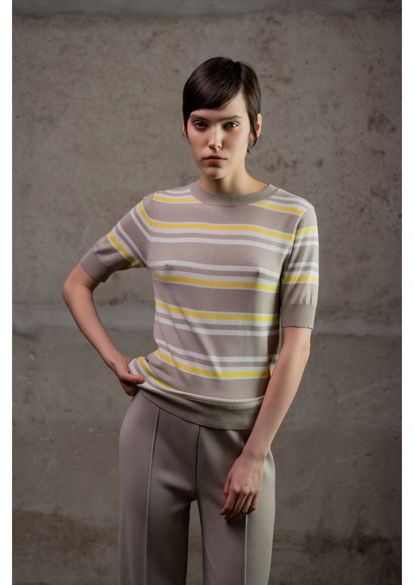 Прямий джемпер у міру вільного силуету — стильний базовий елемент гардеробу з графічним акцентом. Модель із круглим вирізом горловини, оздобленим тонкою бейкою, коротким втачним рукавом та довжиною до лінії стегон. Виготовлений з віскозної пряжі гладкого переплетіння з ритмічним чергуванням тонких та більш широких смуг контрастних кольорів, що створює динамічний та сучасний візуальний ефект.
