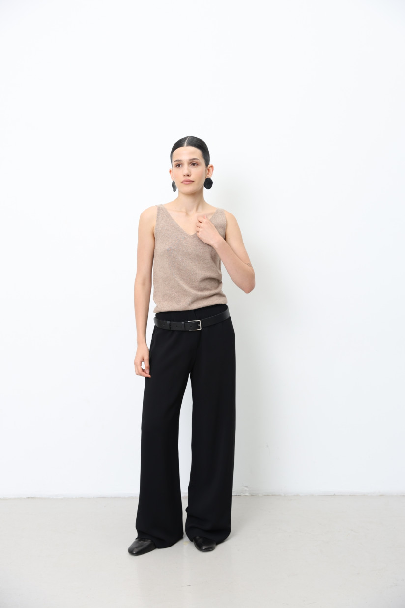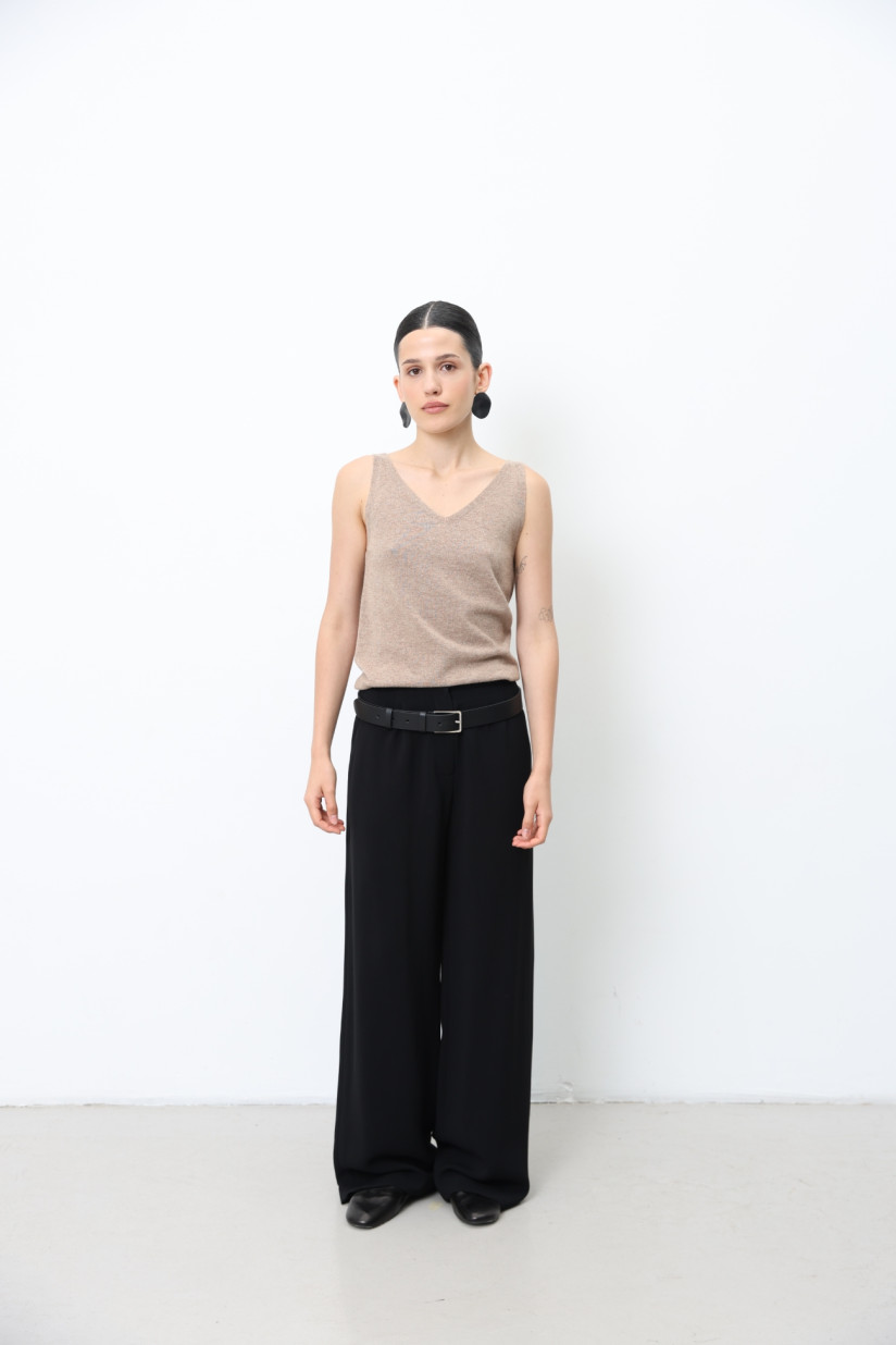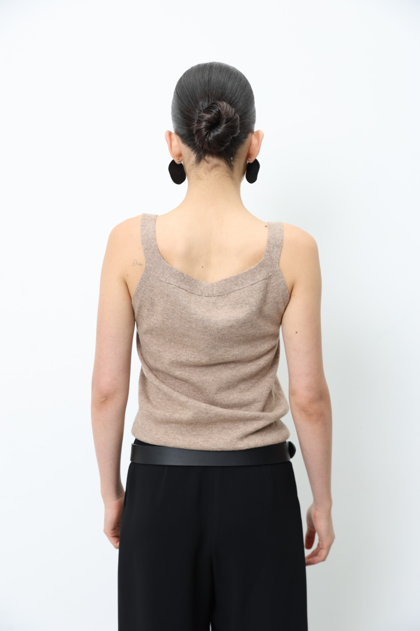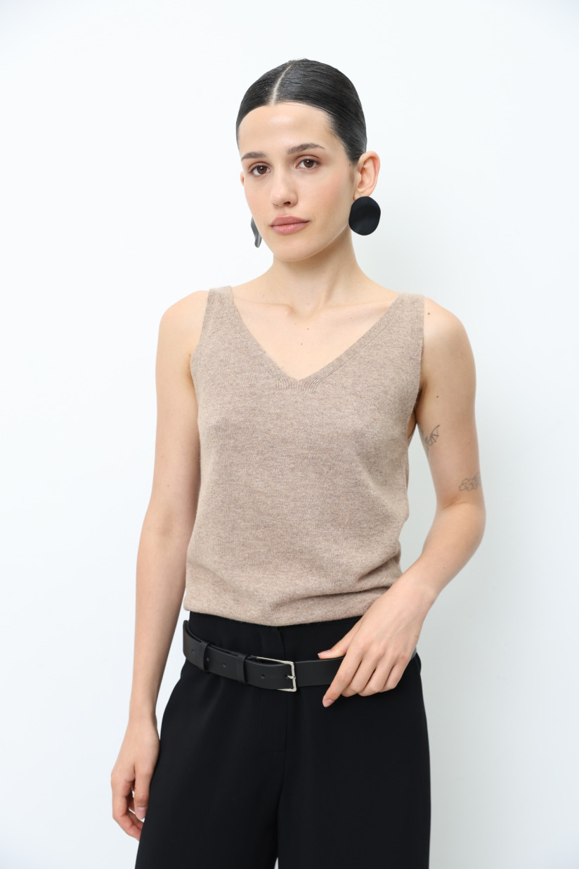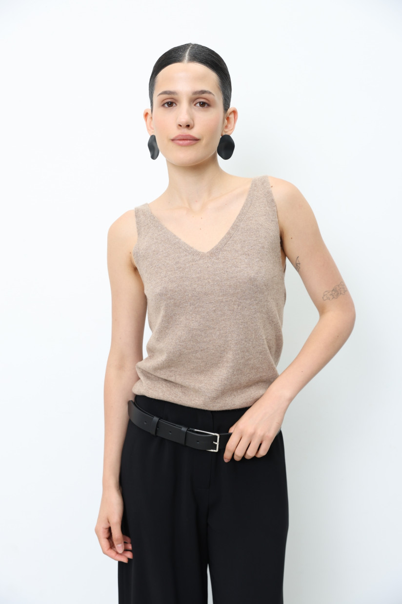 Трикотажний топ із вовни ягнят гладкого переплетіння з V-подібною горловиною. Прямий силует та довжина до лінії стегон створюють лаконічний та універсальний образ. Бретелі середньої ширини, а на спинці — м’яка округла горловина. Модель можна носити як самостійний топ або як жилет у багатошарових поєднаннях.
