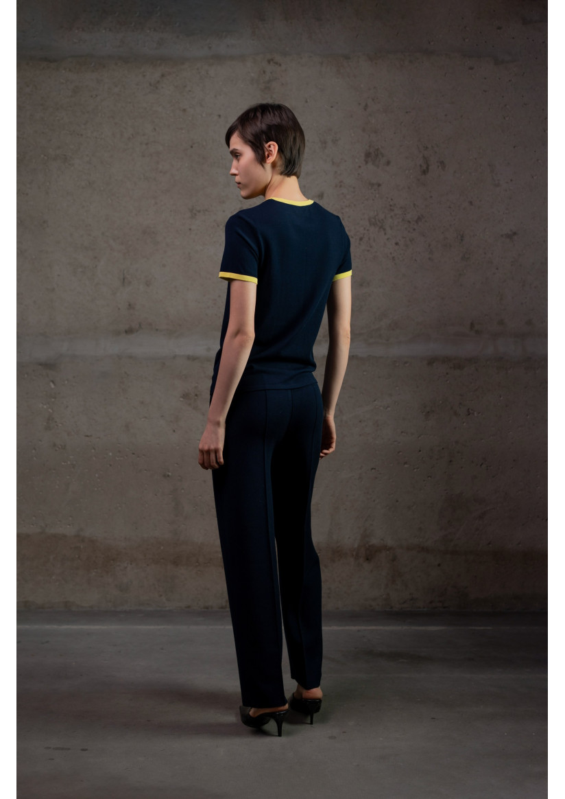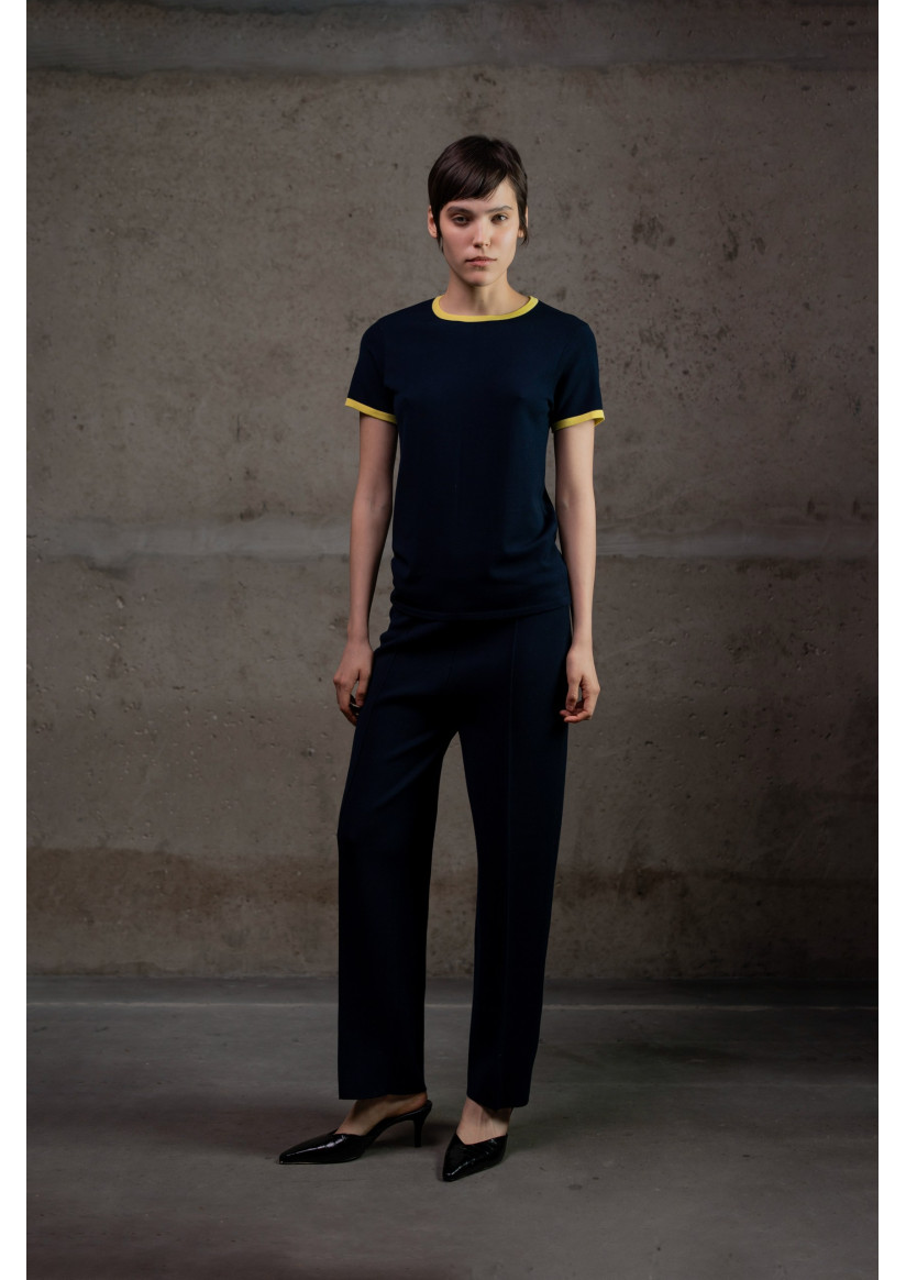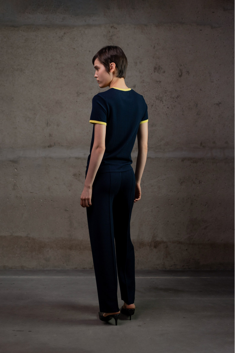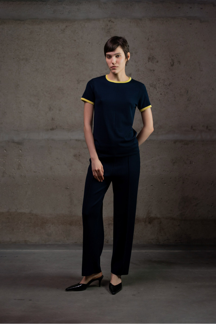 Трикотажні штани прямого крою повної довжини, виконані з тонкої віскозної пряжі. Модель має напівоблягаючий силует, що плавно переходить у прямі штанини, створюючи лаконічний і витягнутий силует. Середня посадка та еластичний пояс забезпечують комфортну посадку. Вив’язані тонкі об’ємні стрілки додають виробу графічності та підкреслюють вертикальні лінії. Модель виконана з тонкої віскозної пряжі у гладкому щільному переплетенні.