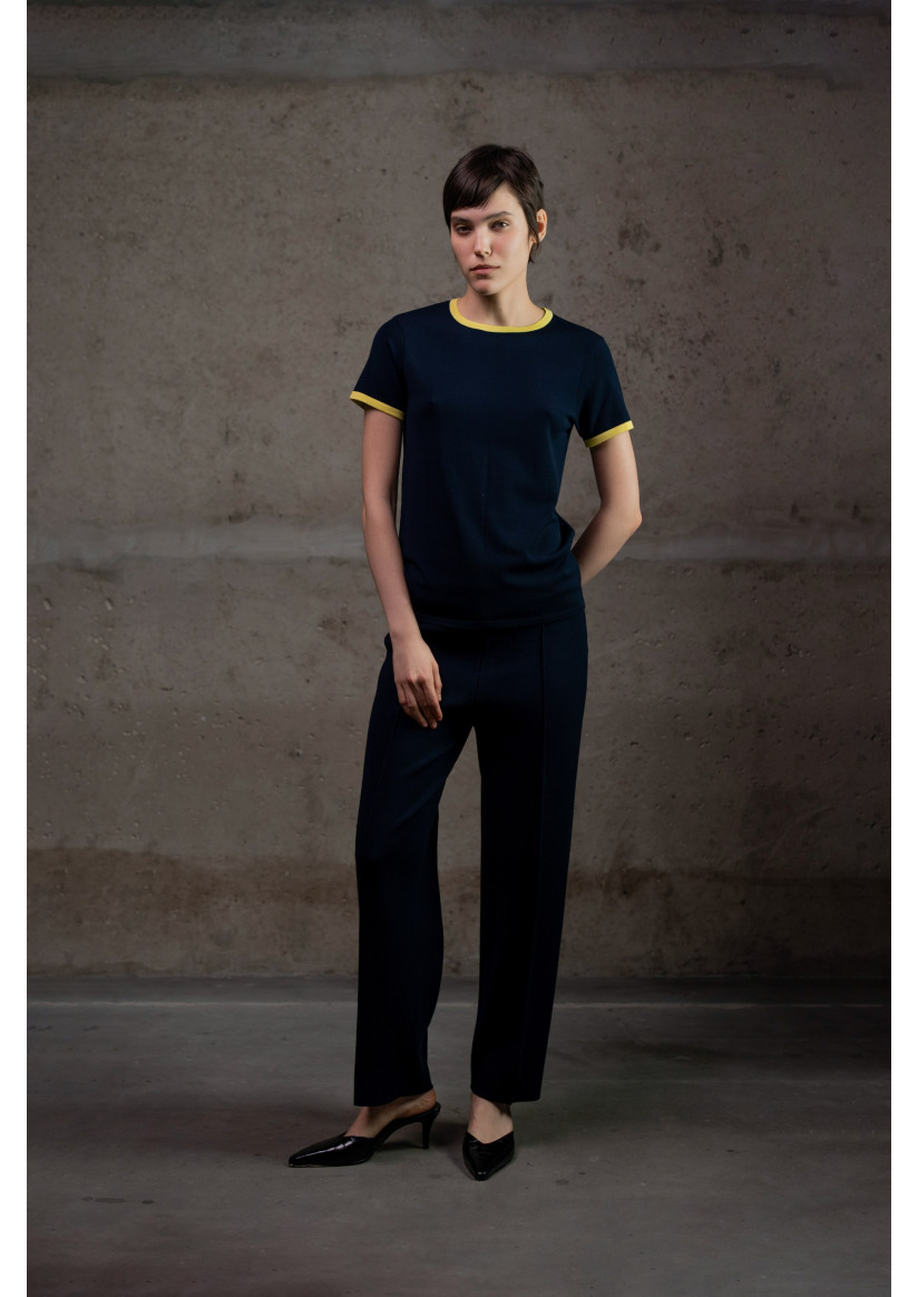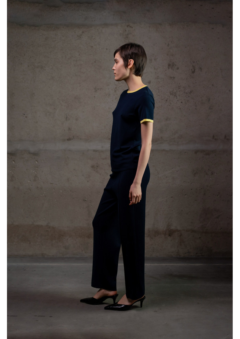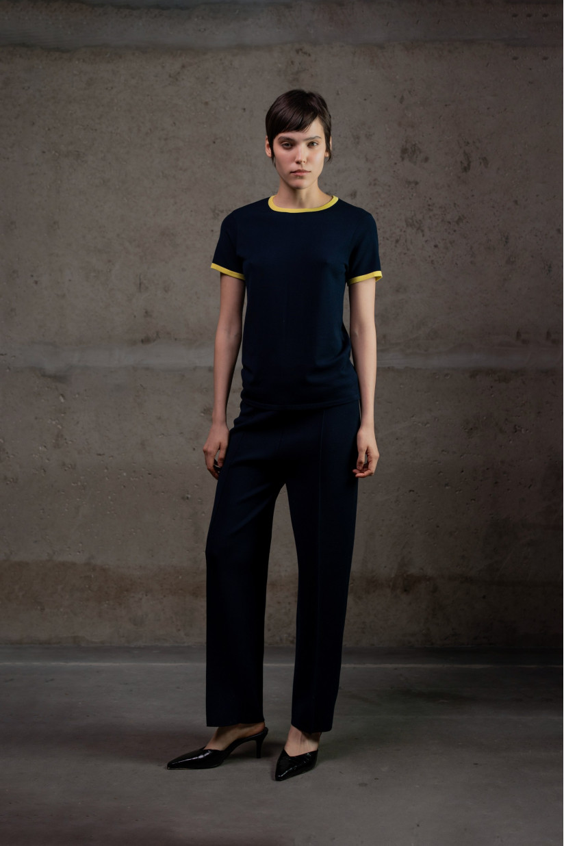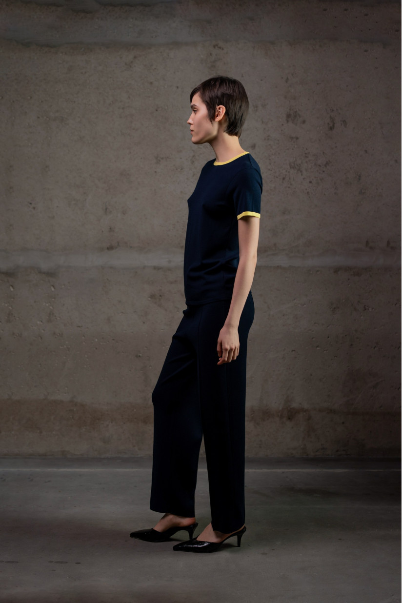 Трикотажні штани прямого крою повної довжини, виконані з тонкої віскозної пряжі. Модель має напівоблягаючий силует, що плавно переходить у прямі штанини, створюючи лаконічний і витягнутий силует. Середня посадка та еластичний пояс забезпечують комфортну посадку. Вив’язані тонкі об’ємні стрілки додають виробу графічності та підкреслюють вертикальні лінії. Модель виконана з тонкої віскозної пряжі у гладкому щільному переплетенні.