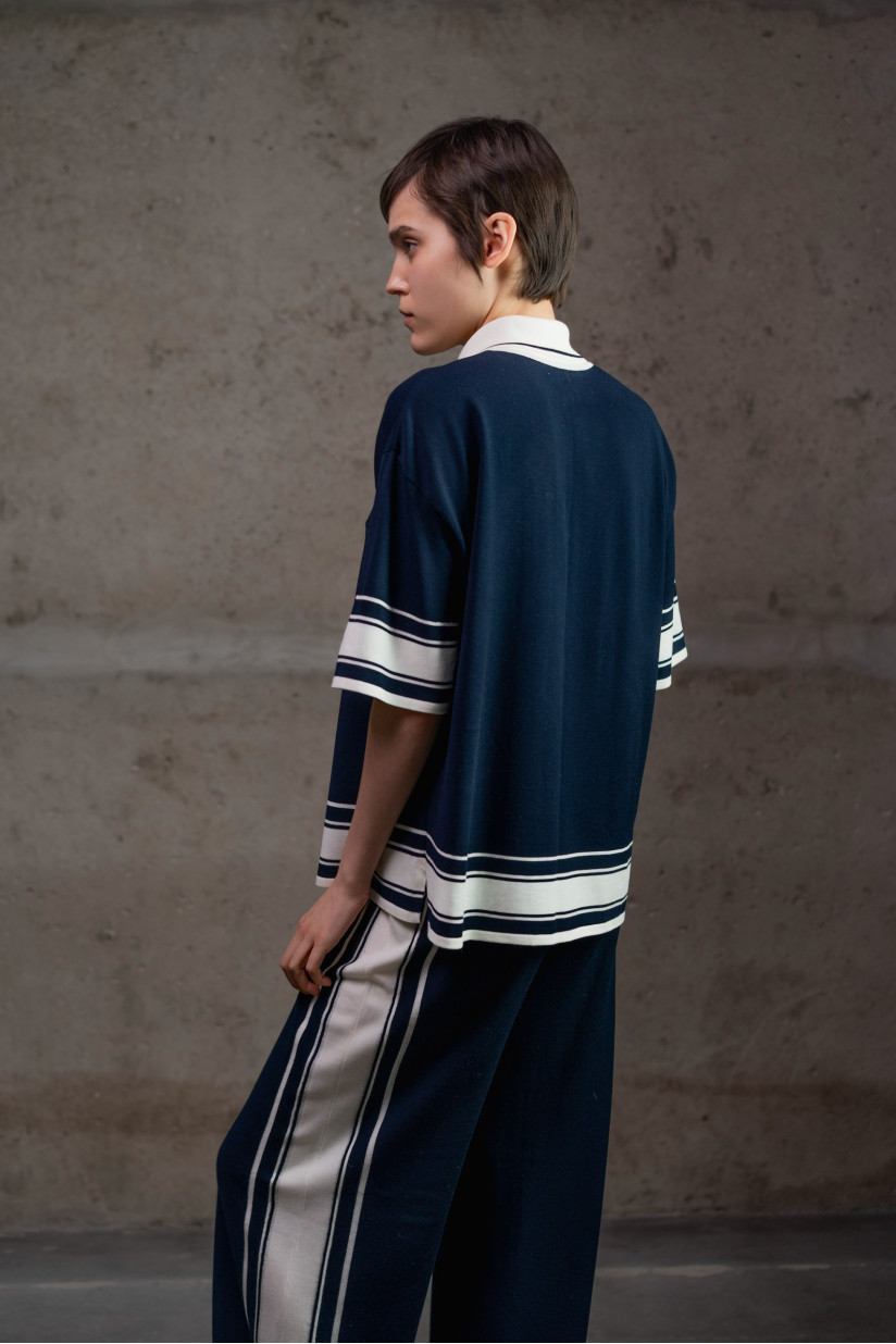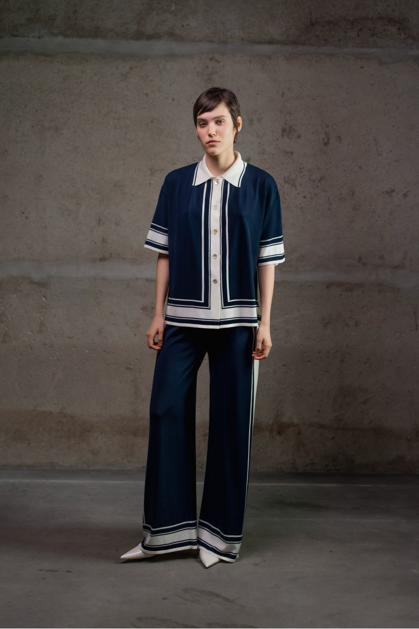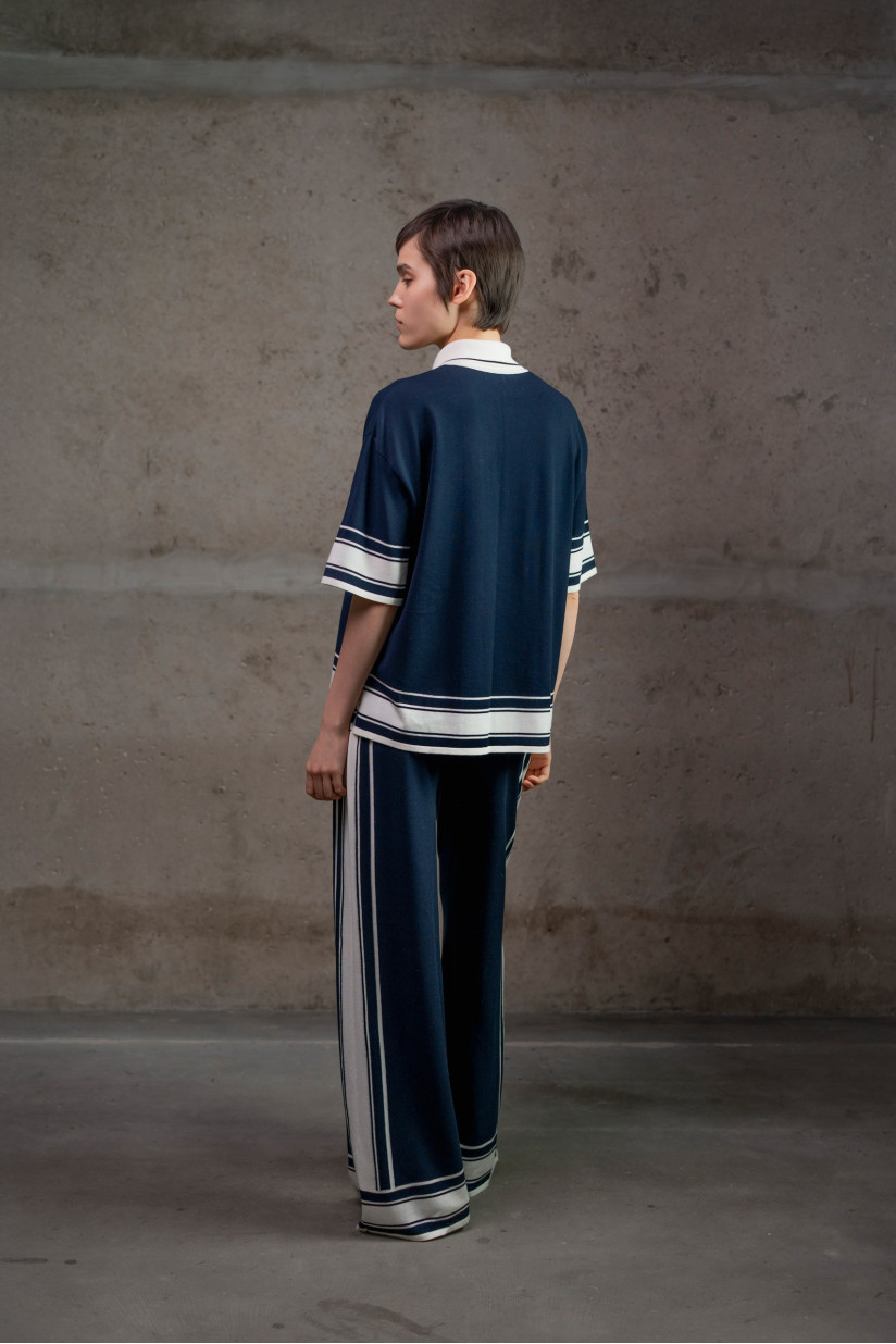 Трикотажні брюки повної довжини з тонкої віскозної пряжі. Модель має вільний, прямий силует із легким розширенням донизу, що створює м’яку та елегантну лінію. Висока посадка та еластичний пояс без застібок забезпечують комфортну посадку. Широкі штанини м’яко спадають уздовж ноги, формуючи витягнутий силует. Модель виконана у гладкому переплетенні та оздоблена бічними лампасами у вигляді смуг різної ширини та кольору, що додають виробу графічного акценту.