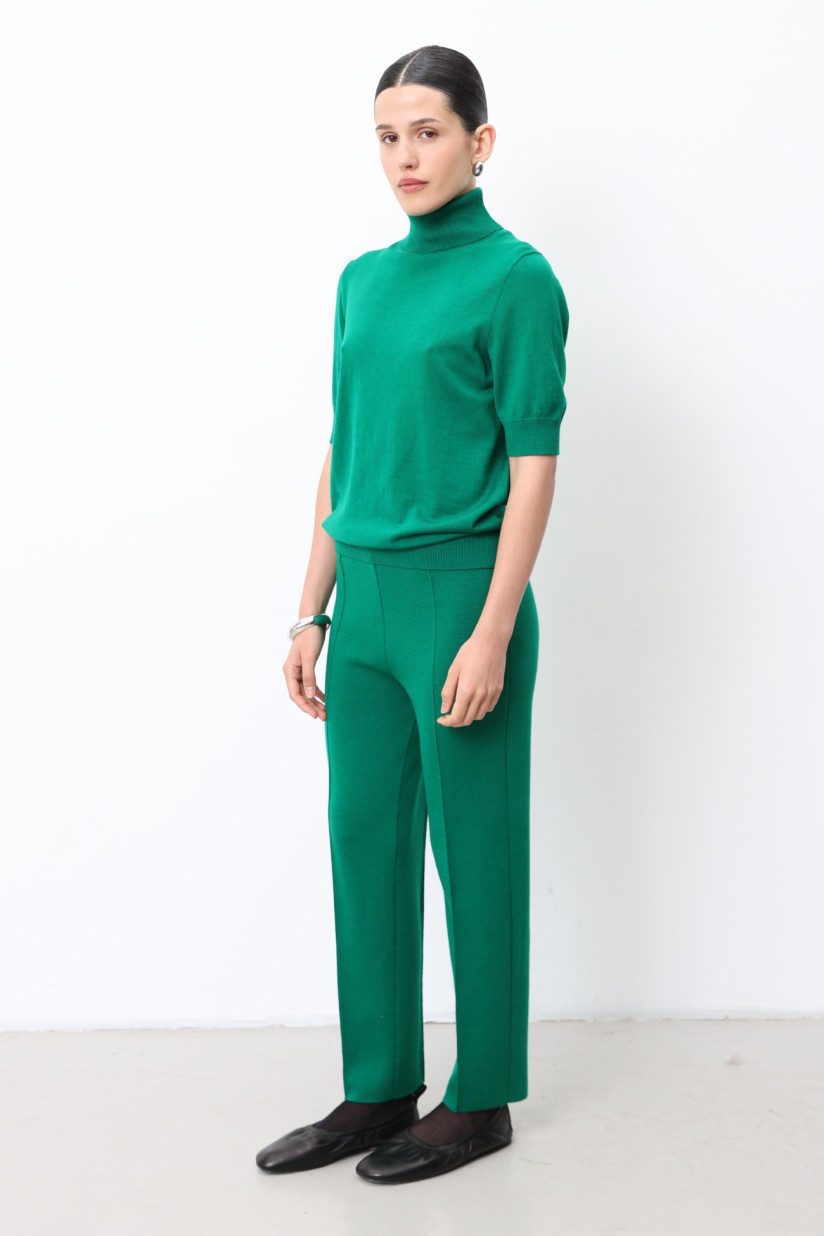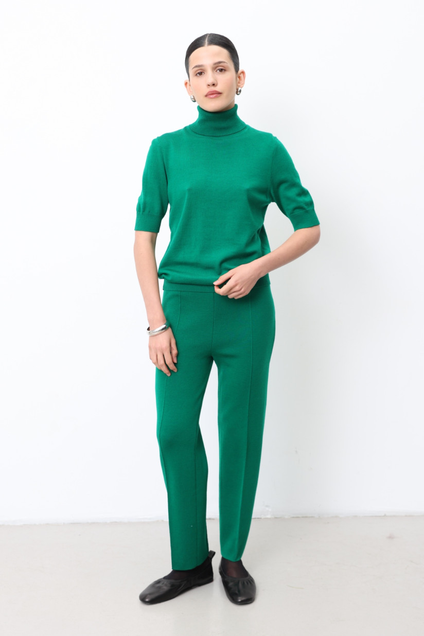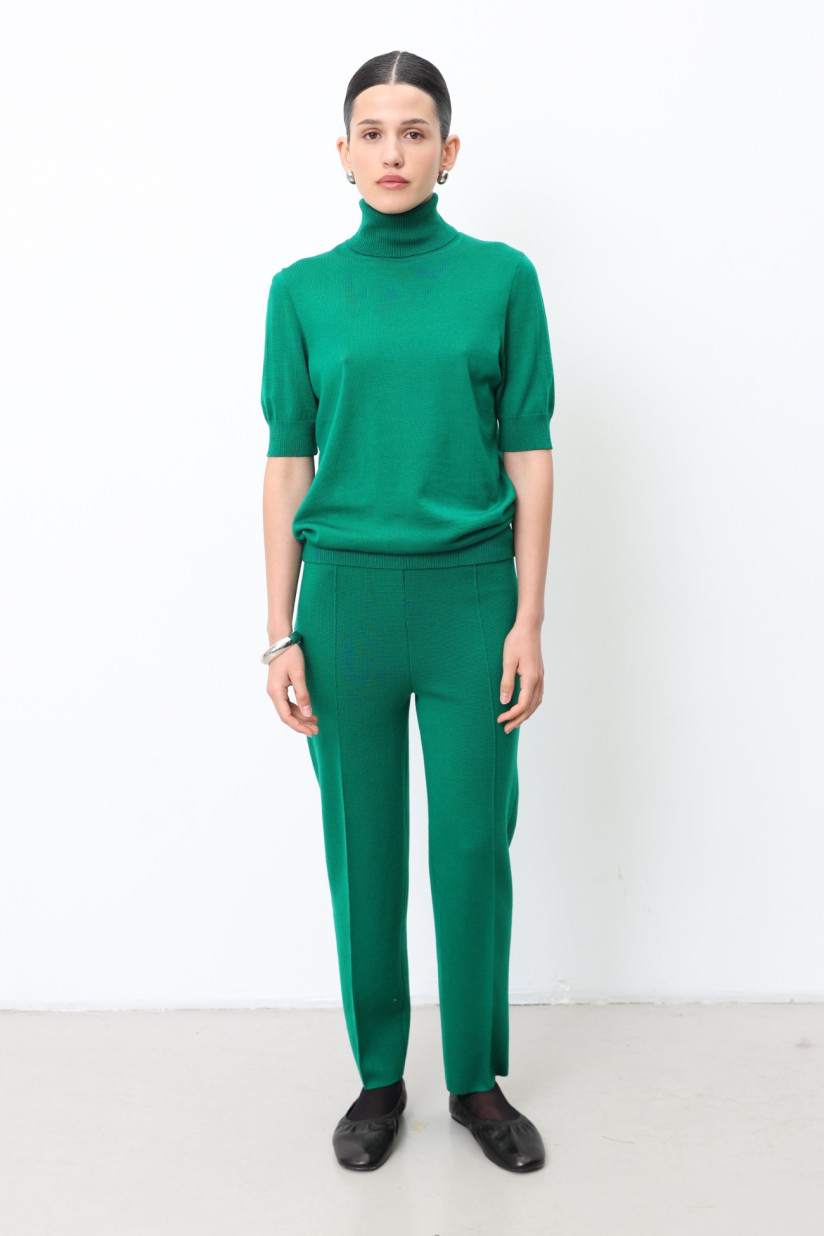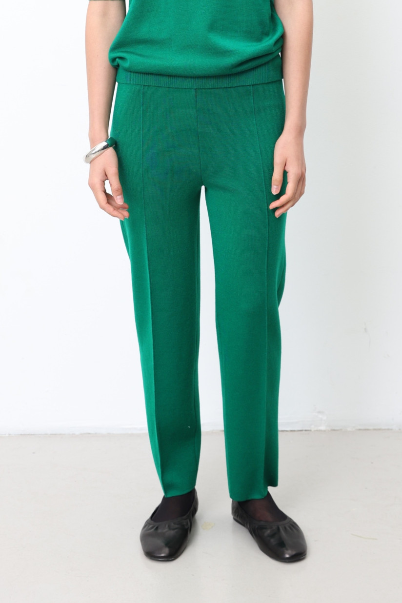 Трикотажні штани з 100% вовни мериноса щільного гладкого переплетіння. Силует прямий, злегка звужений донизу, з вишуканими тонкими об’ємними стрілками. Повна довжина, висока посадка на еластичному поясі.