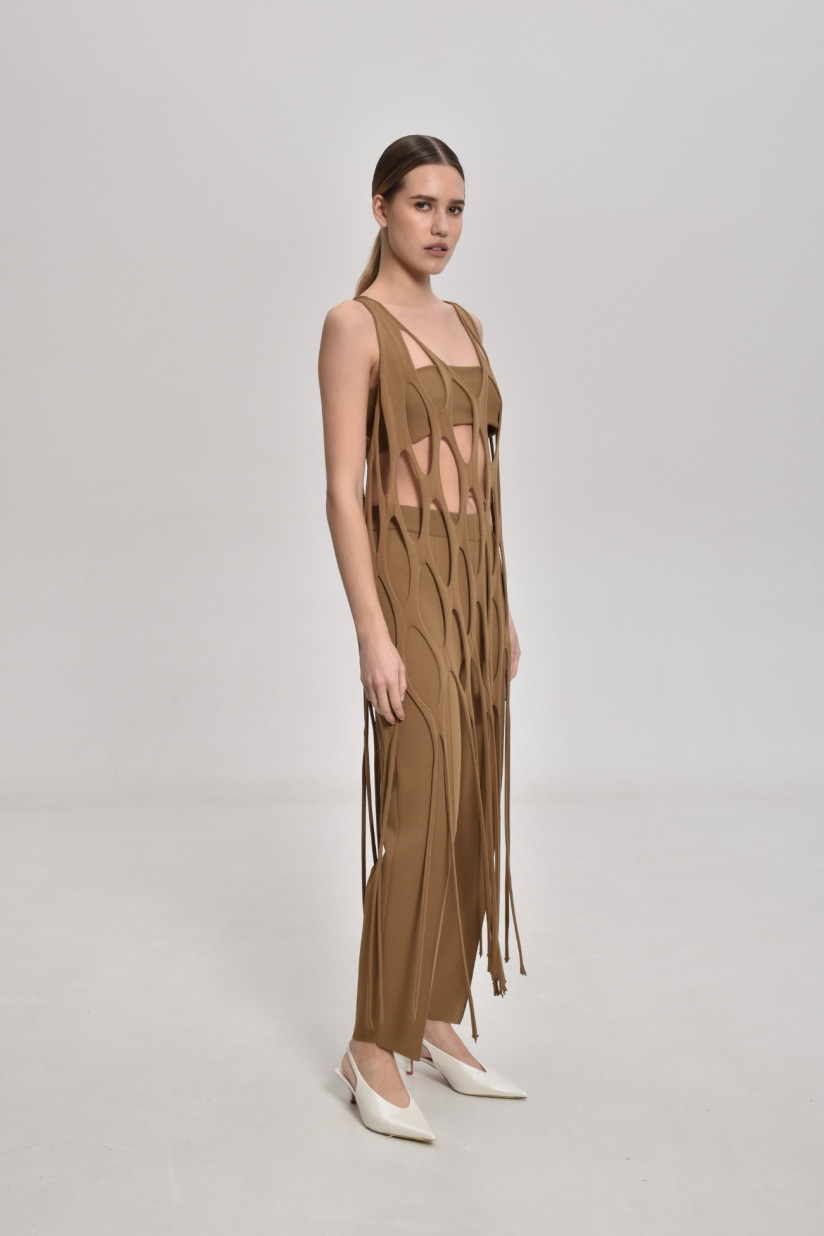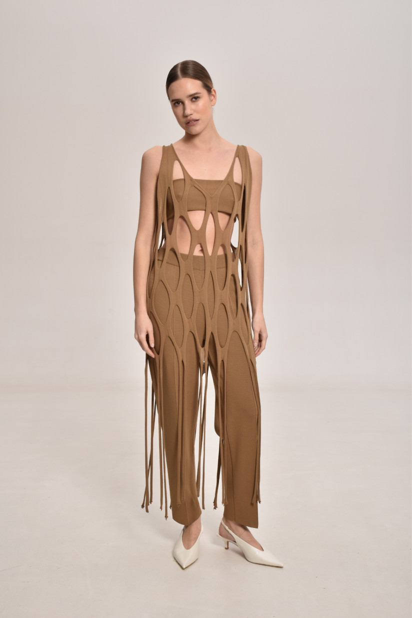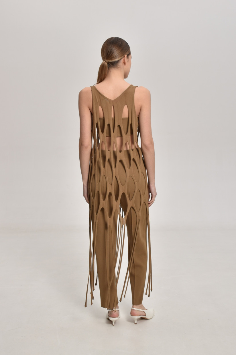 Туніка-накидка без рукавів з глибоким V-подібним вирізом, що підкреслює лінію декольте, виготовлена з віскози. Оригінальна, крупна сітчаста текстура та витончені китиці, що спадають від середини стегна до середини гомілки, створюють граціозний рух у такт кожному кроку, надаючи динаміки силуету.